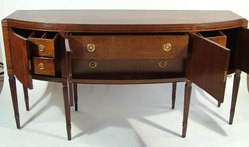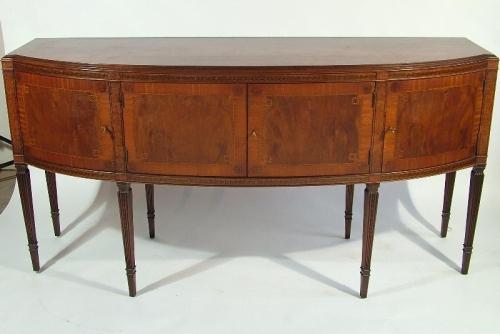 English (Sheraton 19th Century) style Crotch Mahogany Demi-Lune sideboard with fiddle-grain satinwood and mahogany borders. Boxwood and ebony inlay with rosettes of pear wood and are found in the corners. Four doors; three large middle drawers, and three small side drawers, 38 1/2" tall by 24 1/2" wide by 78" long.