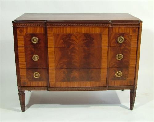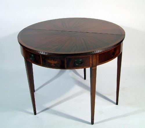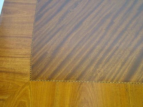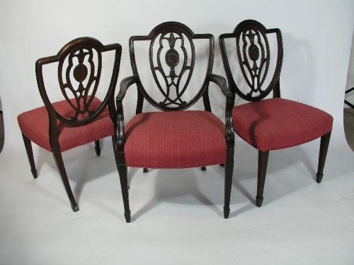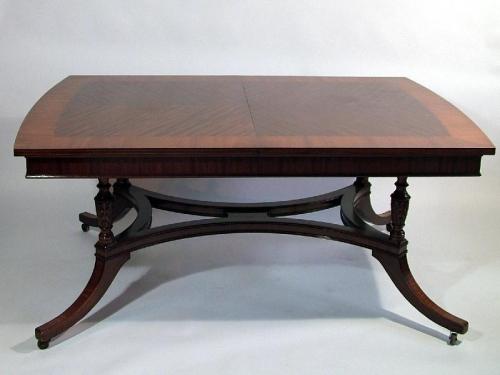 Antique English (Sheraton 19th Century) Style Crotch Mahogany with fiddle-grain satinwood borders. The legs are faced with satinwood and having mahogany borders. Five panels have boxwood and ebony inlay with rosettes of pearwood and are found in the corners. Five leafs included. 30 1/2" tall by 45" wide by 63" long (without panels). Eight Crotch Mahogany, open-arm, Damask Upholstered, Tall Back chairs,