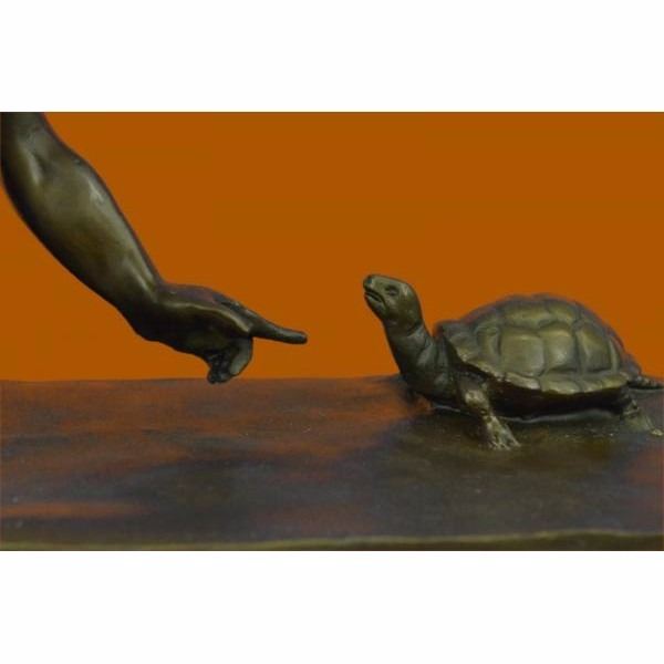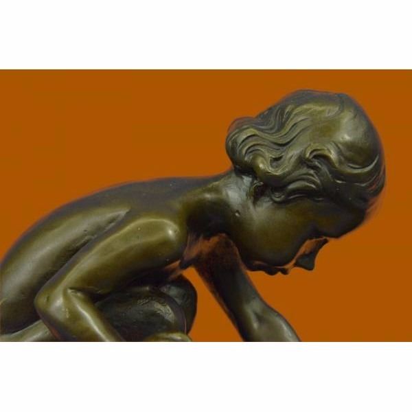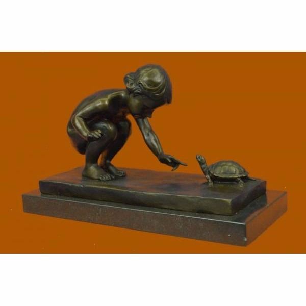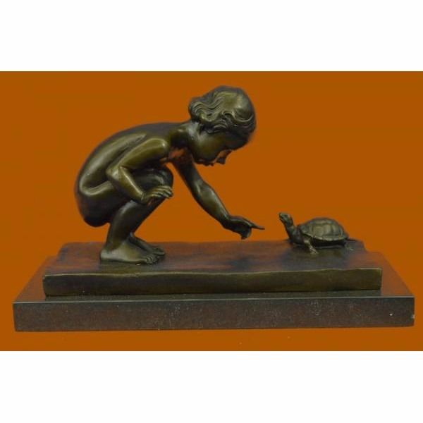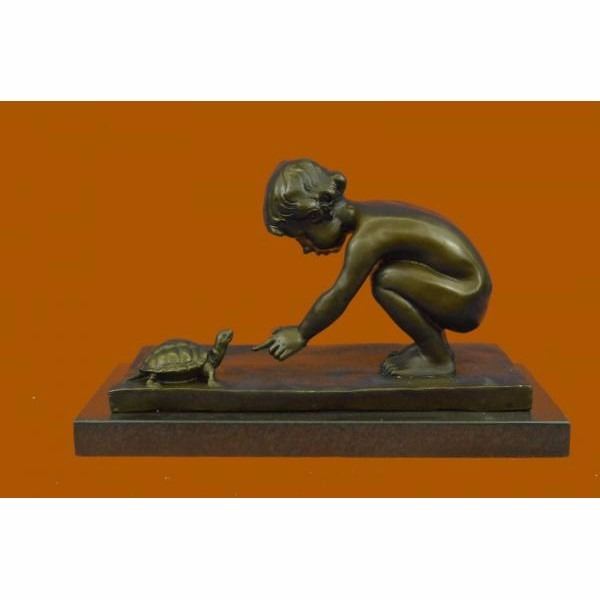 Here is a sweet styled Art Deco bronze on marble base, created by the famous artist Aldo Vitaleh. It displays a little schoolgirl that is playing with a friendly turtle. The little sculpture is standing on square marble base and was designed by the well known artist. This figure is made of finest bronze material and was casted in our foundry in an amazing agreement to the original. Artist Aldo Vitaleh signed the sculpture. This true detailed museum bronze cast is a focal point in every exhibition! It can be called an absolute eye-catcher for friends of bronze sculptures. Condition: This sculpture is in perfect condition. Bronze Dimensions with Marble Base:Height 8.5" x Width 14" Marble Dimensions: 14" X 6" Height without base: 7.5" Weight : 19 LBS Inventory : 59YRD10816595