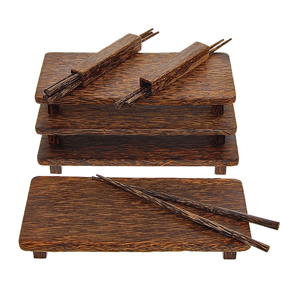Beautifully handcrafted set of 4 sushi plates and 8 chopsticks; 8" x 5"