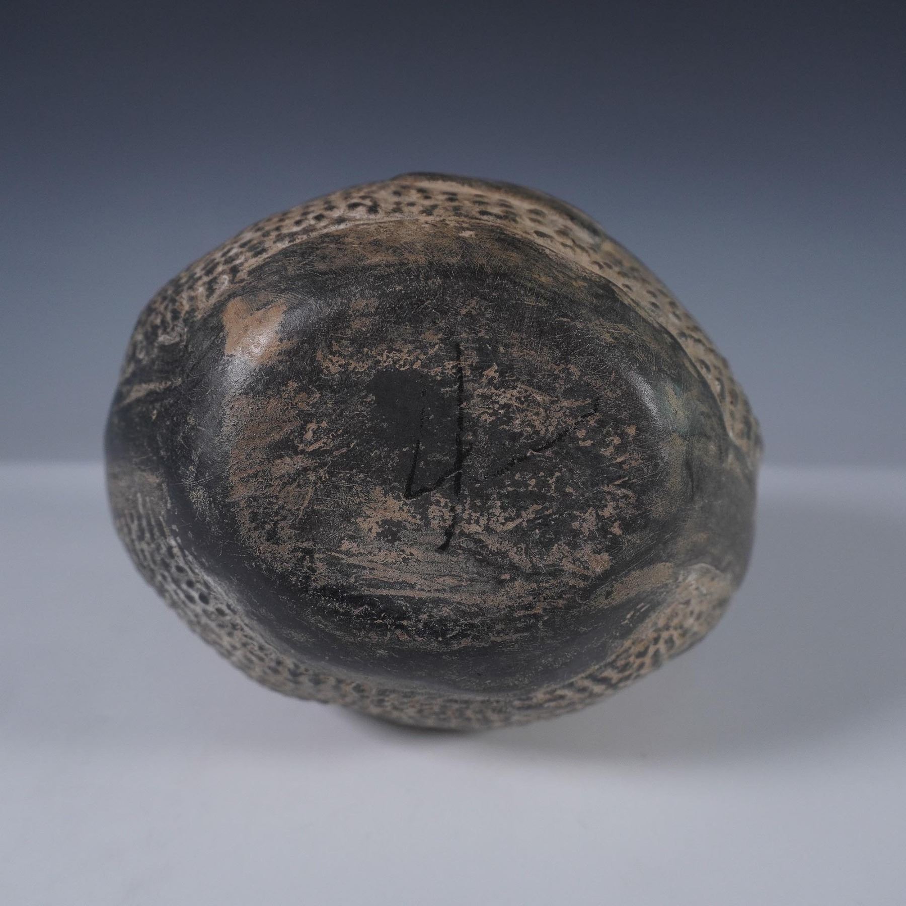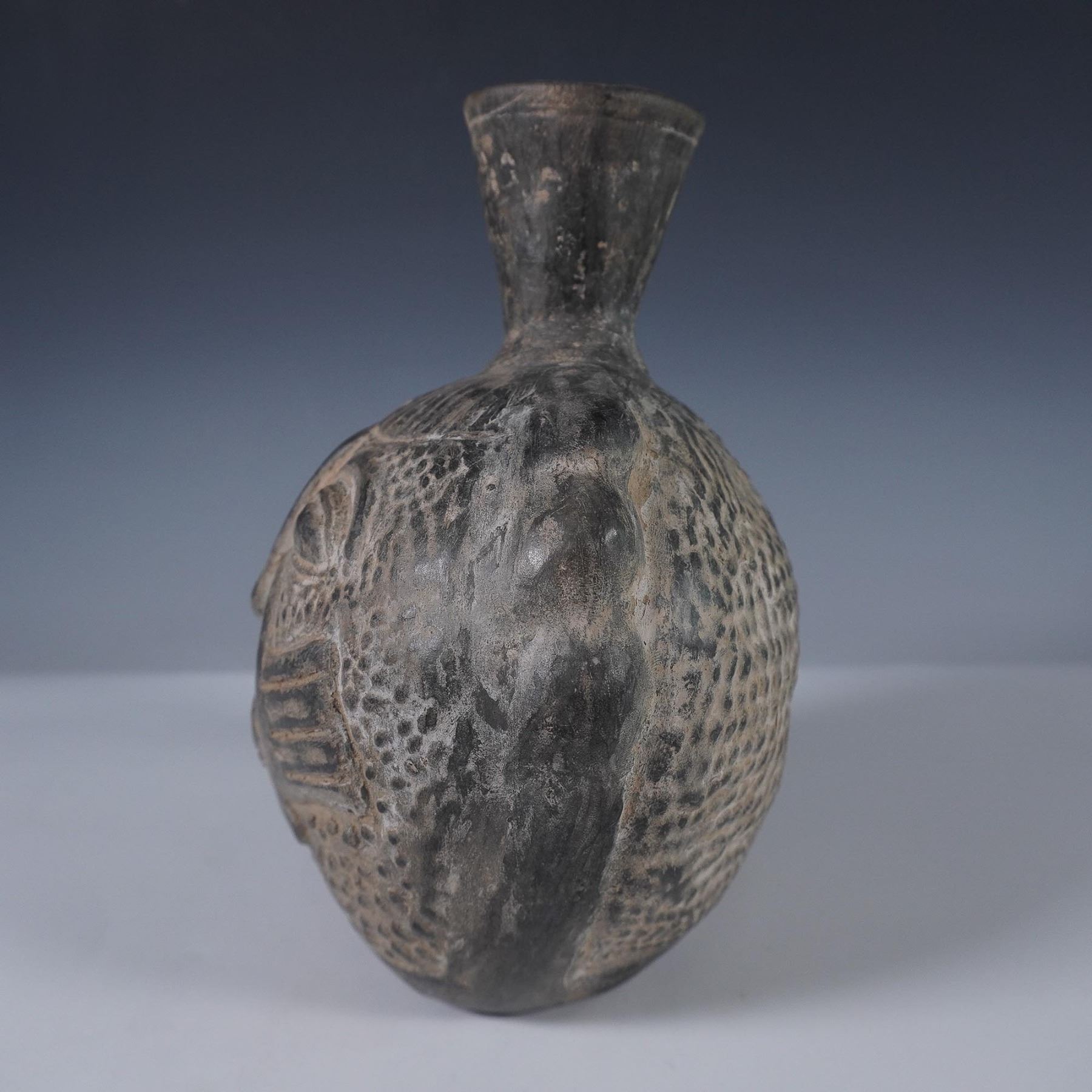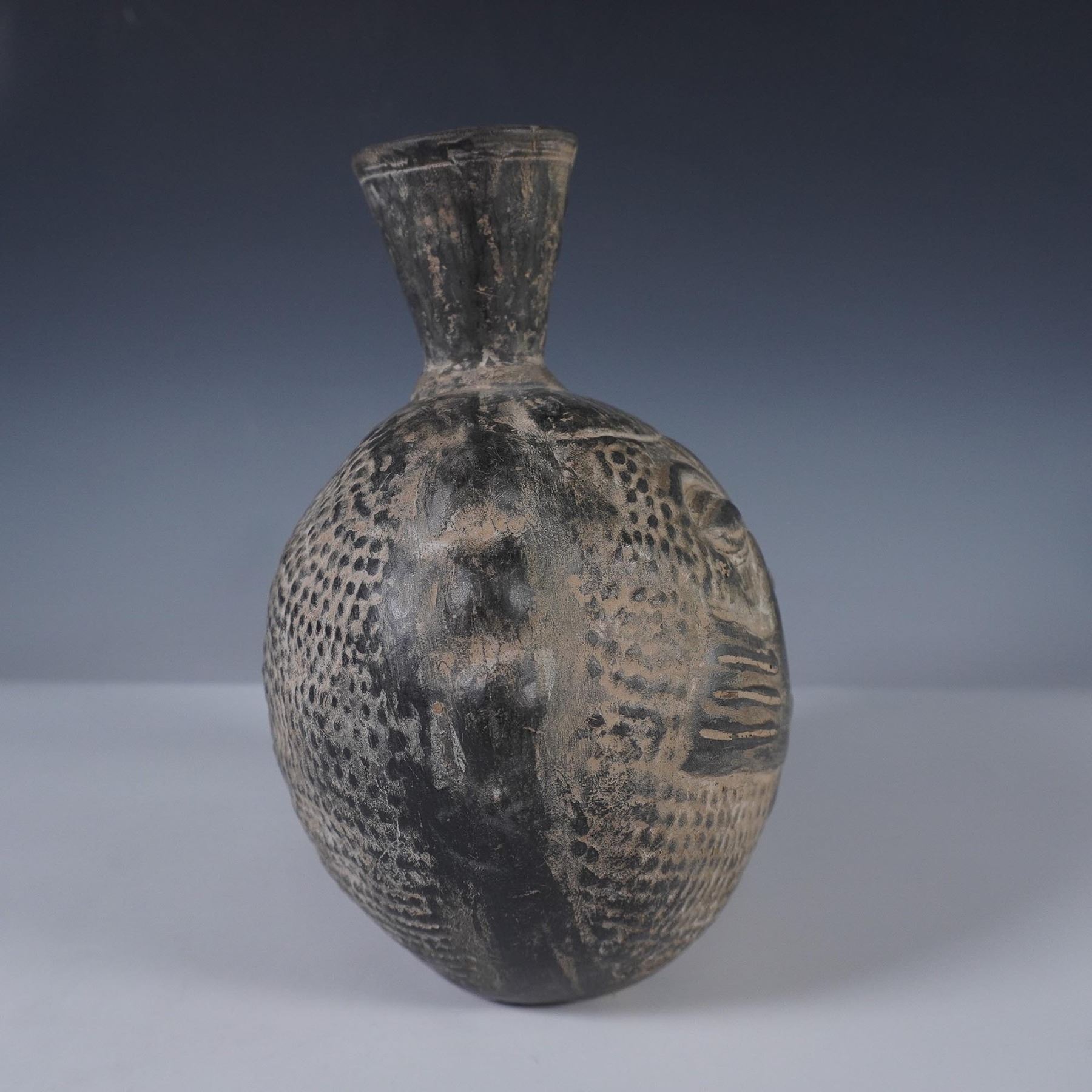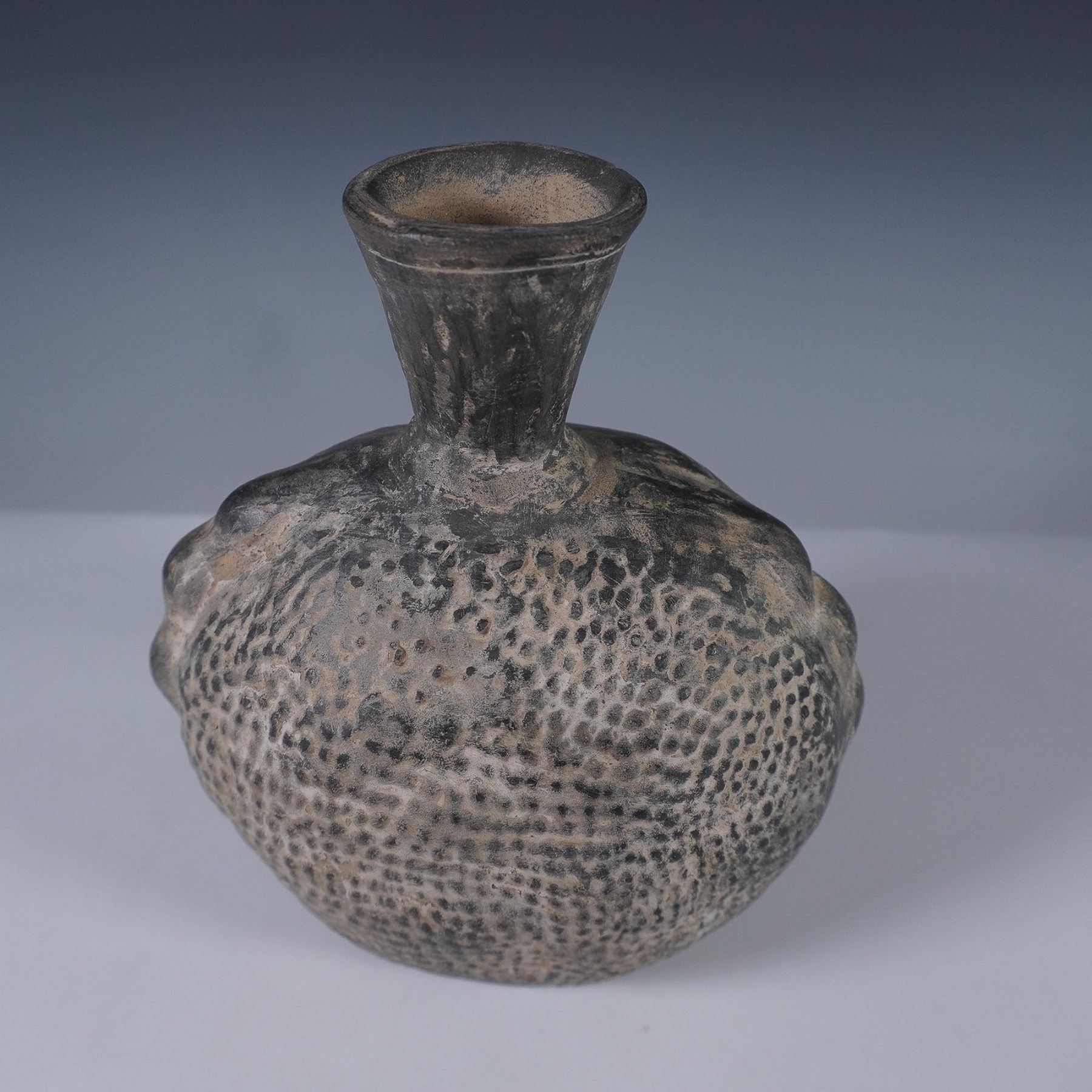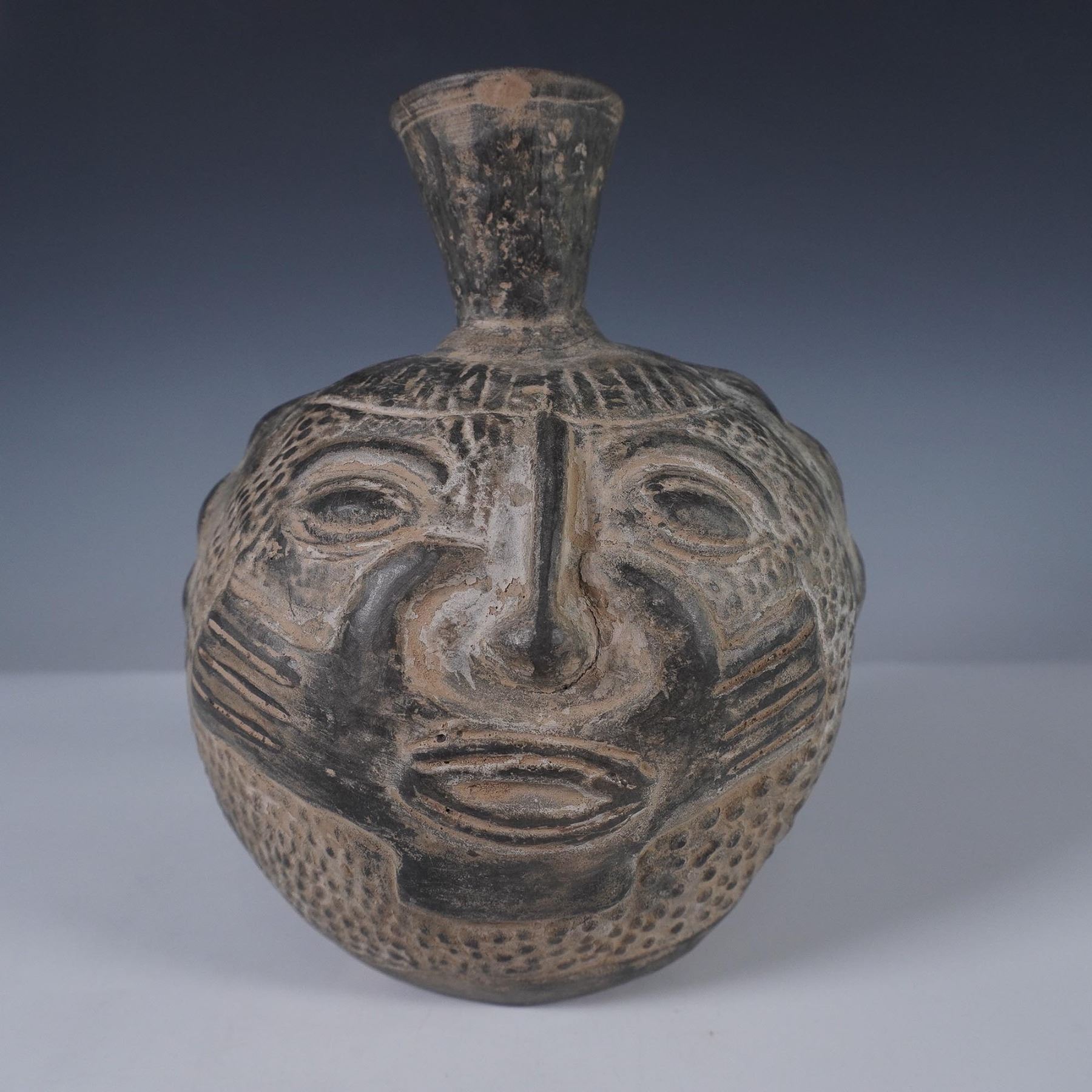Striking hand formed pottery vessel featuring a stylized human face and raised textured detailing throughout. The facial features are sculpted in high relief, including bold eyes, nose, and mouth, while the body of the vessel is adorned with raised dot patterns, giving it a tactile, organic surface. Finished in smoky earth tones with a burnished appearance, the piece has a narrow flared neck rising from a rounded base. A powerful example of tribal-inspired or folk art pottery, showcasing expressive form and surface texture.