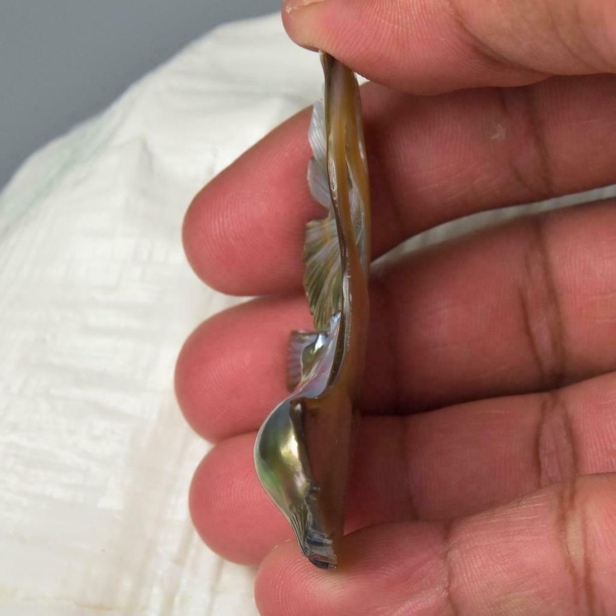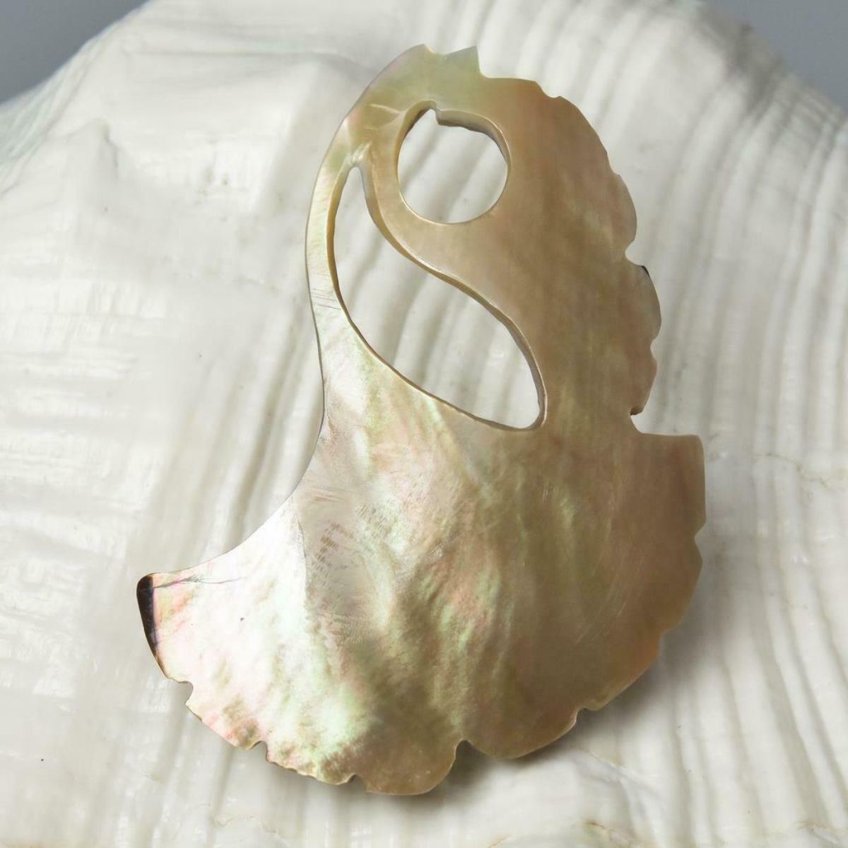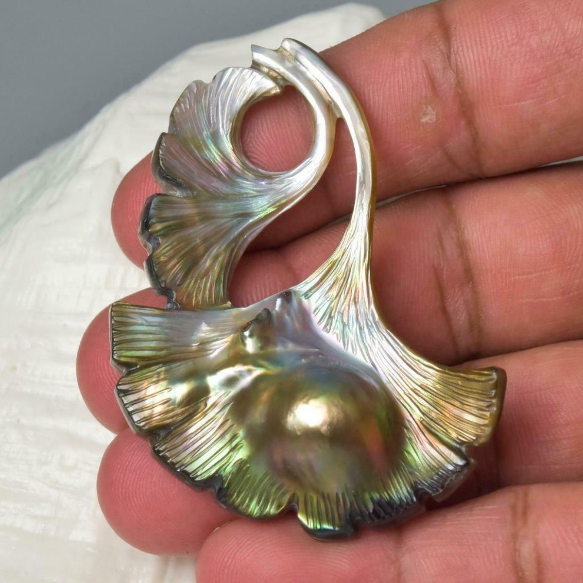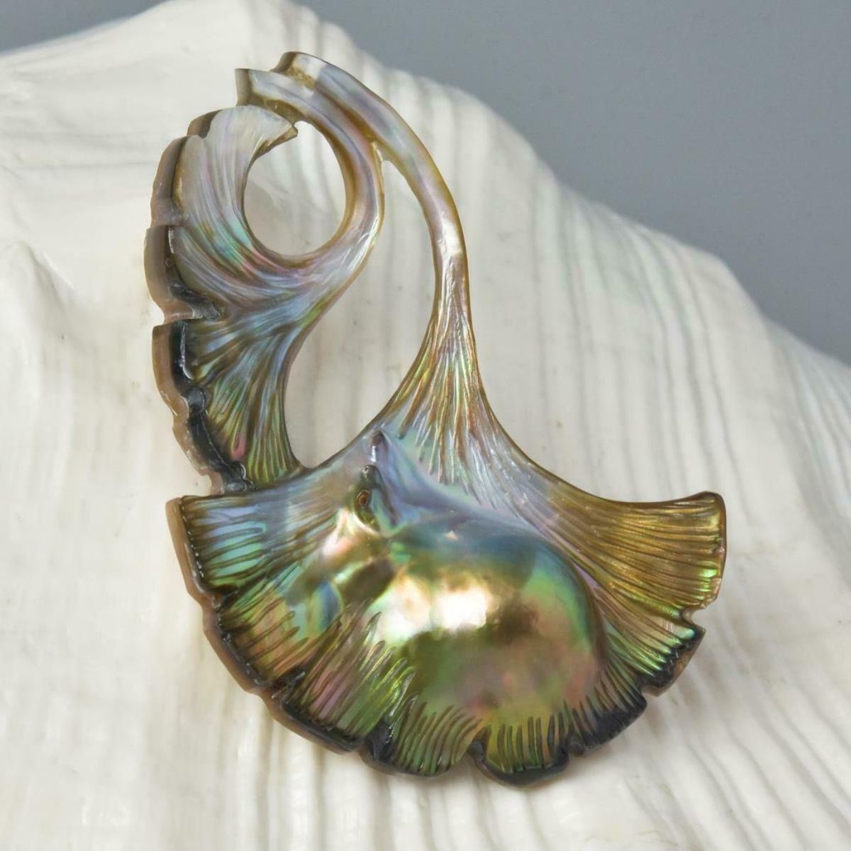 Polished iridescent Gingko leaf pendant, hand-carved by Indonesian artisan from a pteria brown-lipped wing pearl oyster mabe shell. 11.17 grams.  Large size 2 1/2" H X  2" W.Â