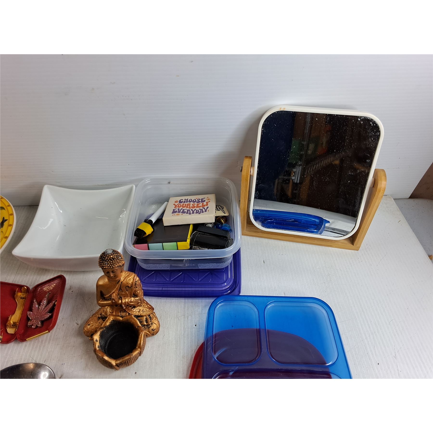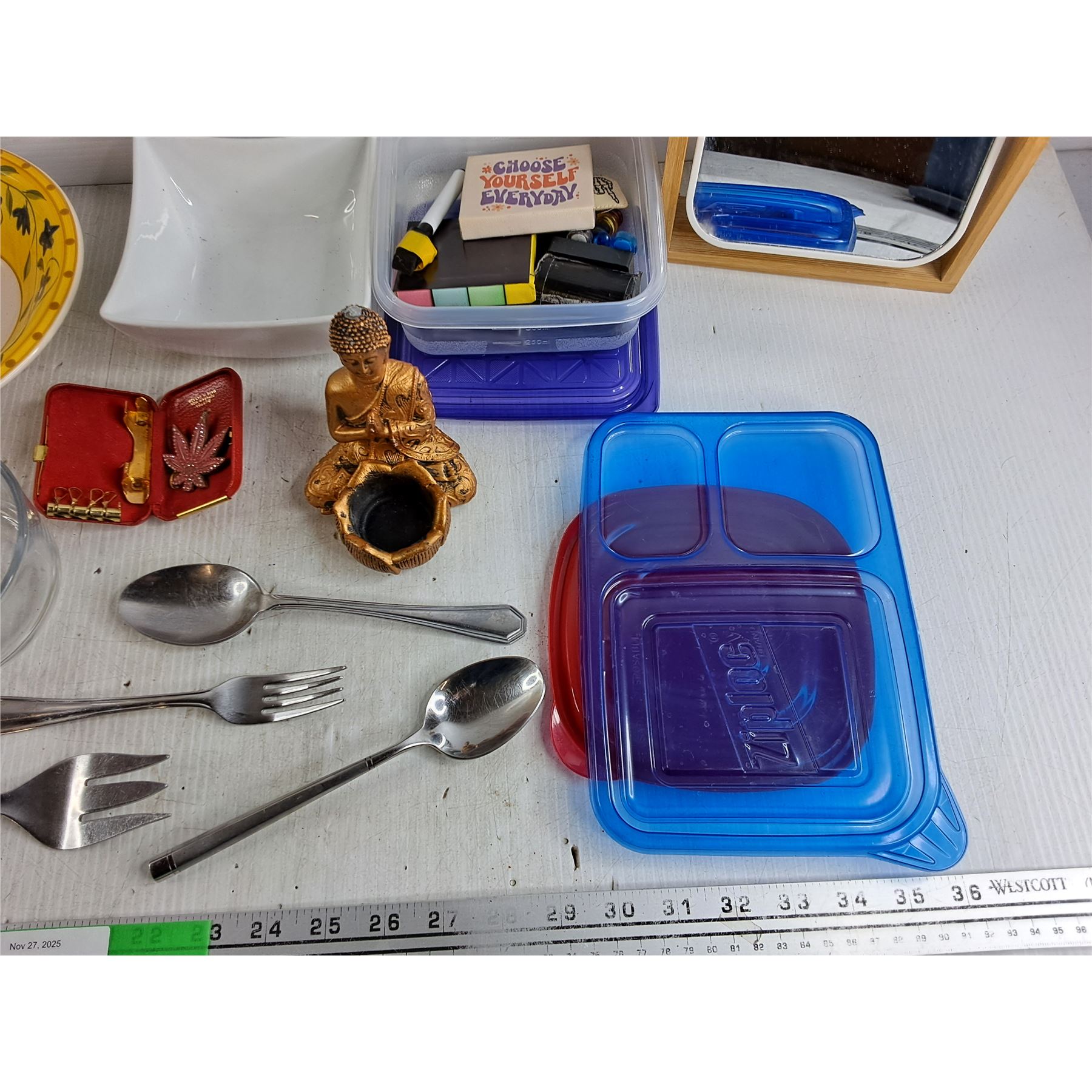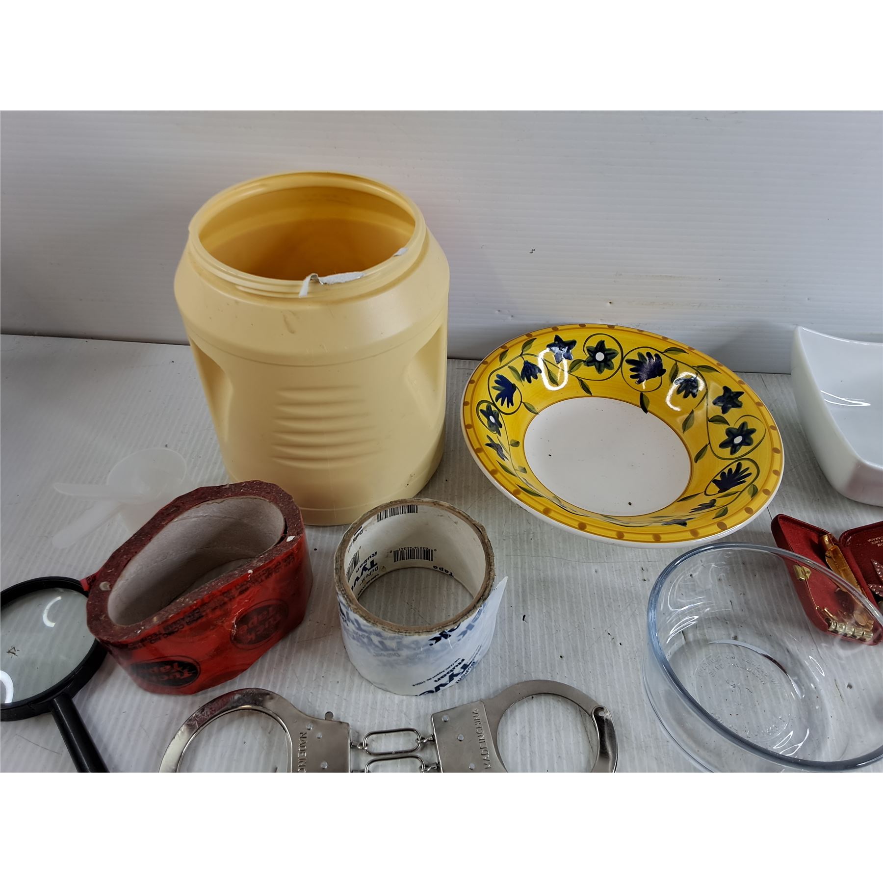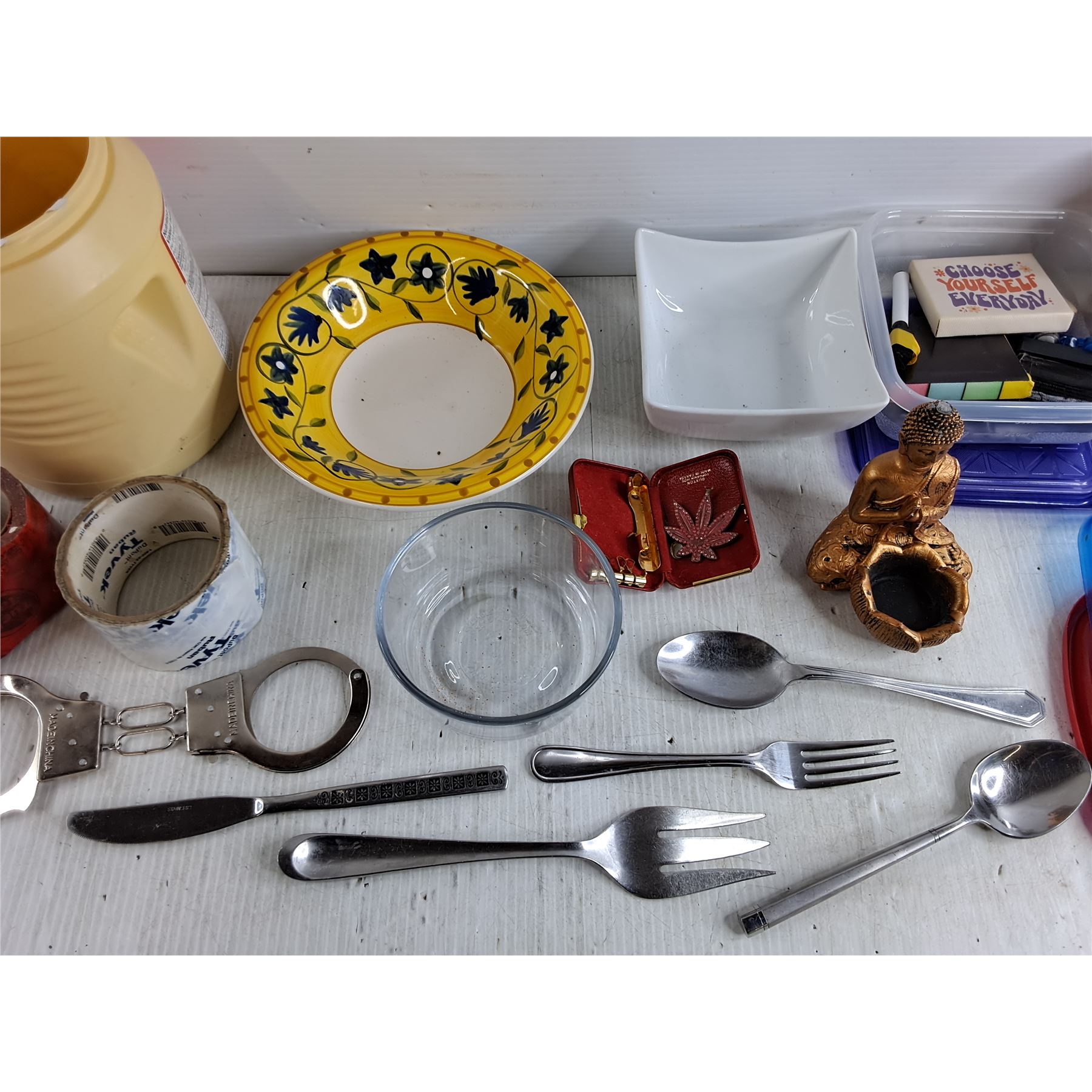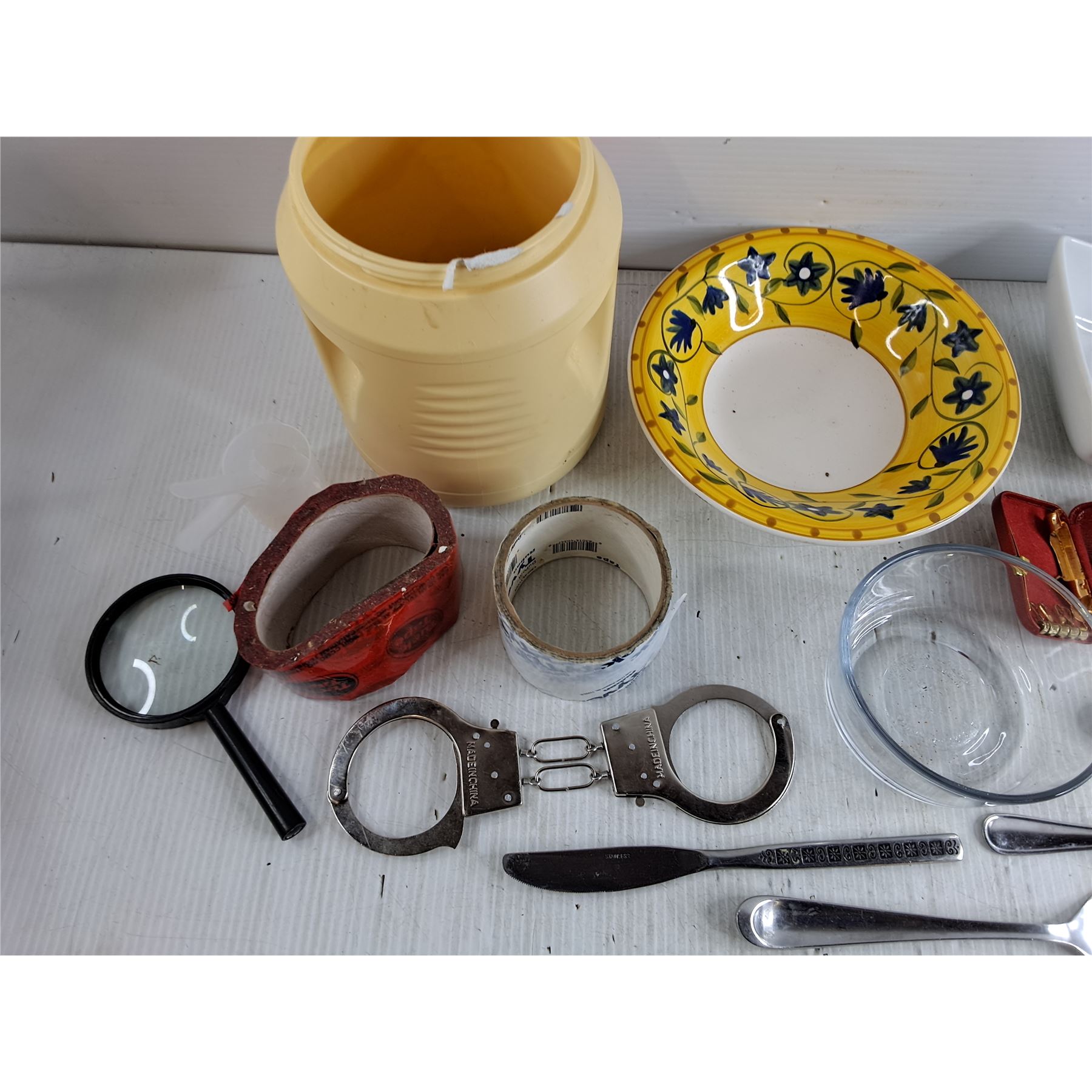 Handcuffs, Ceramic Bowl, Buddha Candle Holder, Cutlery, Magnifying Glass, MakeUp Mirror, Misc