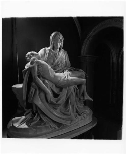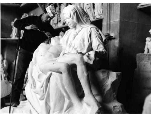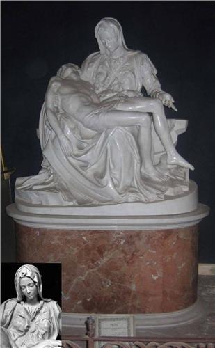 PIETA - Michelangelo's most famous masterpiece, the Pieta was sculptured in the year 1500 when the artist was but 25 years of age. Like his original at St. Peter's Cathedral in Rome, Italy, this reproduction was carved from ONE flawless piece of Carrara marble taken from Michelangelo's own quarry near his hometown of Pietrasanta, Italy. This piece was recreated by Pietrasanta artisans for the Palace of Living Art at the Movieland Wax Museum.  It weighs over 8 tons and took 2 years to complete to perfection. Note Michelangelo's name carved across the robe of The Virgin. He added the signature "Michelangelo Buonorroti of Florence Made This" after the completion of the statue when Michelangelo got word of arguments over the artist's identity. It is the only one of Michelangelo's works to bear his name. Includes photos of the making of this exquisite masterpiece reproduction.