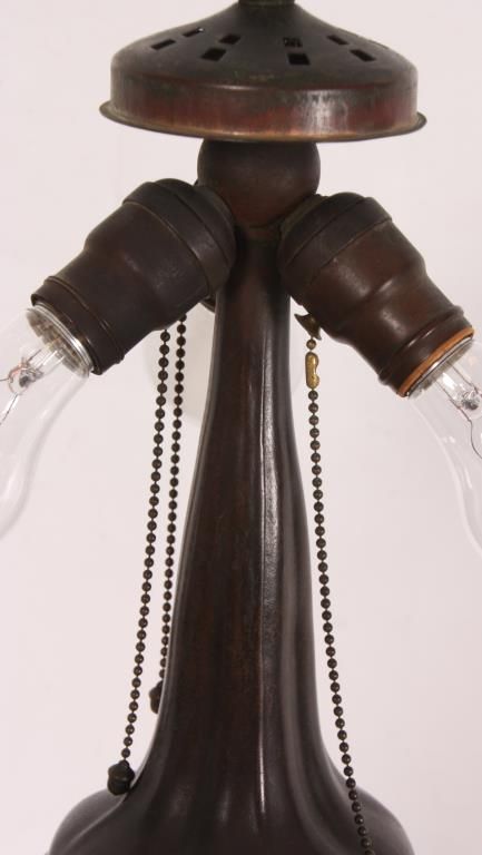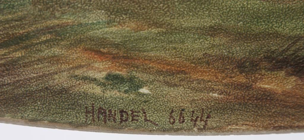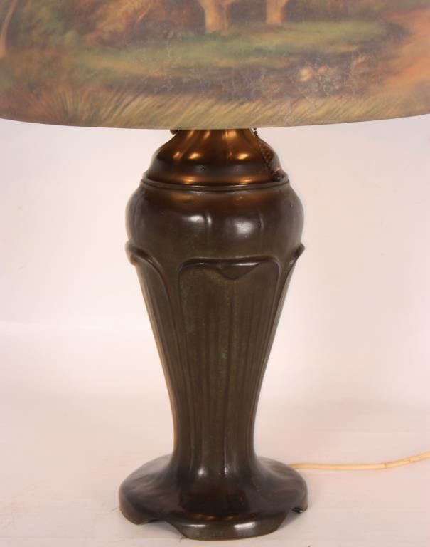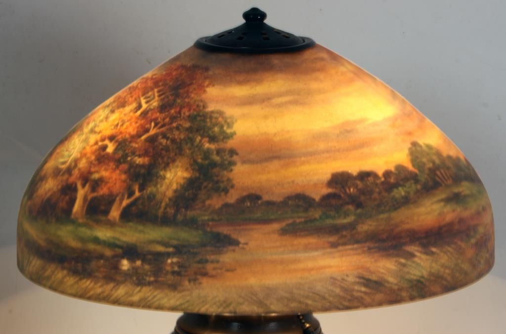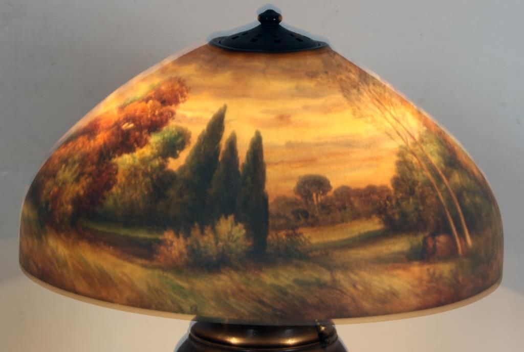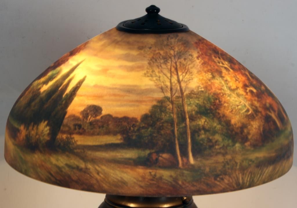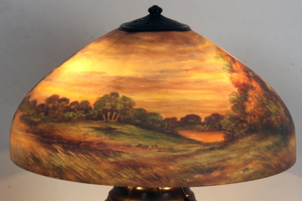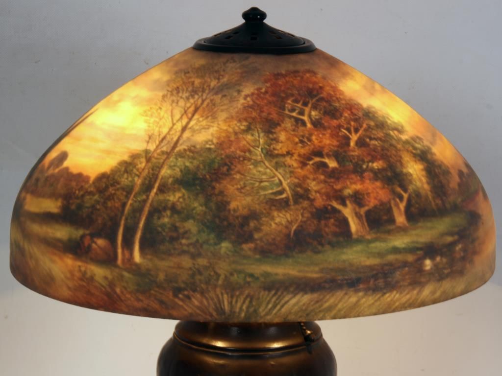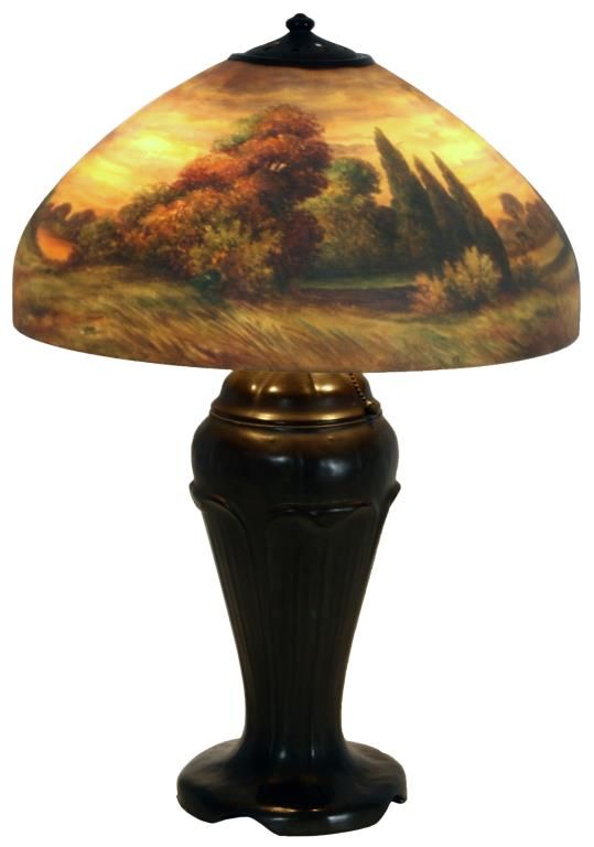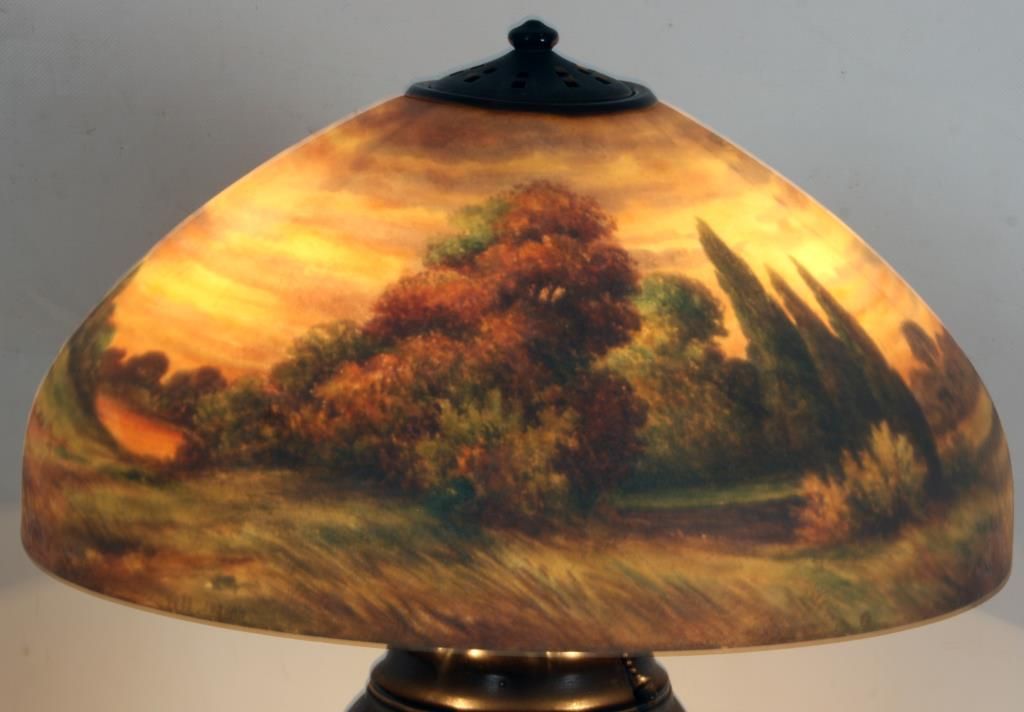 Handel 18 in. Reverse Painted Table Lamp. 18 in. domical lobed shade has a colorful landscape with tall firs and large broadleaf trees over some low brush and grassy meadows, under and amber morning sky; shade signed Handel 6644 and artist initialed JB; no chips or cracks no inpainting or damages to the paint, has nice strong color. On a large leaf molded base with spherical 3 socket light cluster with replaced sockets retaining original acorn pulls under a pierced heat cap; base signed Handel. 26 in. high.