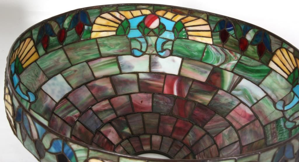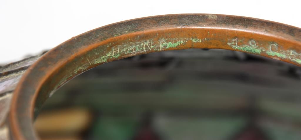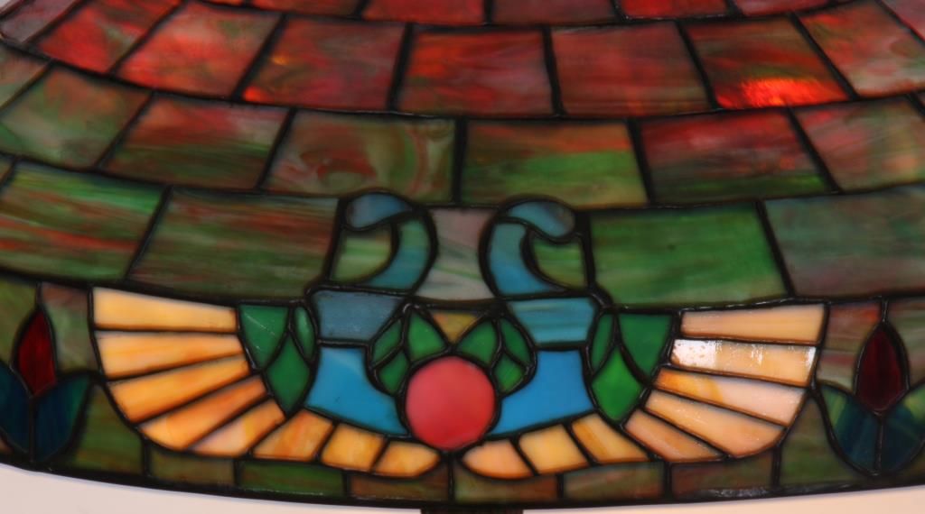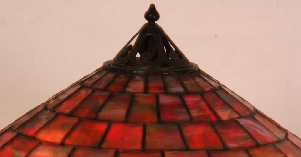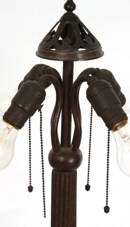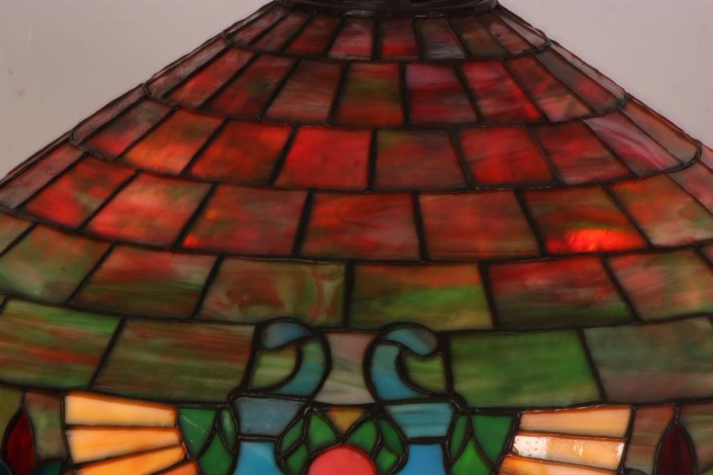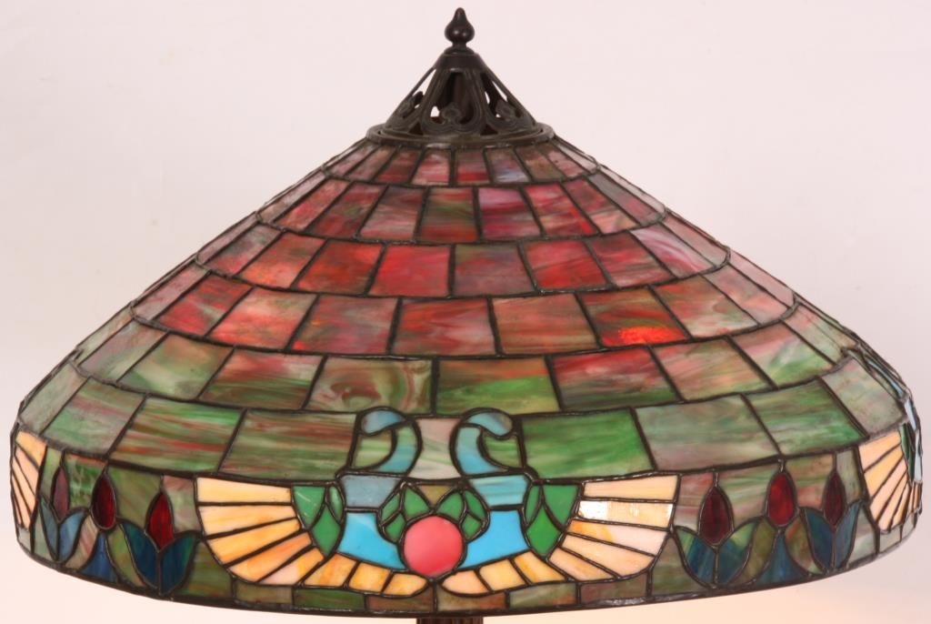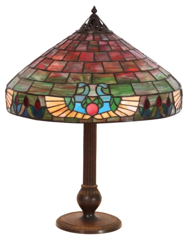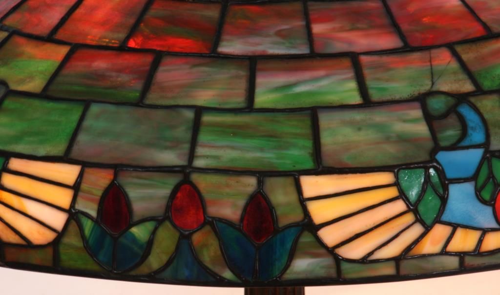 Handel 20 in. Leaded Table Lamp. The shade has a vibrant and colorful slag glass background with deep red, green and white striations in a staggered brick geometric pattern; the lower border has 4 stylized medallions with round red centers, golden wings under pale blue scrolls and flower buds between each medallion. 9 panels with heat cracks, shade has some pulling between the leading and 3 spots on the exterior with extra solder; shade is signed inside of the aperture ring Handel 1905 -20..- (model number & shade size). The bronze base has a round platform with pie crust border around the edge, fluted stem with sphere at the bottom, ellipsoidal light cluster with 4 serpentine arms and original Hubbel sockets with acorn pulls; the riser is topped with a pierced conical heatcap and finial. Base has a nice deep brown patina with red highlights, signed on the base plate Handel 1953. missing one acorn on the socket. 26 in. high.
