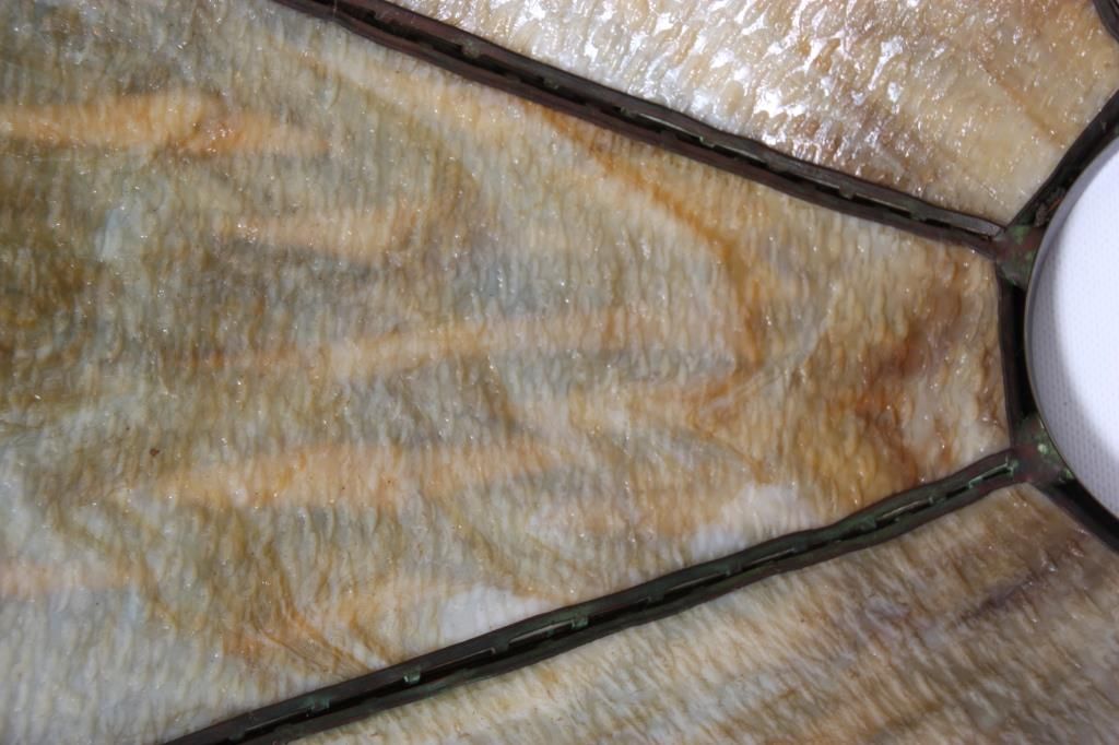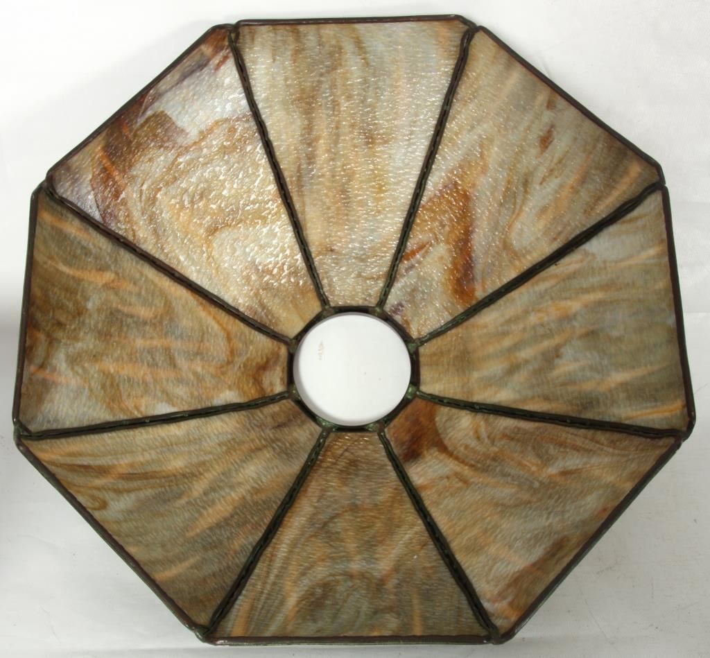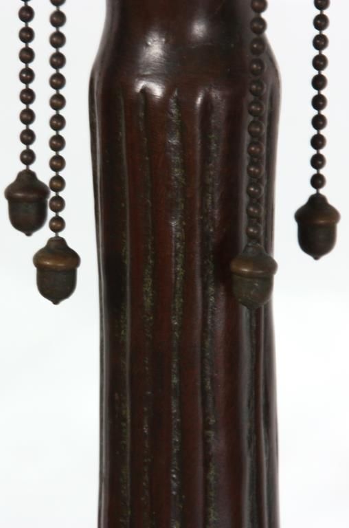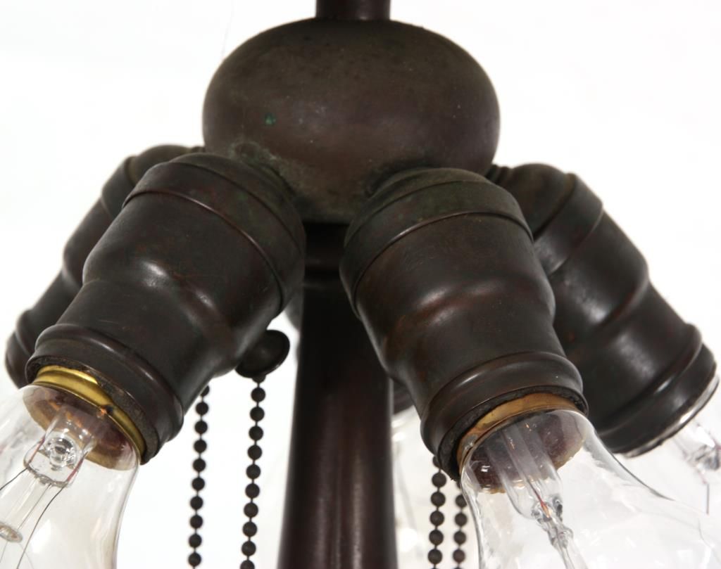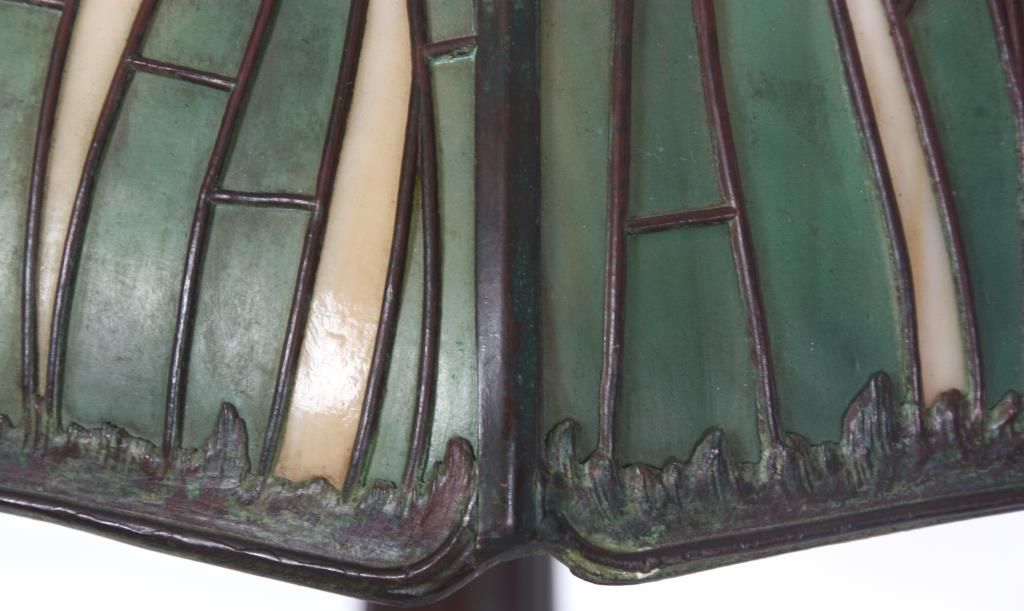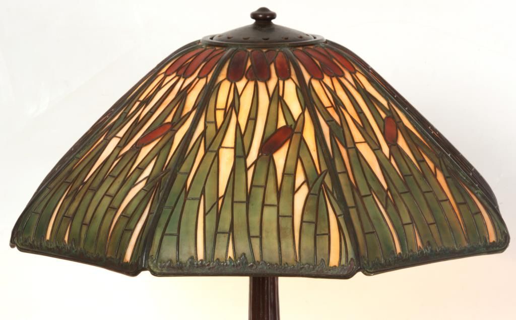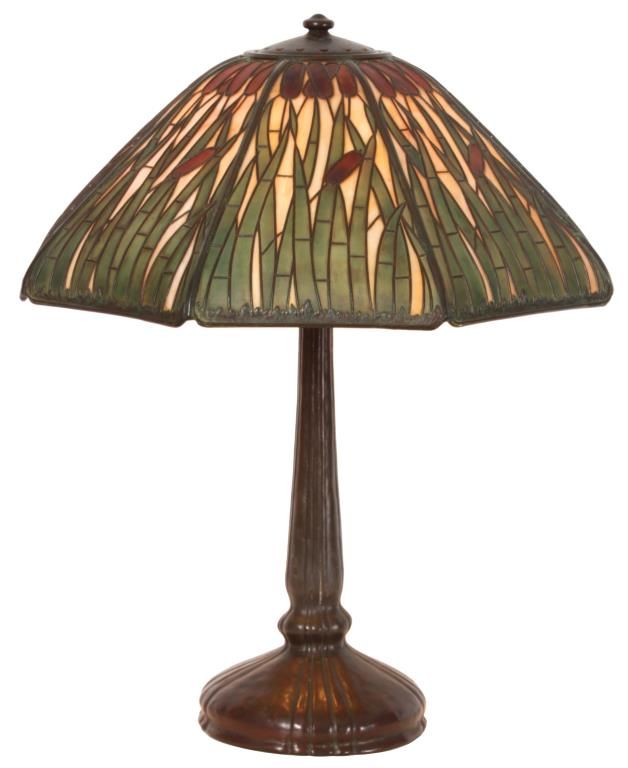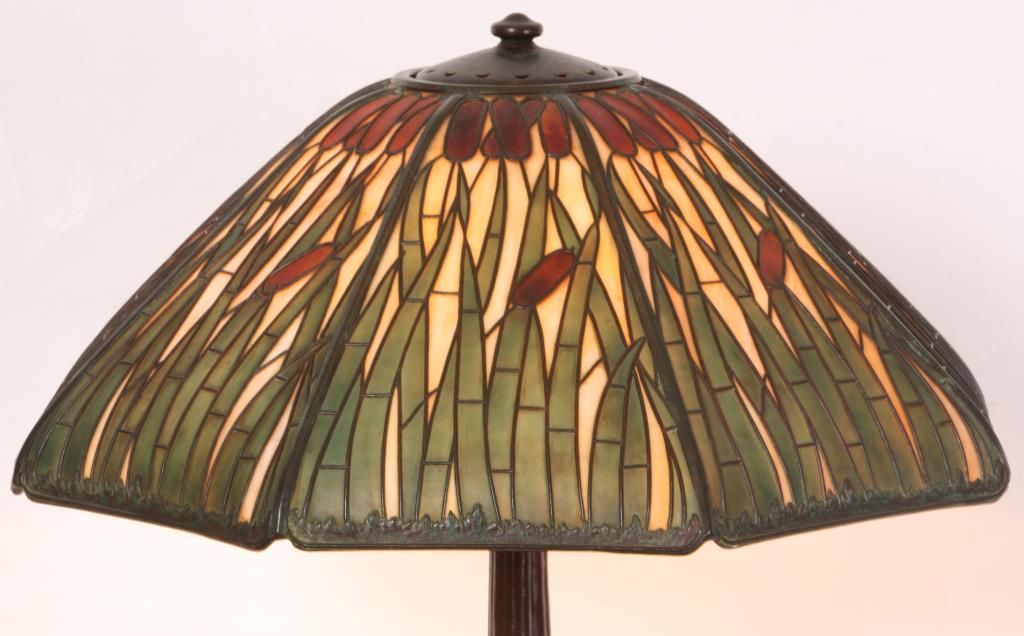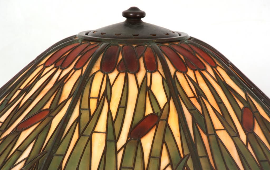 Handel Cattail Overlay Table Lamp. 22 in. shade with leaf and cat tail pattern reaching up over the 8 bent slag glass panels and obverse painted with brown and green between the overlays; unsigned. shade is excellent with no cracks or breaks to the glass, no replaced or repainted panels. On a large Handel base with domical platform and ribbed stem, ellipsoidal light cluster with 5 original sockets having original acorn pull chains; original saucer shaped & reticulated heat cap with finial, signed Handel on the edge of the base. 28 in. high.