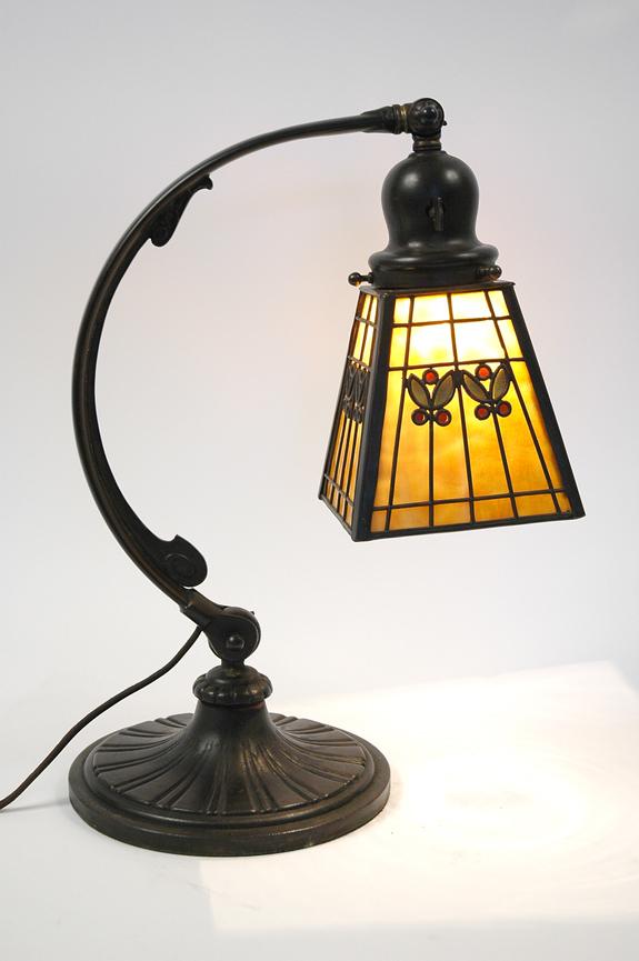 Handel Desk Lamp With Butterfly Shade. Approximately 15 inches high, the shade is 4 3/4 inches in diameter. Both the shade and base are signed. The base has the original patina, heat cap, and finial.