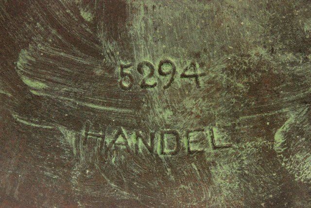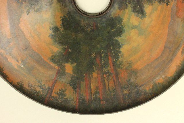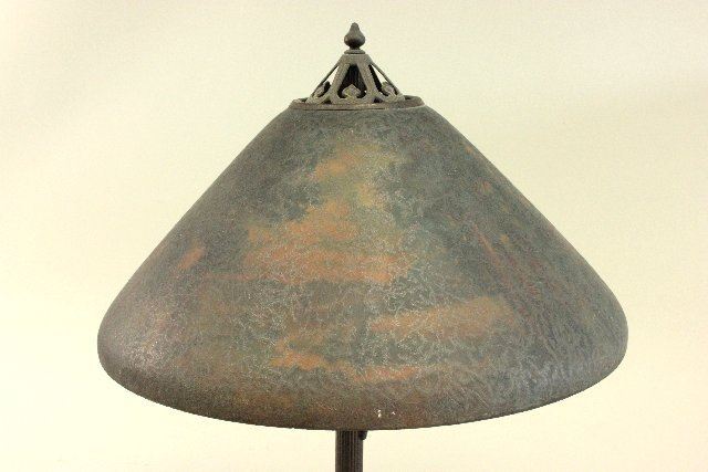 Ice chip finish. Base signed, Handel # 4294. Shade signed on metal rim. From a horse farm in Colts Neck, NJ.