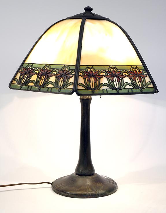 Handel Rambling Rose Table Lamp. Approximately 18 inches high, shade is 16 1/8 inches in diameter. Both the shade and the base are signed. The base has the original patina, heat cap, and finial.