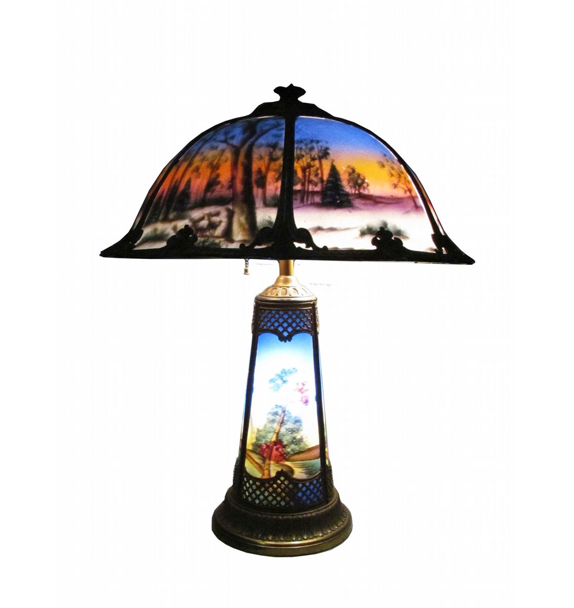 Handel Reverse Painted Metal Overlay Table Lamp. Shade with matching base. Excellent condition. Shade measures 20 inch diameter X 24 inches tall.