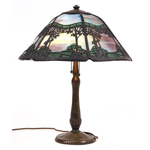 <Our item number 138555><B>Handel Section Tree Lamp.</B> Approximately 21 inches high. Shade is 16¾ inches in diameter. Signed base and shade with original patina to both. Original socket, acorn pulls, heat cap, and finial.<BR><BR>Philip Handel was best known for the art glass lamps that he produced in Meriden, Connecticut at the turn of the century. In Robert DeFalco's book, <I>Metal Overlays by Handel</I>, he states: "Handel conceived and produced lamps with the idea that the fixture itself was sculpture and its luminescence fine art. In the true Arts and Crafts spirit, Handel captured the essence of the handcrafted quality and realized the vision of the the artist in every lamp." <BR>Estimated Value $3,000 - 5,000. <BR><BR>Our item number 138555<BR><IMAGES><P ALIGN="CENTER"><IMG SRC="http://www.goldbergcoins.net/liveauction/49jpegs/138555.jpg"> </P></IMAGES>
