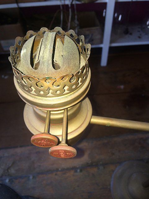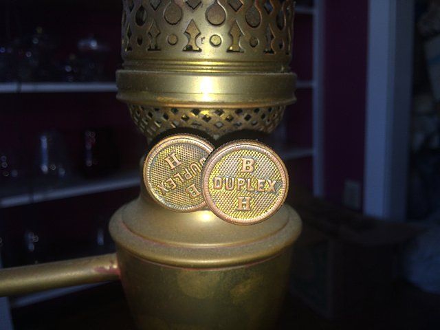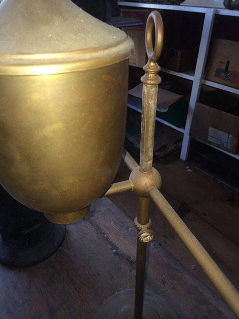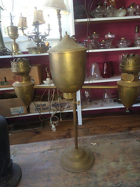 Bradley and Hubbard adjustable glass student lamp. Very nice brass student lamp with double burners on each side. Handel, signed with original felt on bottom and signed on the side, Asian motif, measures approximately 22" high.
