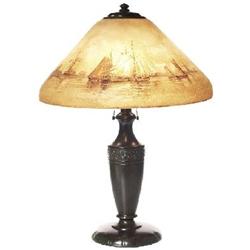 Good Handel lamp, bronzed metal base supporting an obverse painted shade with numbeorus saiboats and windmills, shade signed Handel 5936, marked at fitter rim 18"w x 25"h, base with a fine patina
