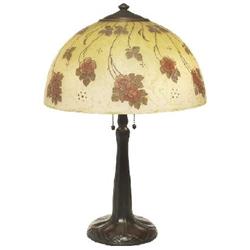 Handel lamp, obverse and reverse painted shade with stylized roses against a mottled yellow background, signed, numbered and artist initials on shade, bronzed metal base with its original patina and signed, 14”dia. x 20.5”h