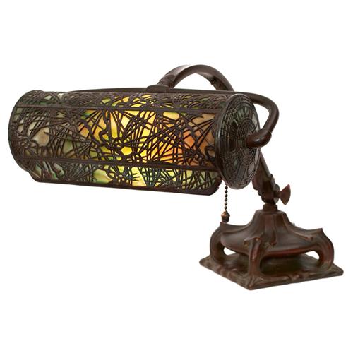 Handel piano lamp, cylindrical shade with intricate metal overlaid pine needle design on an adjustable bronzed metal base, 12"w x 12"h, very good condition