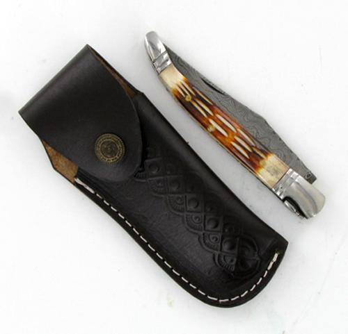 Excellent top grade piece with handcarved horn handle and tooled belt case; 9"