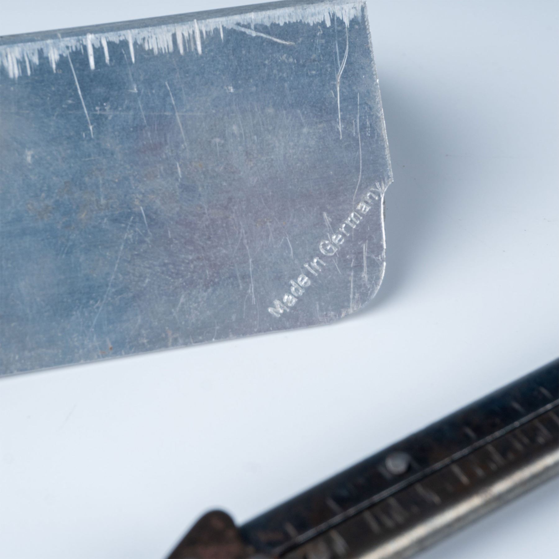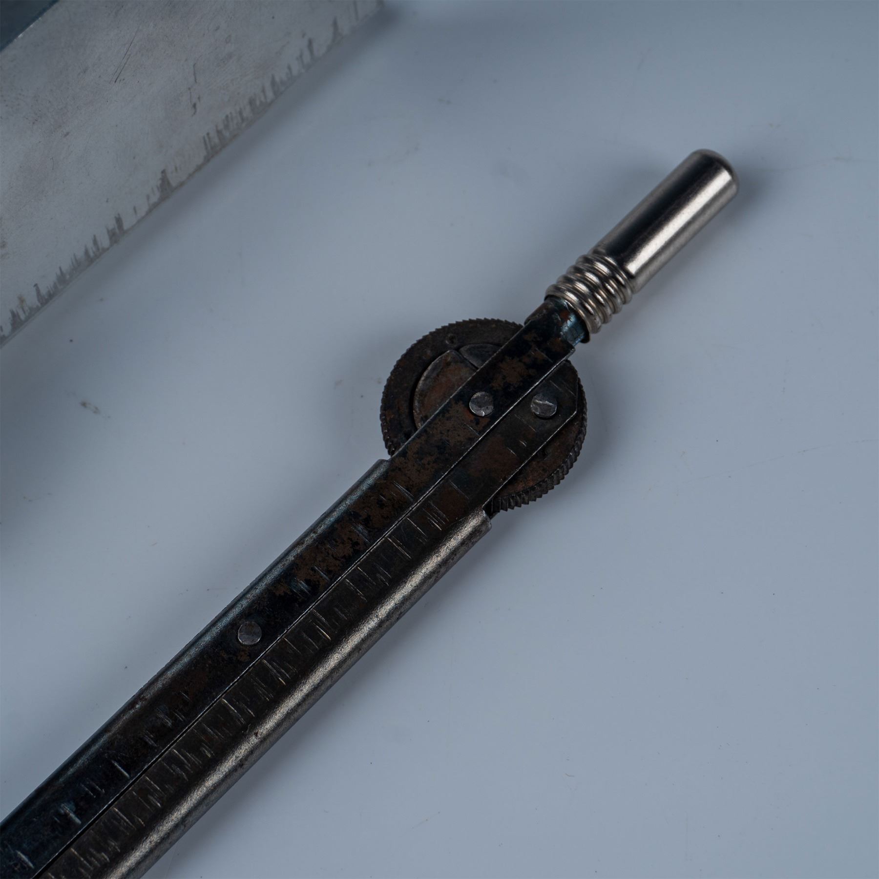 Vintage handheld powder flash dispenser featuring an adjustable metal frame and a detachable aluminum reservoir for precise measurement and control. Commonly used in the preparation of black powder applications or pyrotechnics. Includes a ruler-like marking scale for calibration and accuracy. The item is in functional condition with visible wear consistent with age and use.