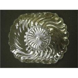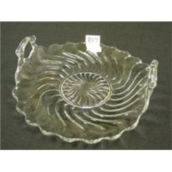 Swirl pattern glass tray with handles. Sloped sides. Scalloped edges. 8.75" wide. 3-3/8" tall at handles. Condition: Excellent