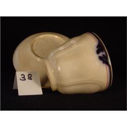 Earthenware handleless cup & saucer, molded with an embossed 6-lobed pattern, having an underglaze blue rim with leaf sprigs and painted with thin maroon & blue stripes around cup rim and cup well in saucer. Cup is 3" tall and 3 5/8" wide and impressed with a "P" and has a 1" hairline. 5 7/8" saucer w/hairline.
