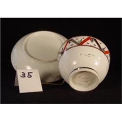 Handleless cup & saucer painted with unusual iron red and gold geometric pattern, softened by leaf sprigs, unmarked. The 5" saucer is without cup well & has some chips on the edge; the 2" tall & 3.25" wide cup is in great shape. Some wear to gold bands, but overall would make a great display piece.