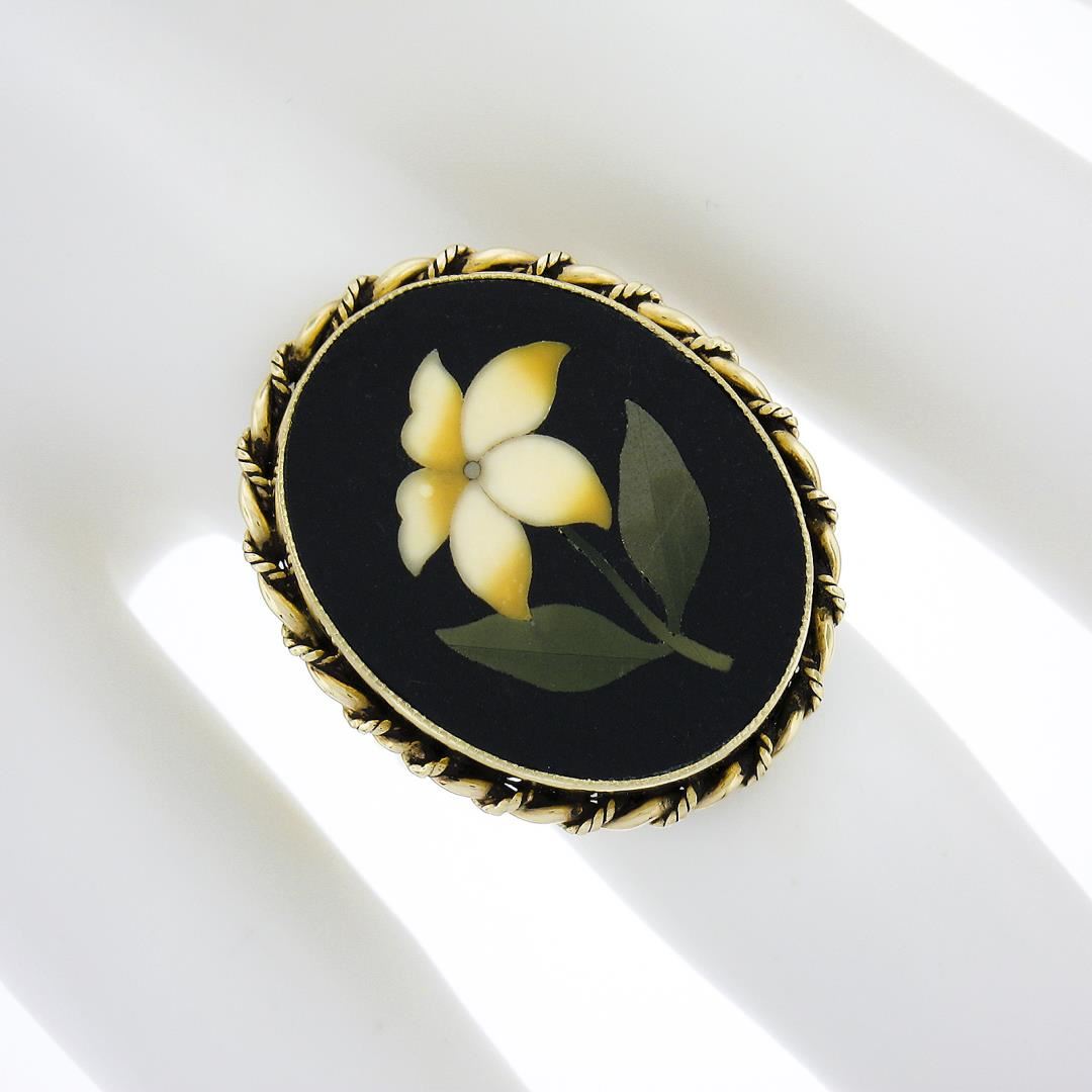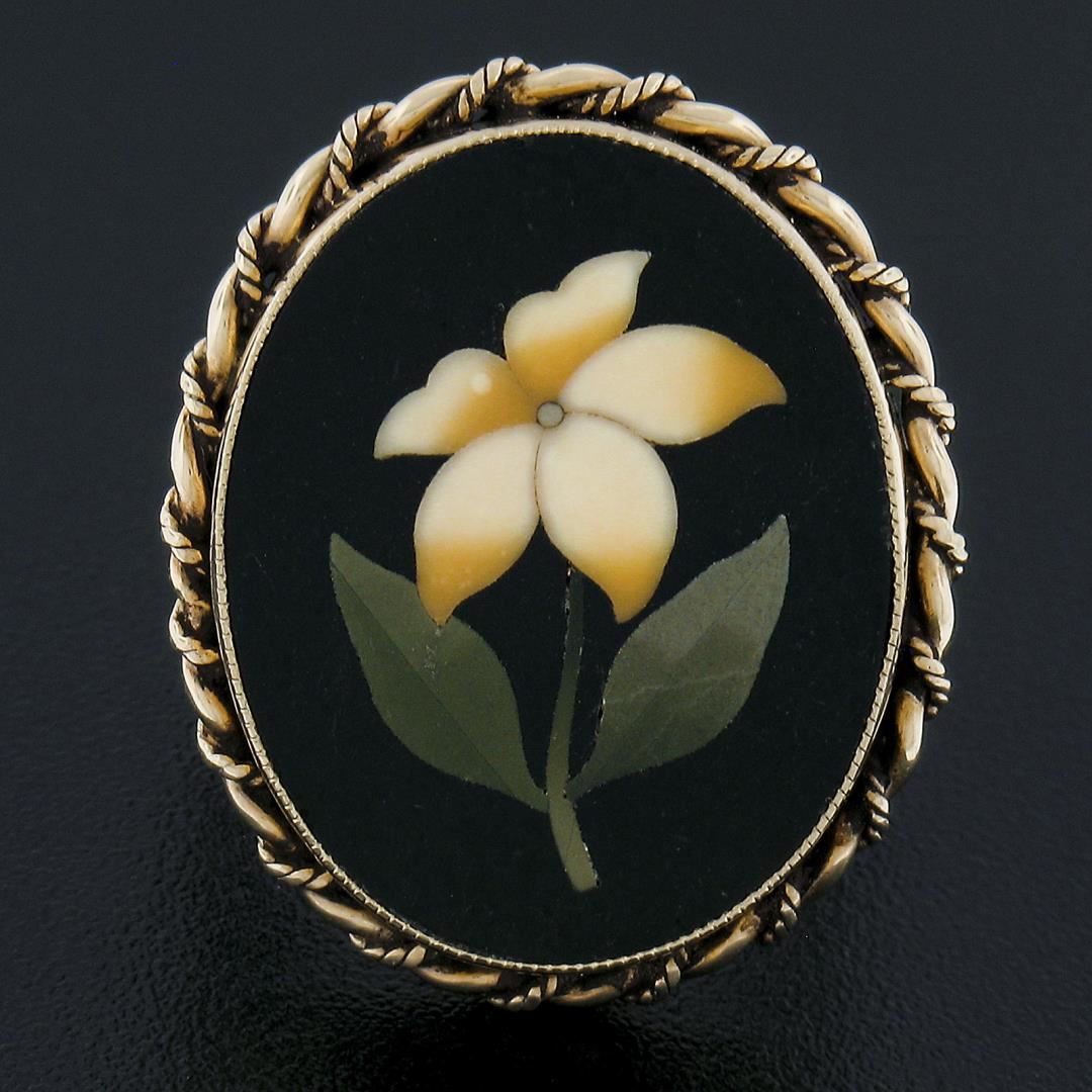 A solid 14k yellow gold ring, with oval cut pietra dura natural stone (21.5x16.9mm). The ring is size 6.0, weighs a total of 6.06 grams, and measures 25.1mm wide.
