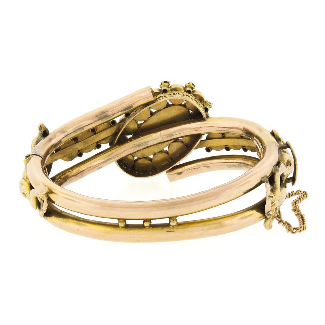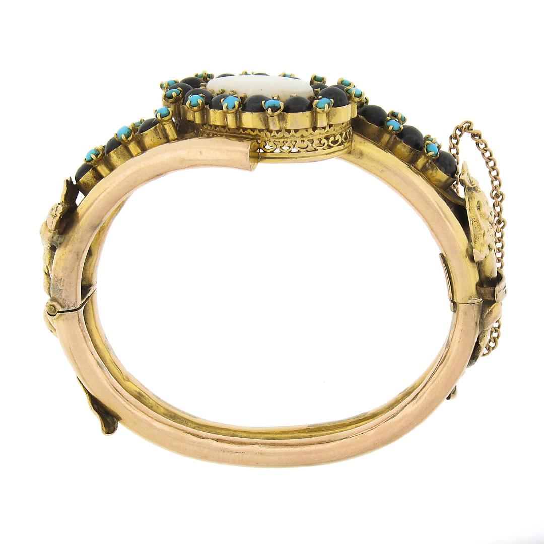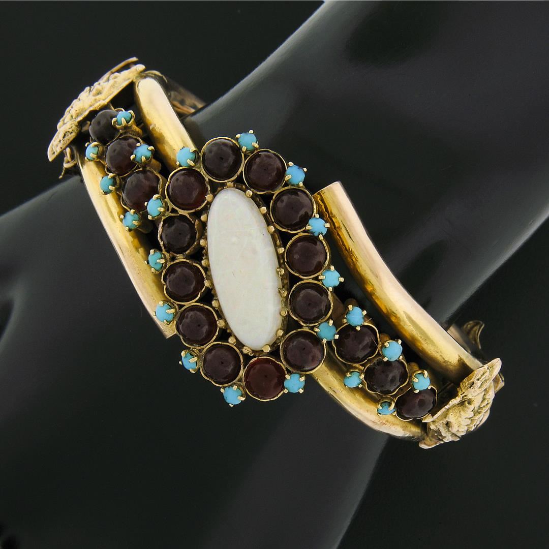 Vintage handmade solid 14k yellow gold hinged bangle bracelet. with 1 oval cabochon cut natural opal (20x8.7mm), 18 round cabochon nut natural garnets (5mm), and 22 round cabochon cut natural turquoises (2-2.5mm). It weighs a total of 41.90 grams, measures 30.5mm wide, and measures 6.75 inches in length.