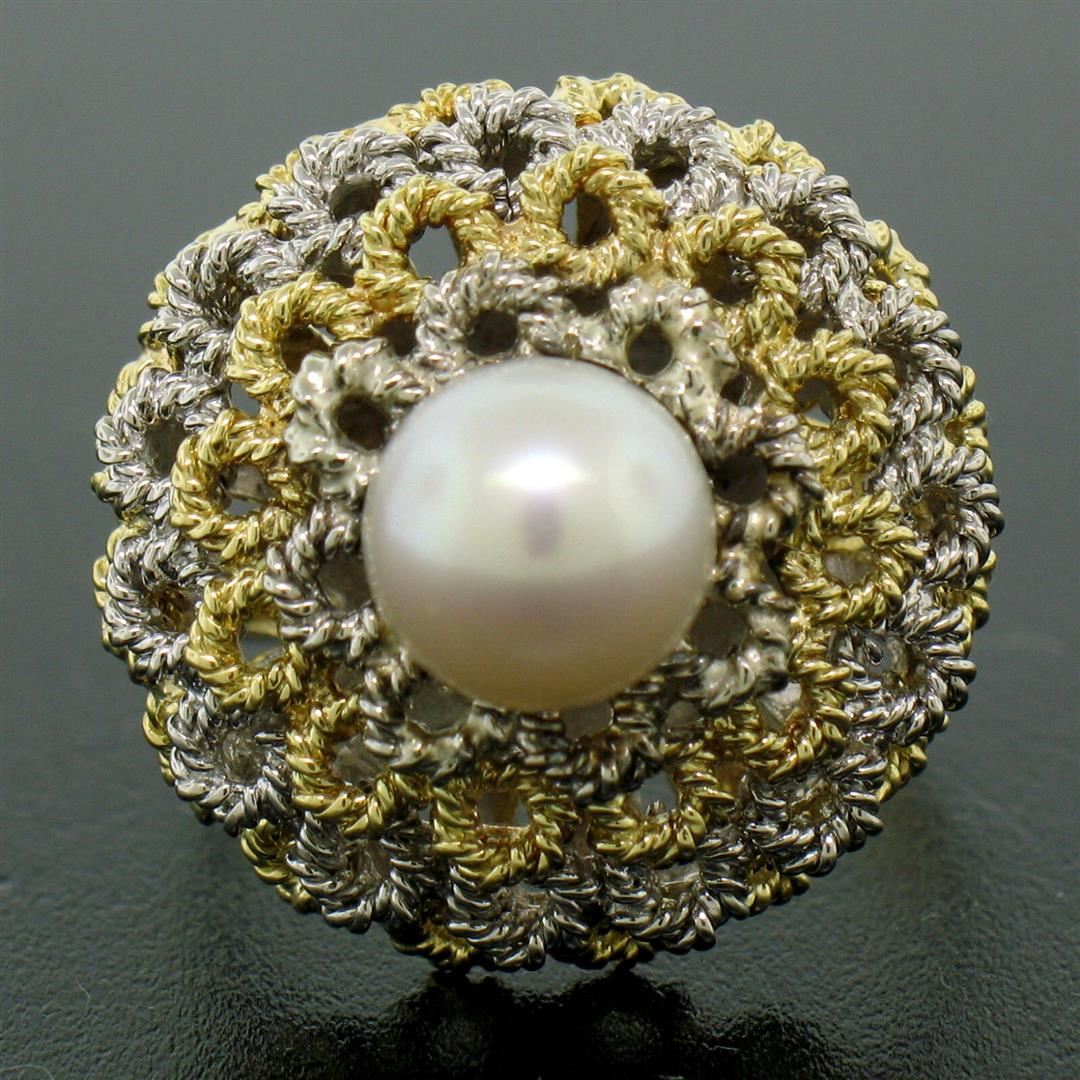 A like new handmade 18kt yellow and white gold ring set with a 7.5mm round pearl. The ring is size 6.5, weighs a total of 8.4 grams, and measures 19.75mm wide.