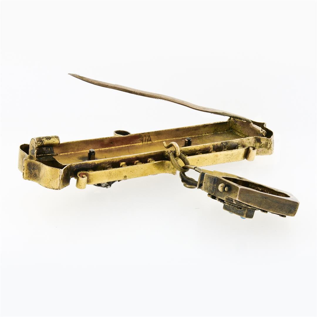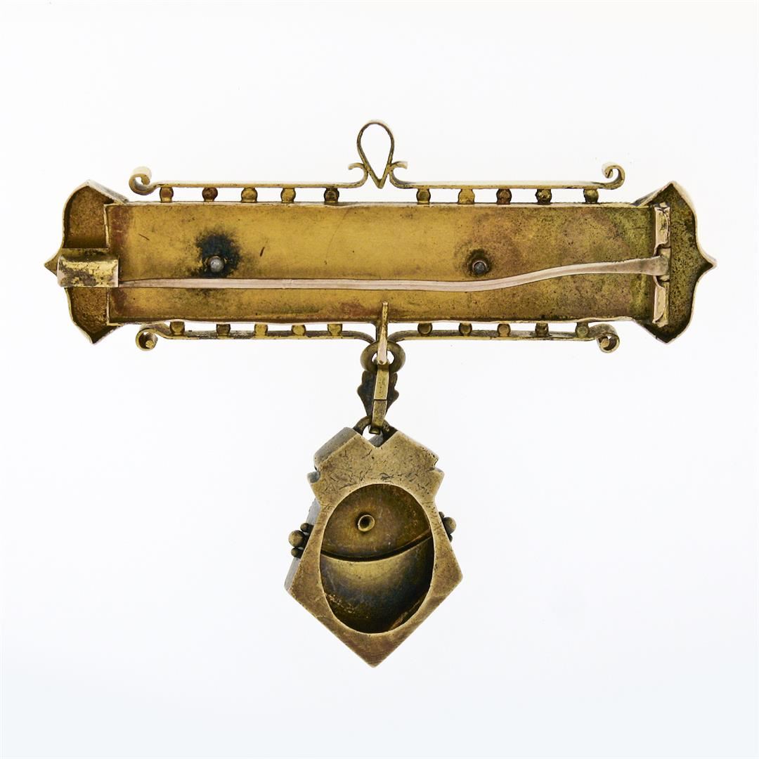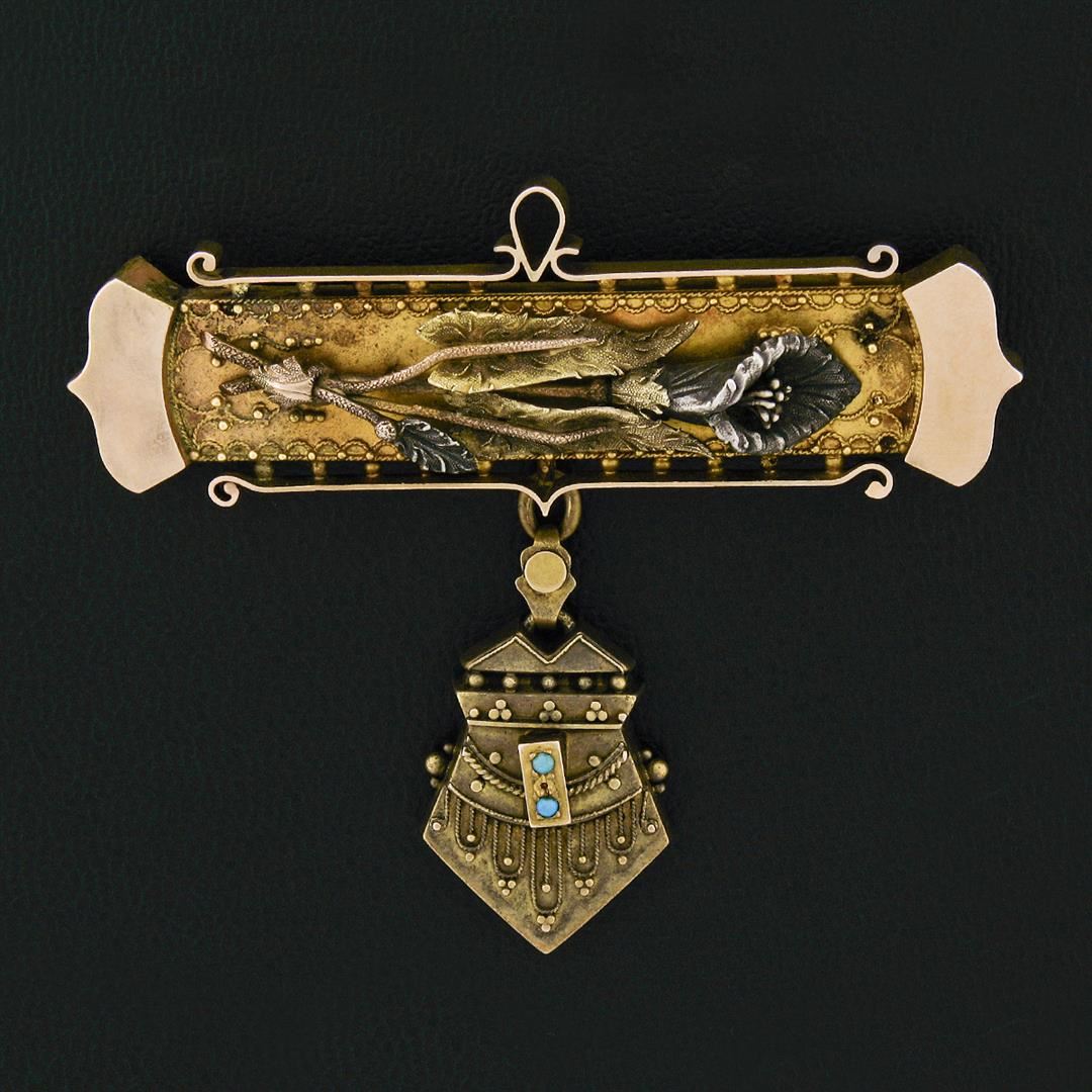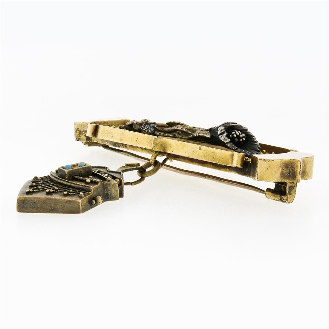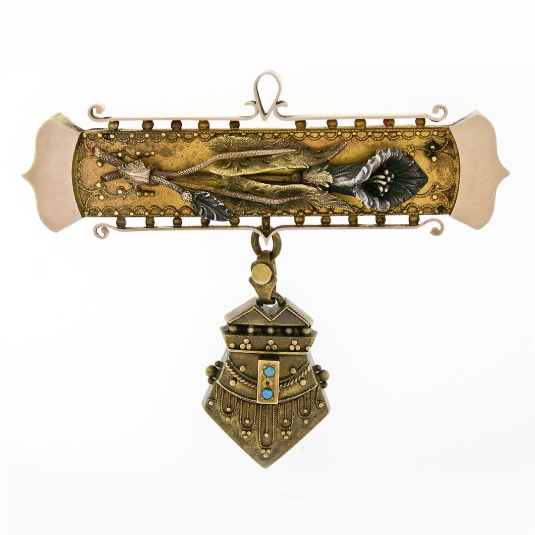 An antique solid 14k green, yellow & white gold dangle bar brooch, with 2 round cut natural turquoise (1.45mm). Measures 60.30x69mm and weighs a total of 16.20 grams.