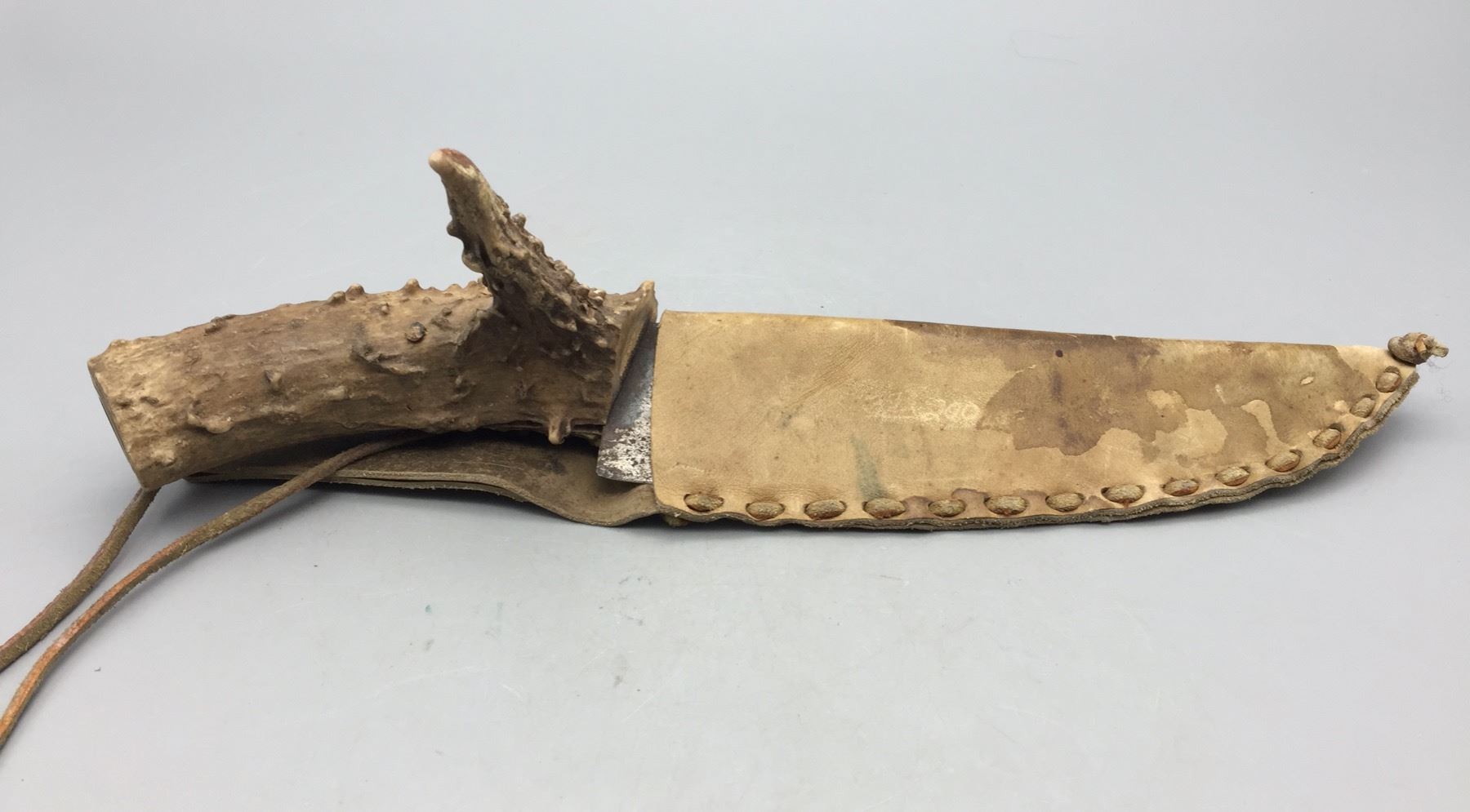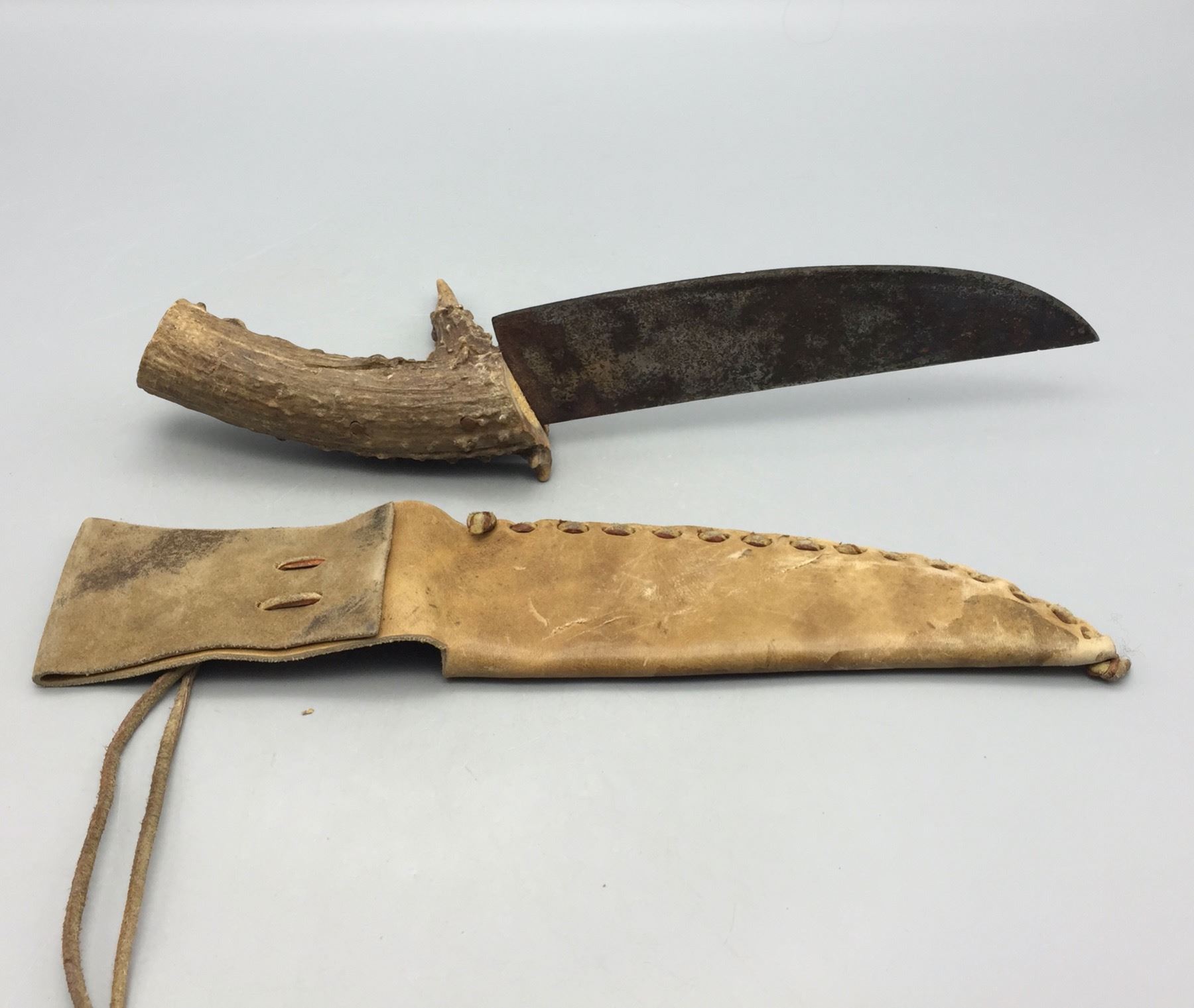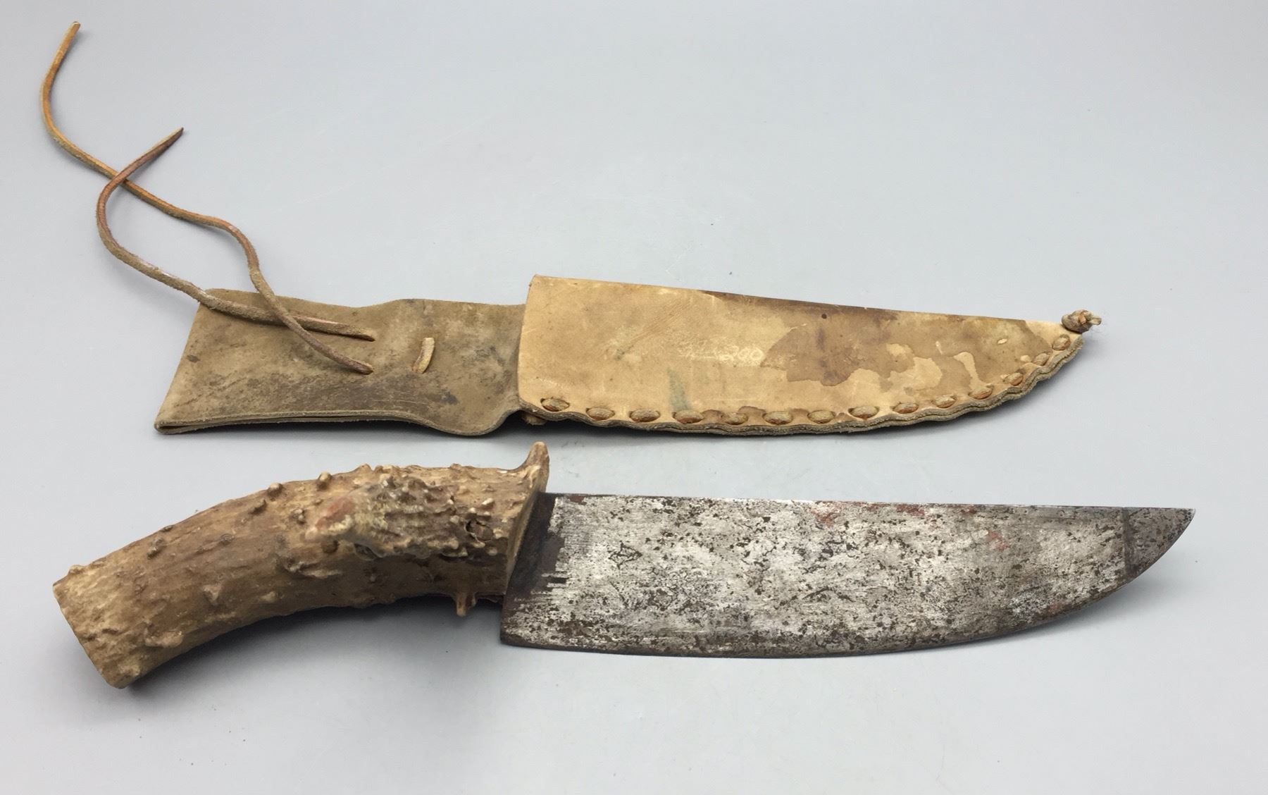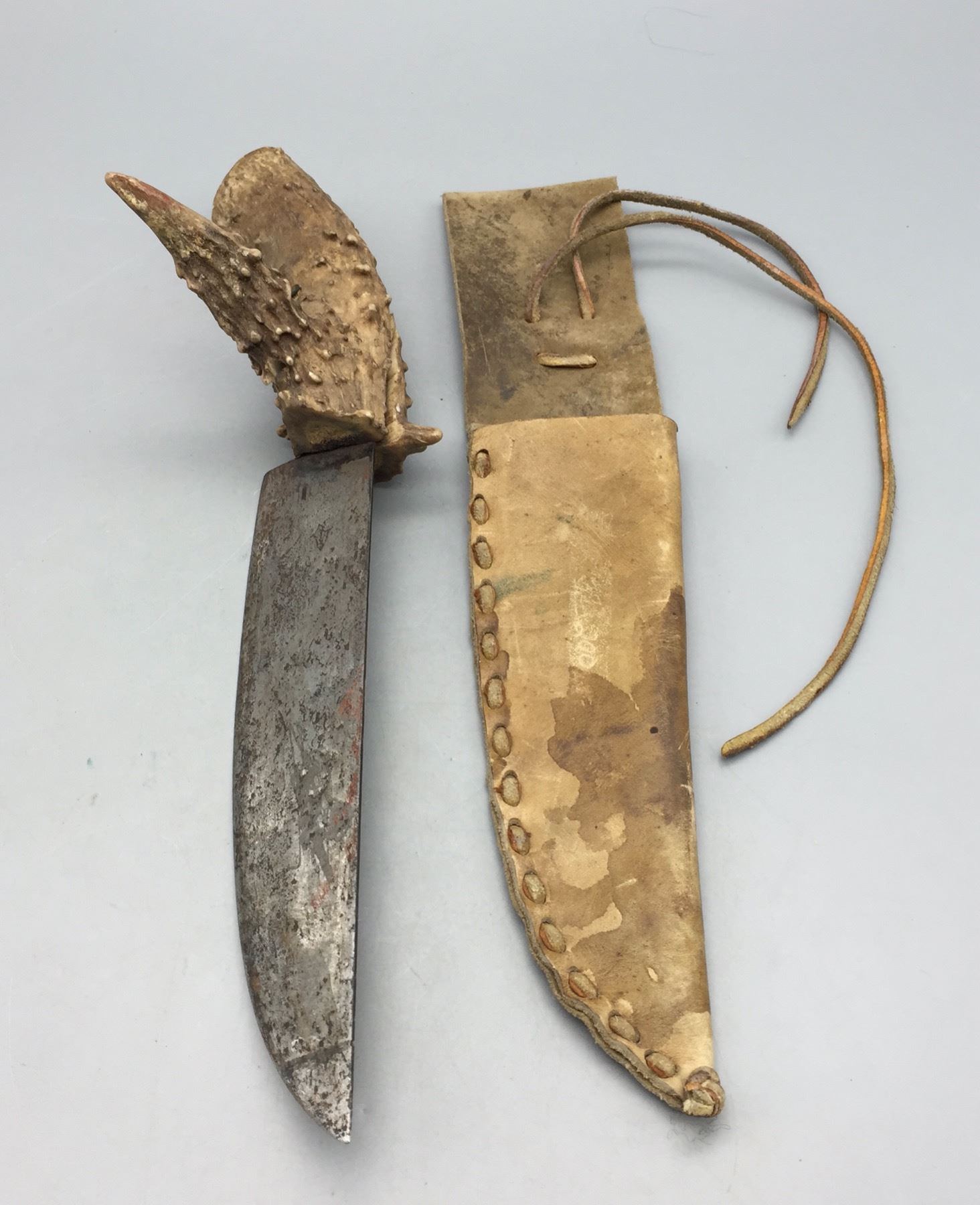 Description: For sale in this lot is a handmade, antler handled knife with leather sheath. Maker: Unknown. Approx. Age: Vintage. Size: 5â€w x 14†long. Condition: Good for its age, normal wear expected. Please look closely at the pictures - they are an important part of our description. Shipping: There will be a $5 handling / packaging fee for shipping this lot. The actual cost of postage will be added on top of that.
