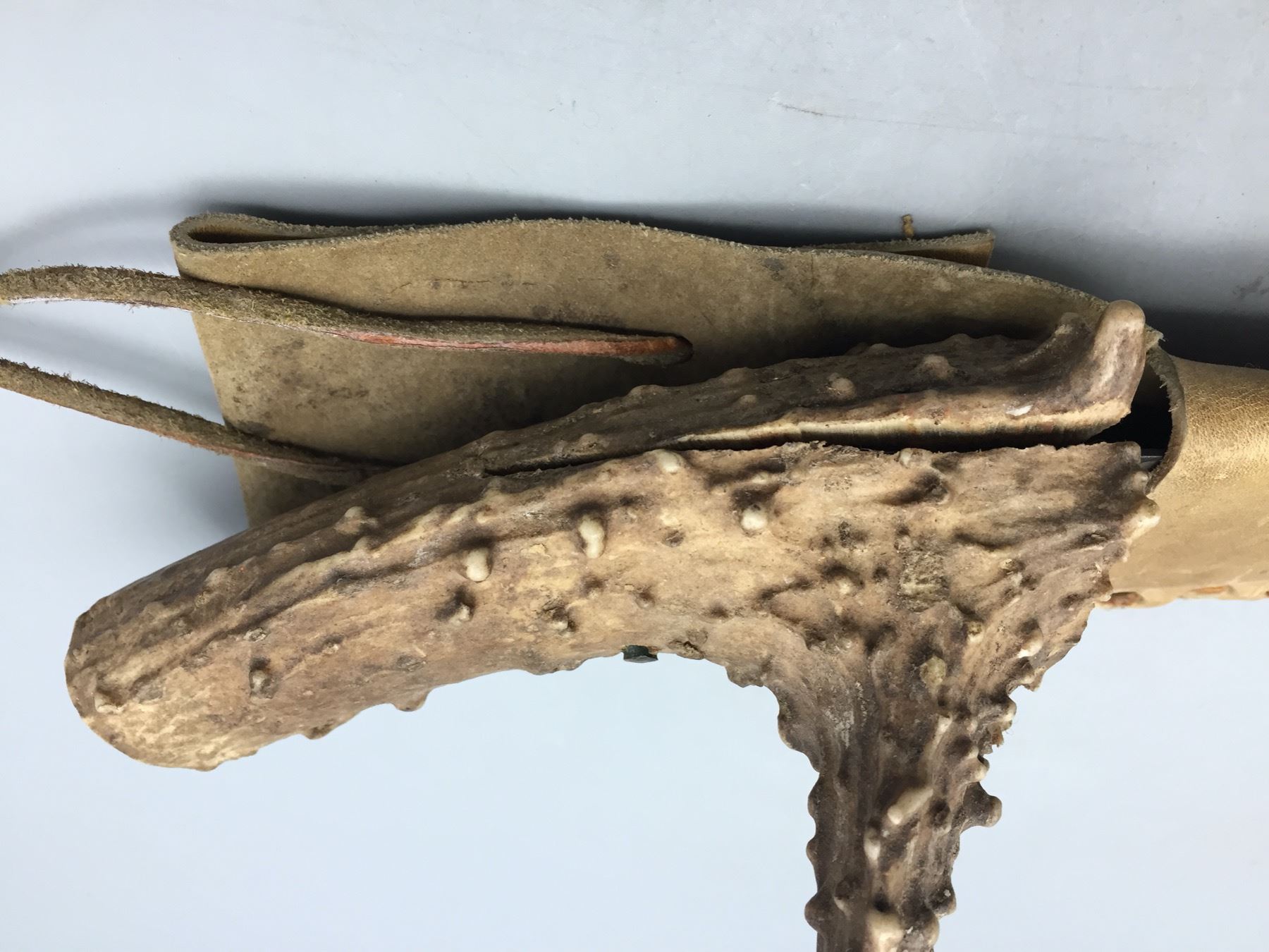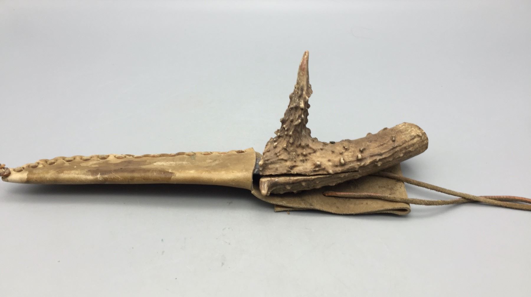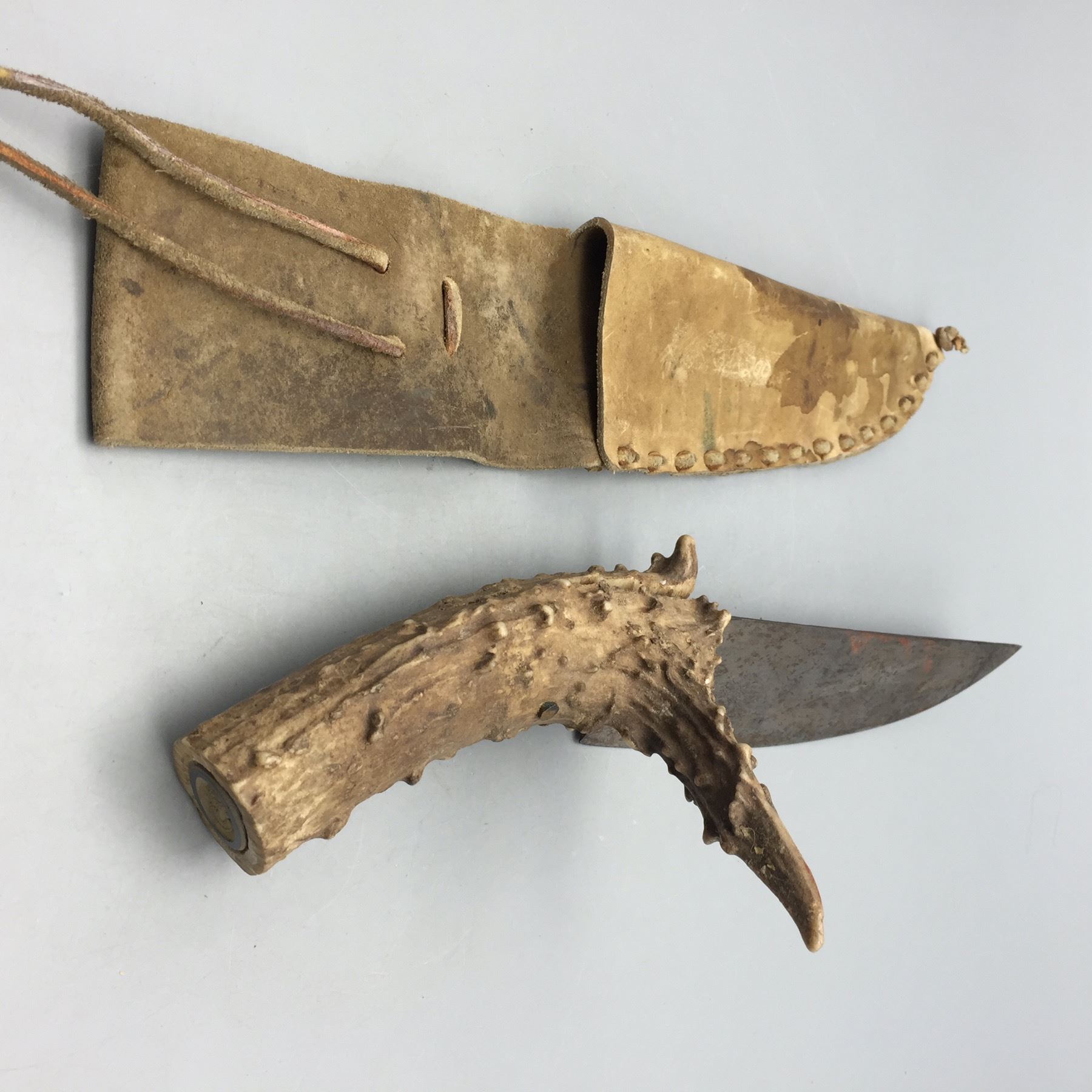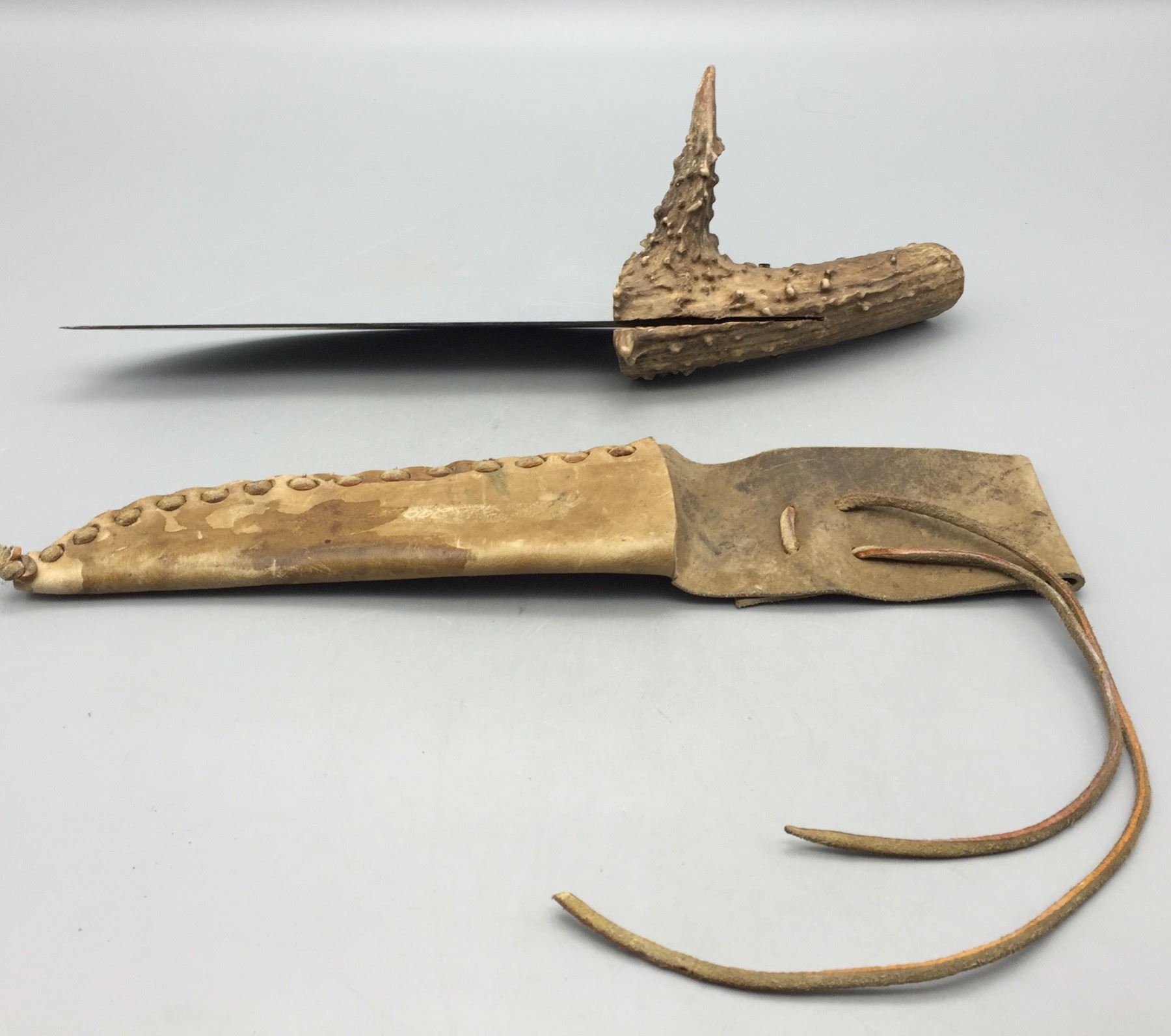 Description: For sale in this lot is a handmade, antler handled knife with leather sheath. Maker: Unknown. Approx. Age: Vintage. Size: 5â€w x 14†long. Condition: Good for its age, normal wear expected. Please look closely at the pictures - they are an important part of our description. Shipping: There will be a $5 handling / packaging fee for shipping this lot. The actual cost of postage will be added on top of that.