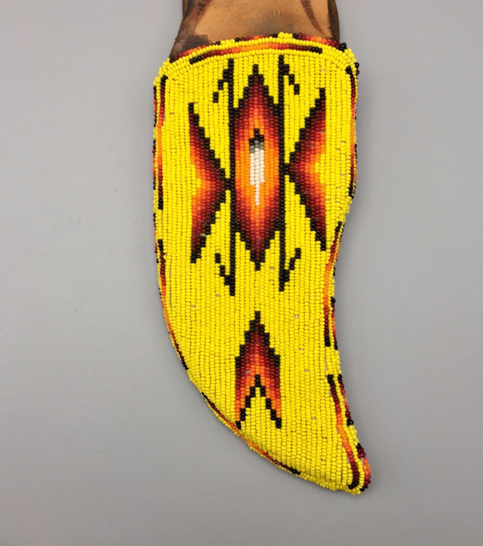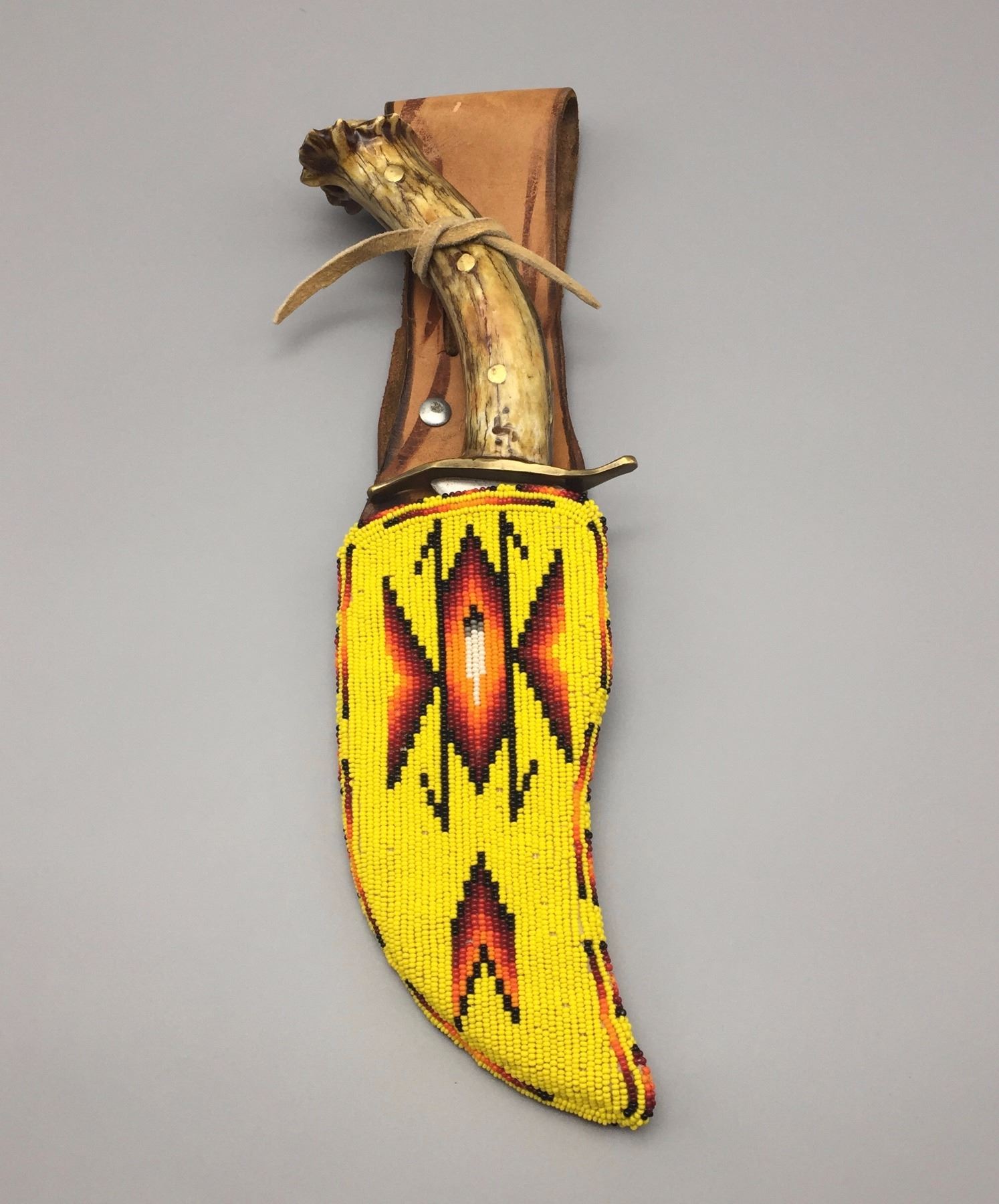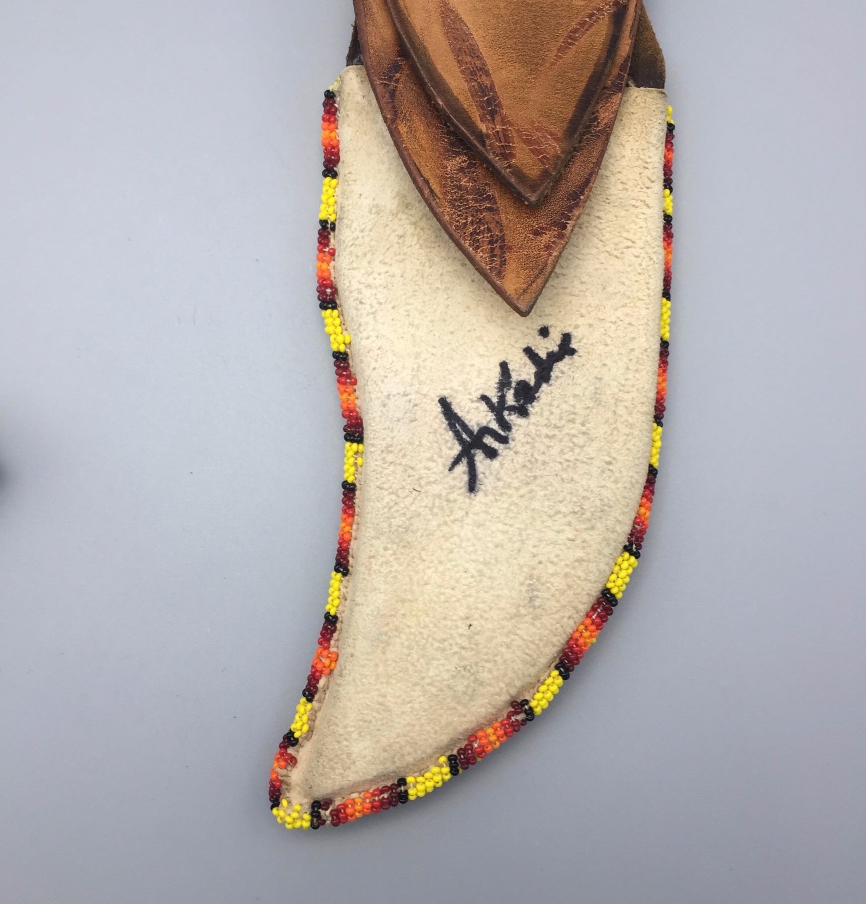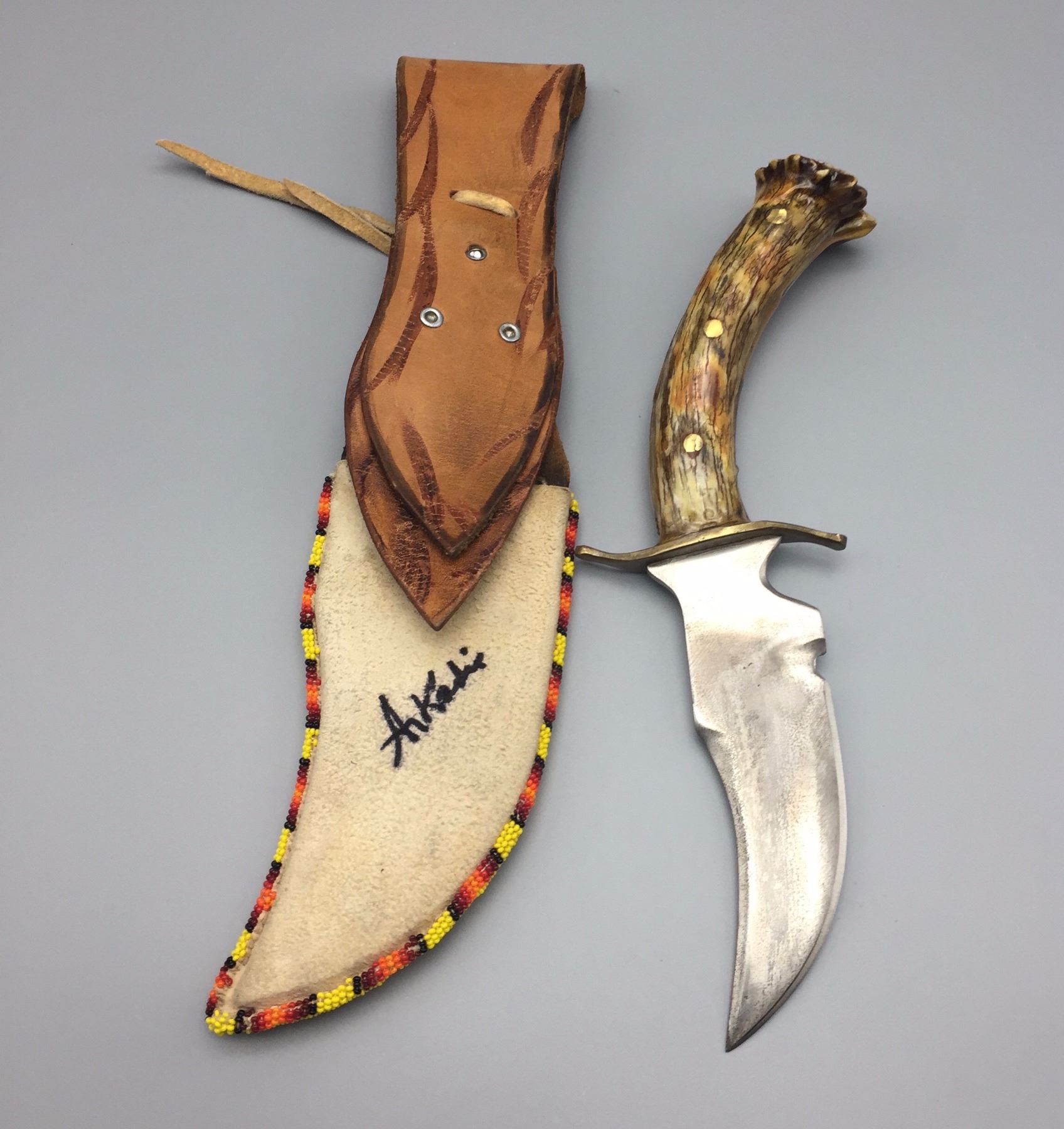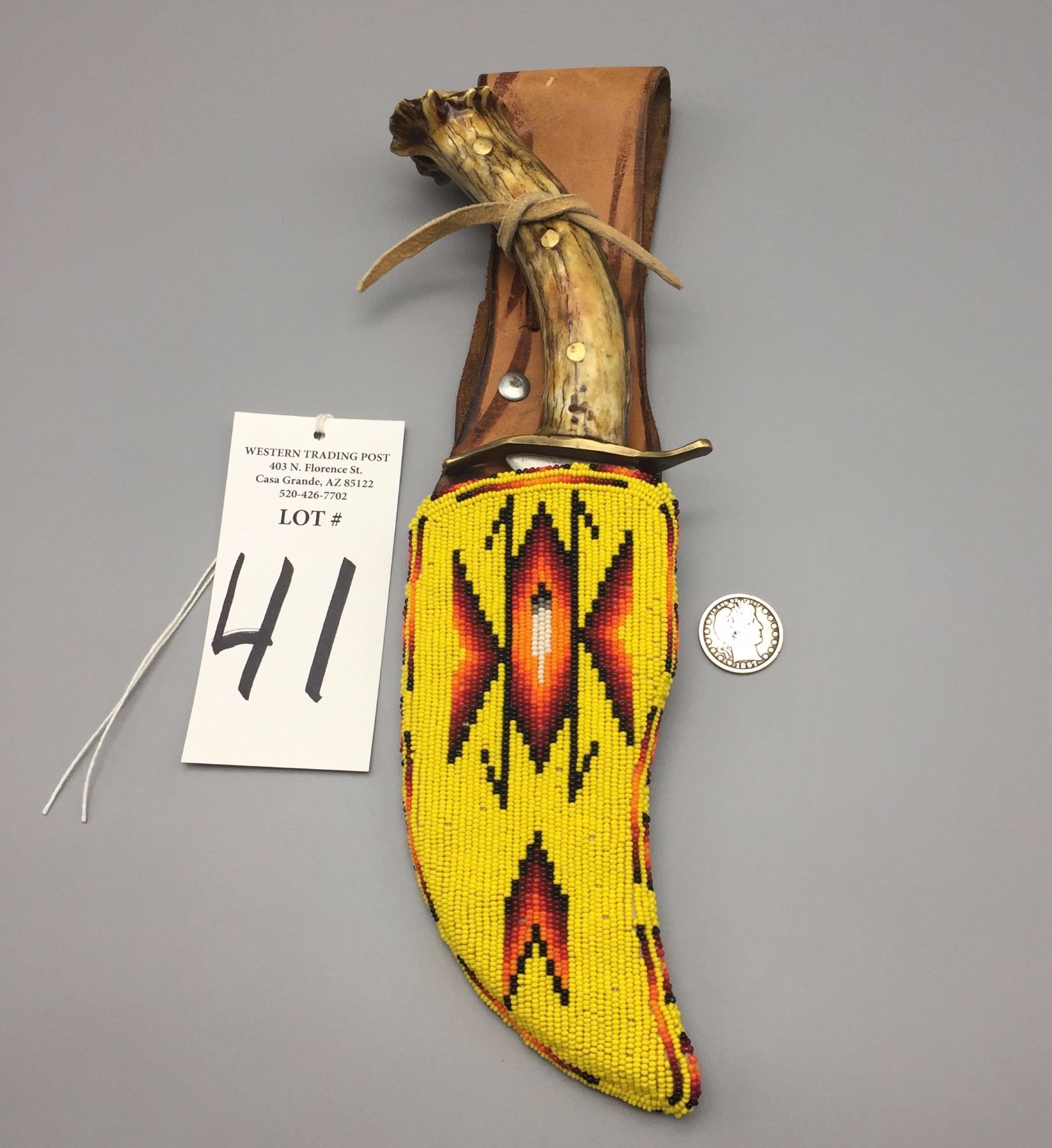 Maker: Appears to be signed, A. Kadie. (It’s Apache). Approx. Age: New. Size: Measures 3 1/2” w x 12 1/2” h overall. Additional Info: Handmade Apache beaded knife sheath with handmade knife. Condition: Good. Please look closely at the pictures - they are an important part of our description. Shipping: There will be a $5 handling / packaging fee for shipping this lot. The actual cost of postage will be added on top of that.