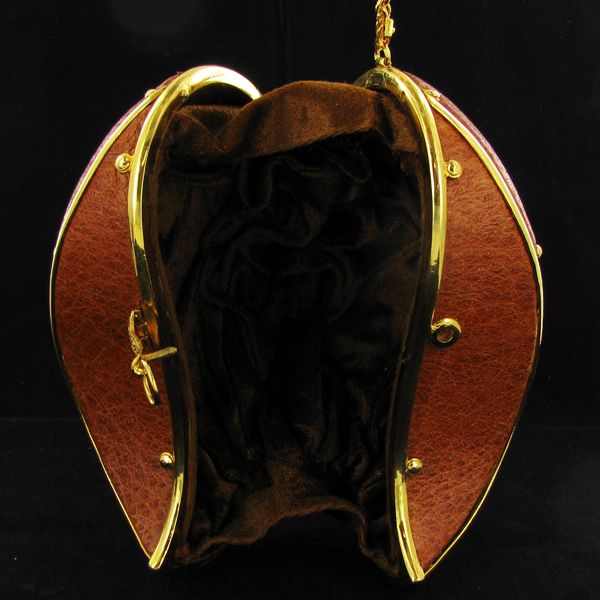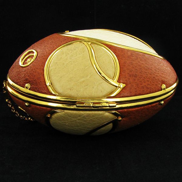 Excellent one-of-a-kind craftsmanship with gilded hardware, ostrich egg shell and ostrich skin, velvet lining, 6" wide