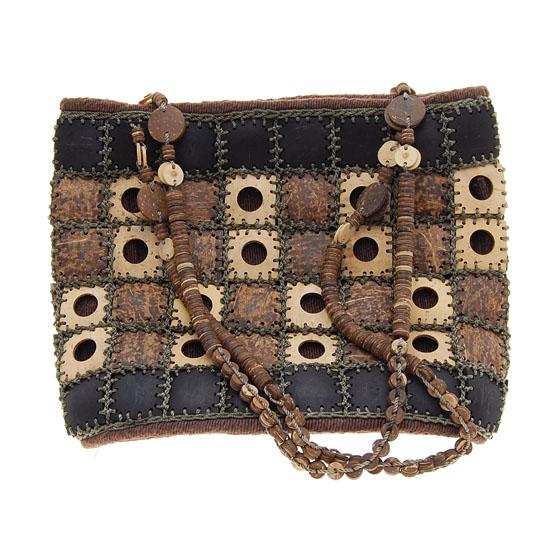 Excellent well made and hand polished coconut shell handbag; 9" x "12 bag with shoulder strap; zippered with inside side pocket; $169 retail