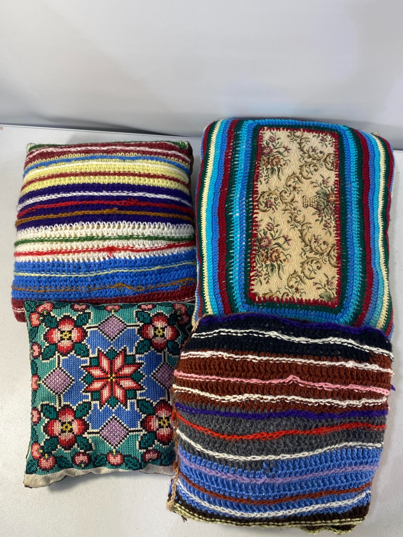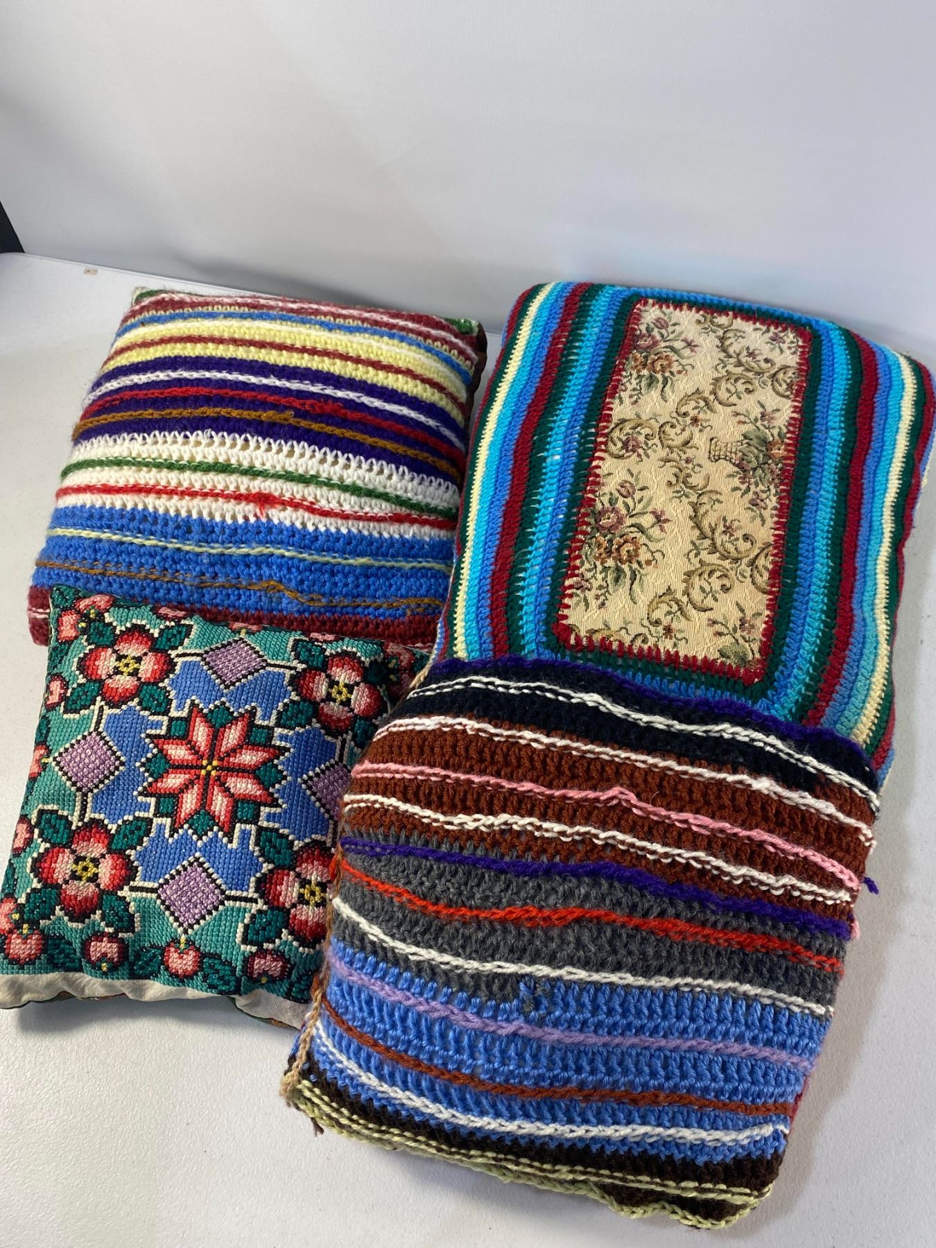 Grouping of handmade crochet and needlework cushions in various colorful designs. Approx. late 20th century. Condition: light wear.