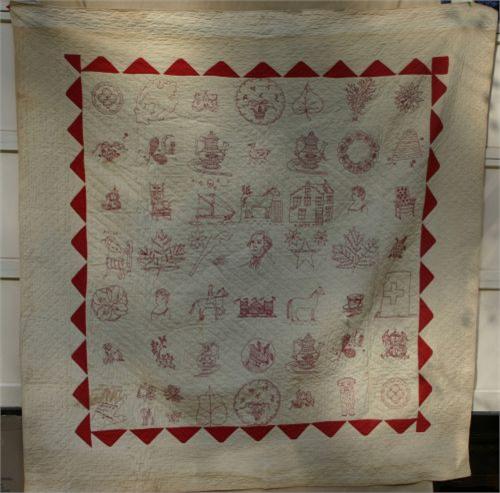 Handmade quilt with embroidered squares. Cream with red designs. Bottom left square depicts the hand of the maker and the date 1898. Some staining and wear especially along top edge There is a hole through the square with the oak leaf.. Measures approximately 68" x 72".
