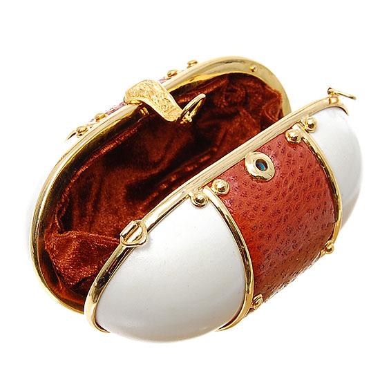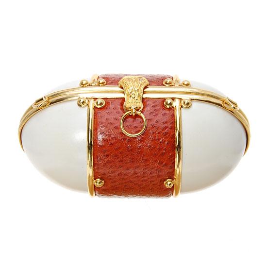 Unique clutch handbag made of carved goose egg shell. With gilded hardware and ostrich hide. Gilded shoulder chain included for evening use. Sturdy, built to last and a truly useable, collectible accoutrement. 5", $895 retail