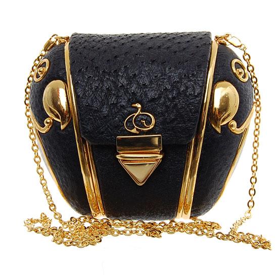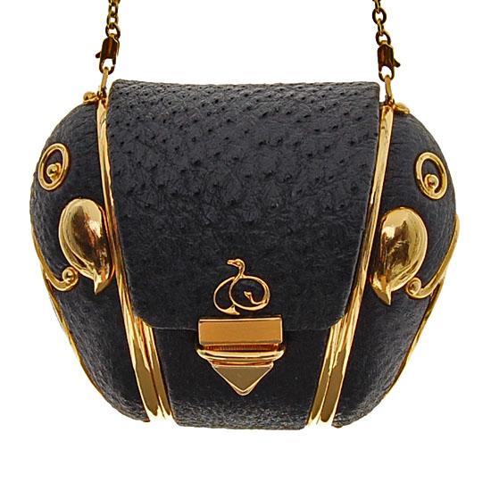 Unique clutch handbag made of carved goose egg shell. With gilded hardware and ostrich hide. Crafted in the shape of a parrot on each end. Gilded shoulder chain included for evening use. Sturdy, built to last and a truly useable, collectible accoutrement. 6", $1295 retail