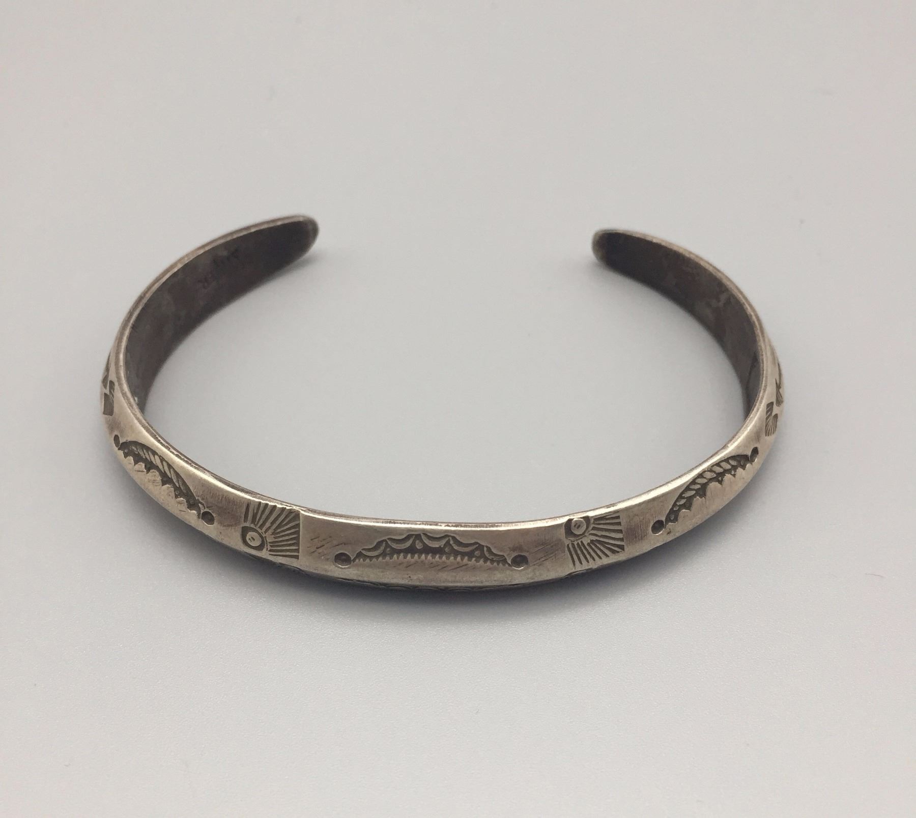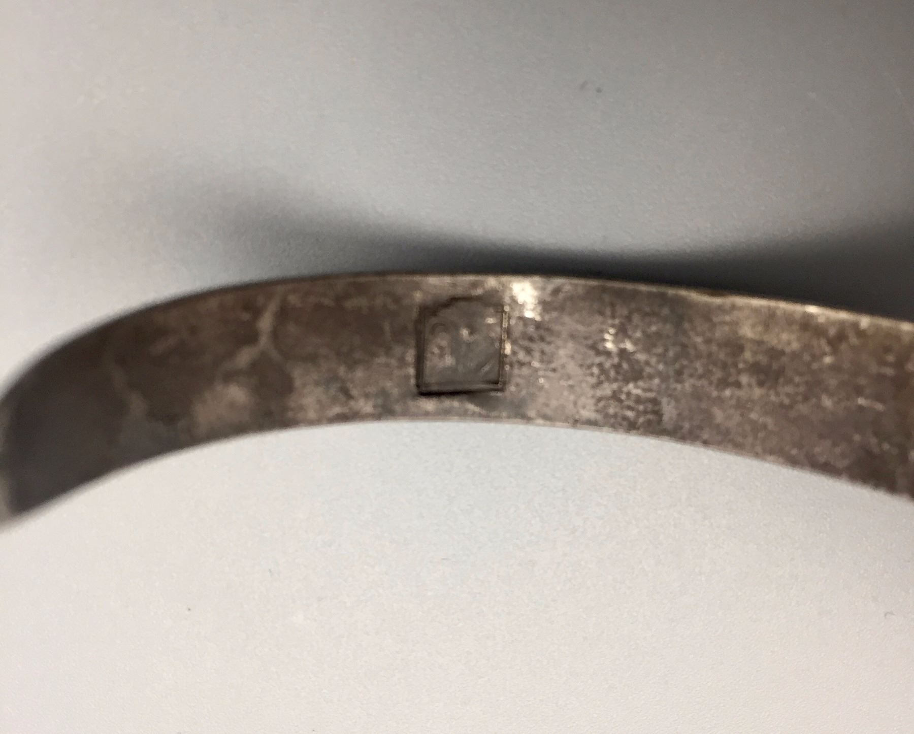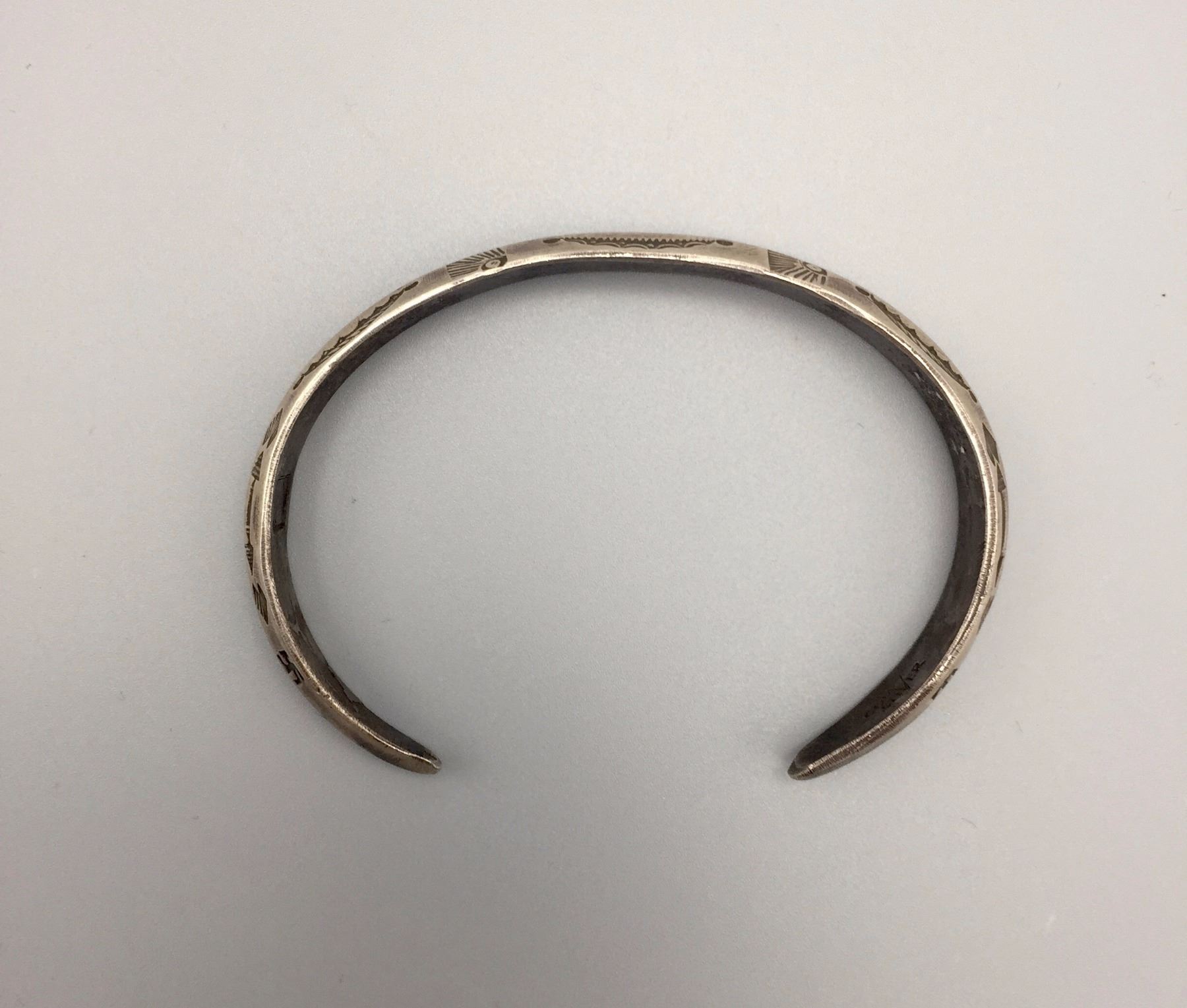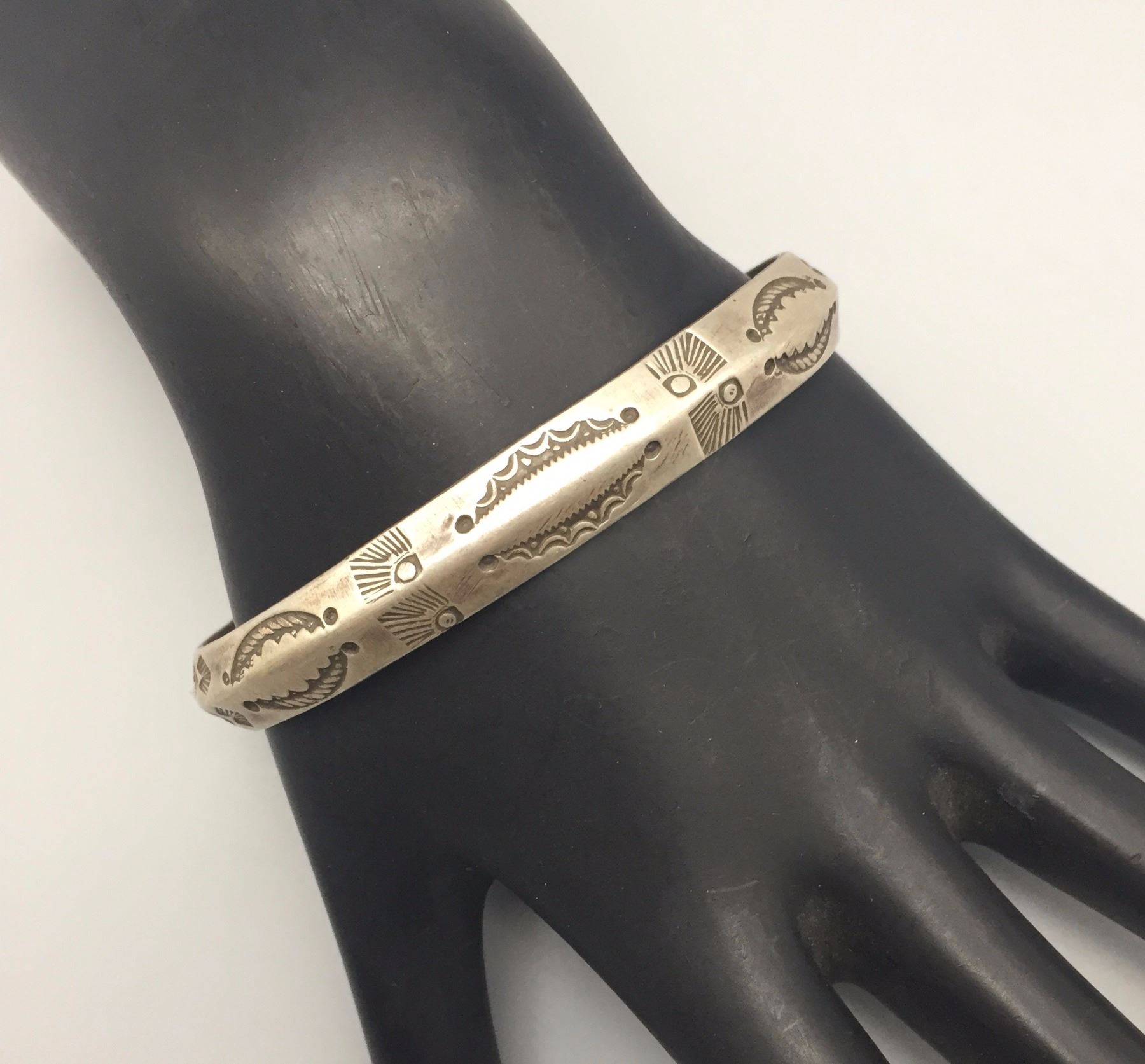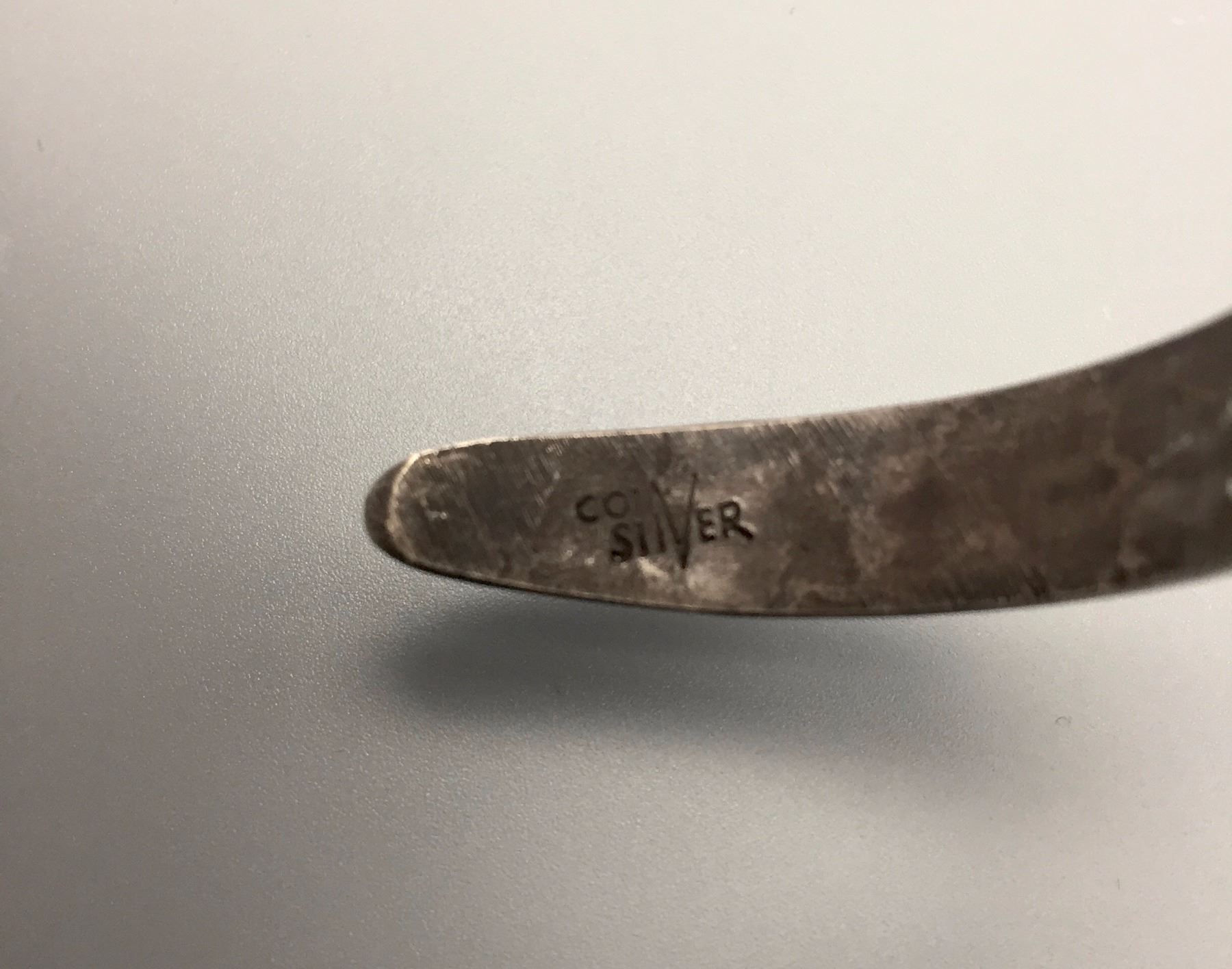 Maker: Unknown, no hallmarks evident. Approx. Age: Fairly modern, but retro style. Size: Inside circumference measures 5 3/4” with an additional 1 1/4” opening (making it fit an approx. 7” wrist), 3/8” w and weighs 31.5 g. Additional Info: Handmade, hammered, coin silver ingot bracelet. Condition: Good, normal wear expected. Please look closely at the pictures - they are an important part of our description. Shipping: There will be a $5 handling / packaging fee for shipping this lot. The actual cost of postage will be added on top of that.