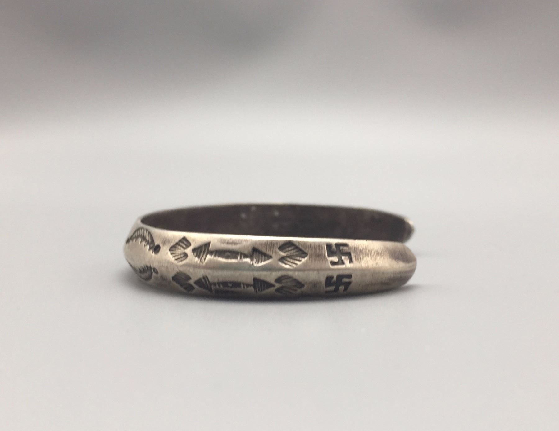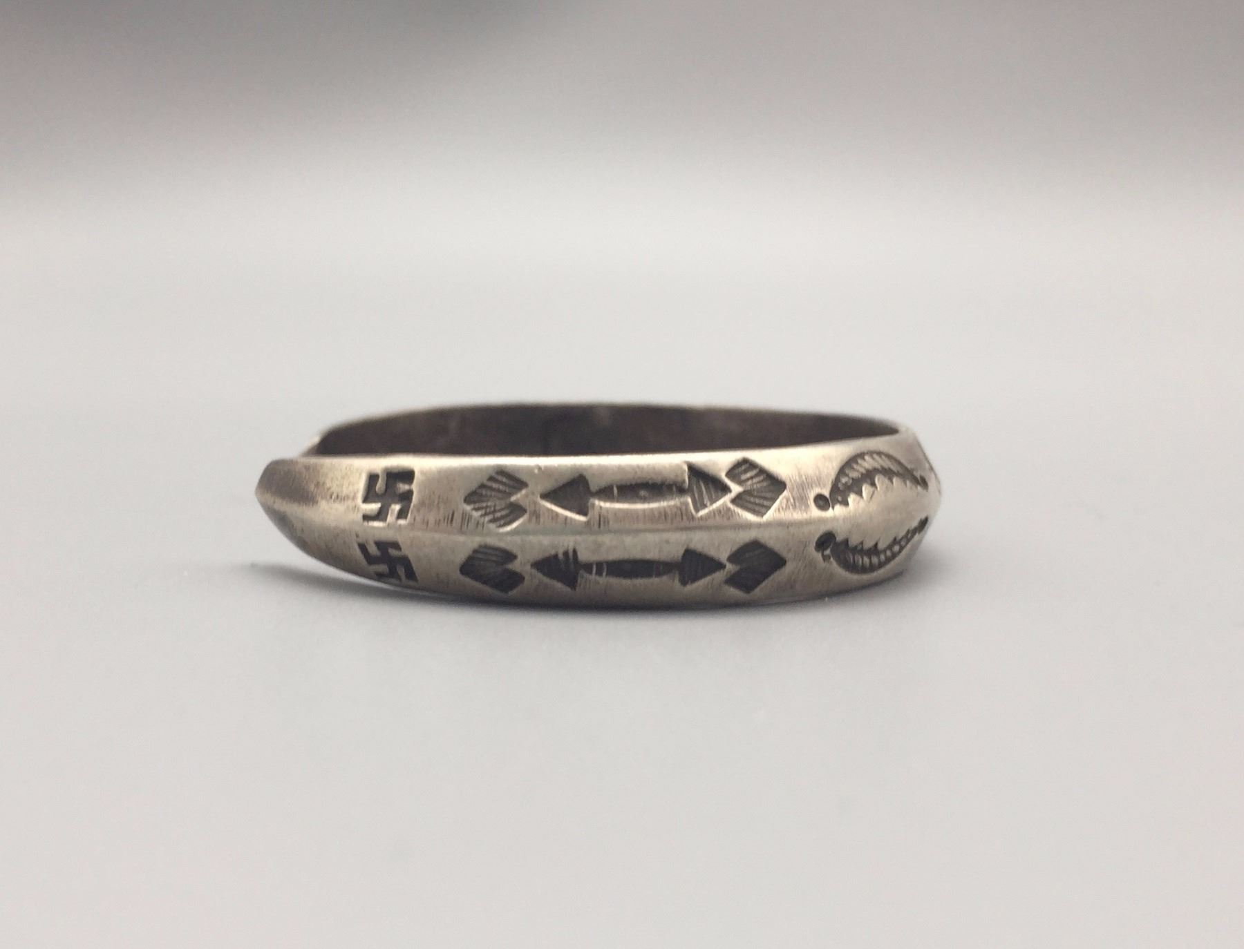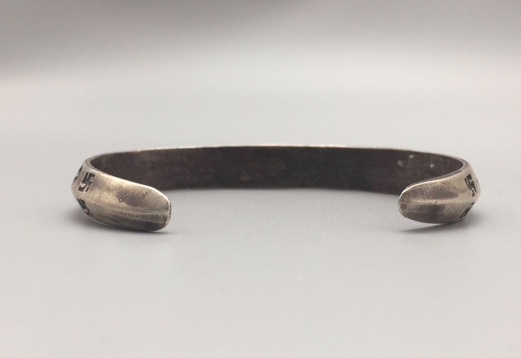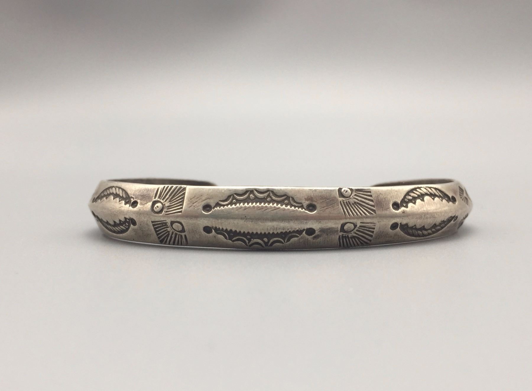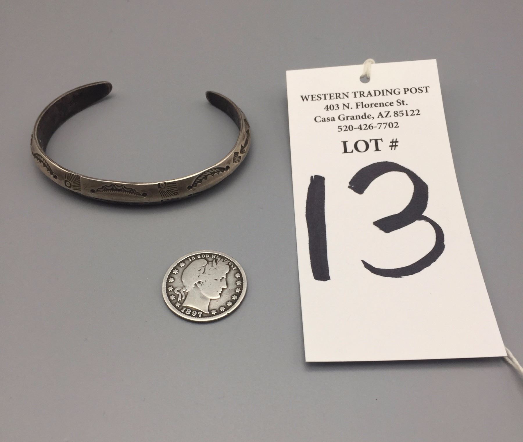 Maker: Unknown, no hallmarks evident. Approx. Age: Fairly modern, but retro style. Size: Inside circumference measures 5 3/4” with an additional 1 1/4” opening (making it fit an approx. 7” wrist), 3/8” w and weighs 31.5 g. Additional Info: Handmade, hammered, coin silver ingot bracelet. Condition: Good, normal wear expected. Please look closely at the pictures - they are an important part of our description. Shipping: There will be a $5 handling / packaging fee for shipping this lot. The actual cost of postage will be added on top of that.