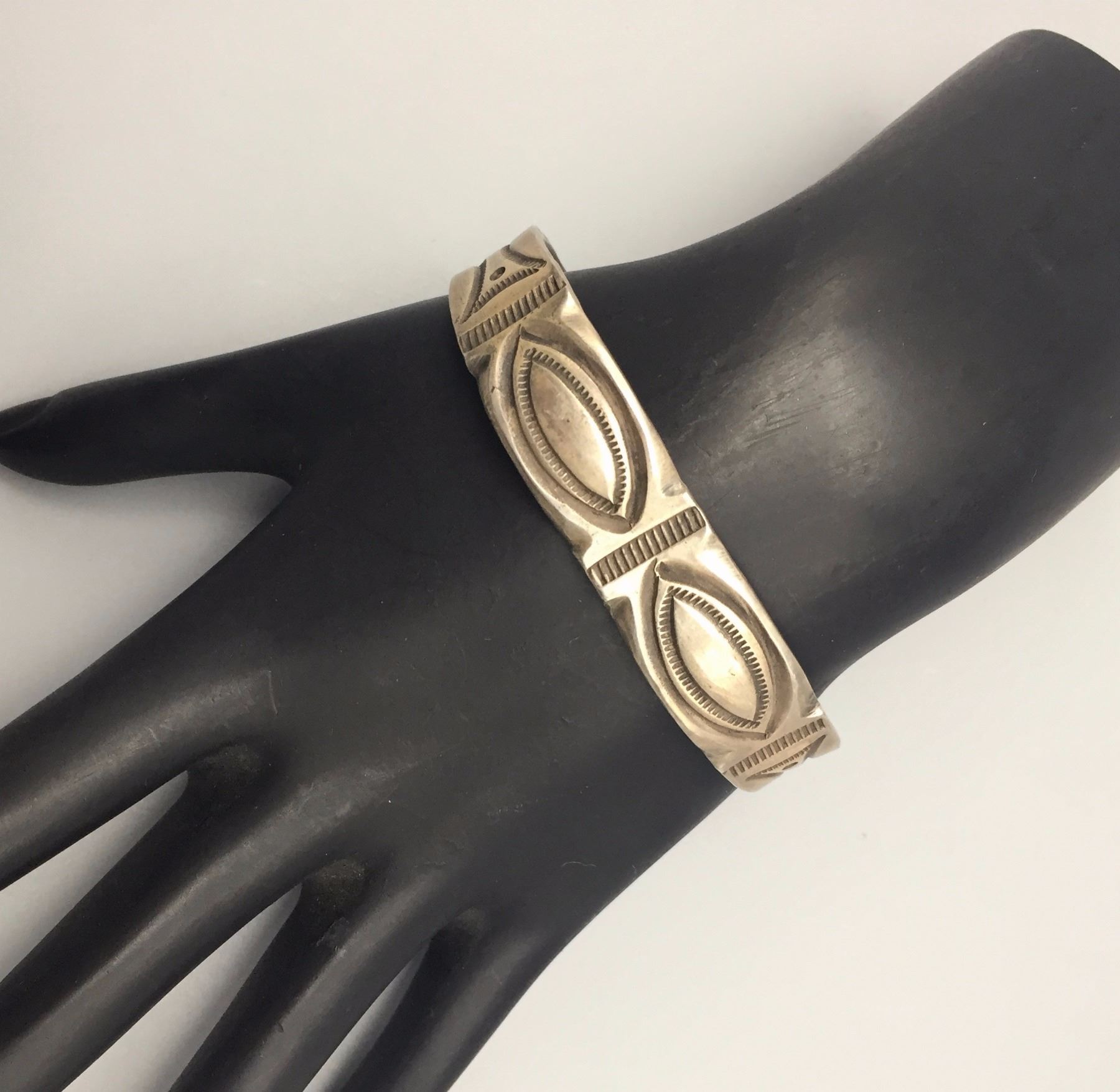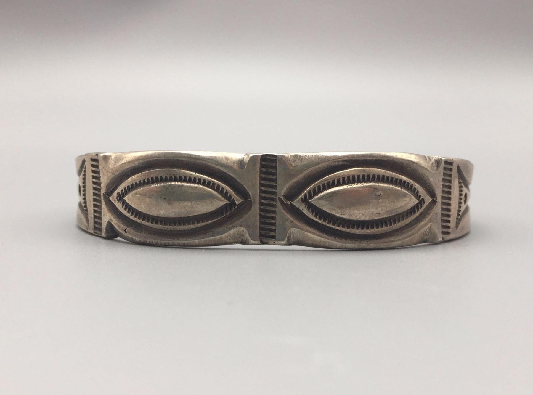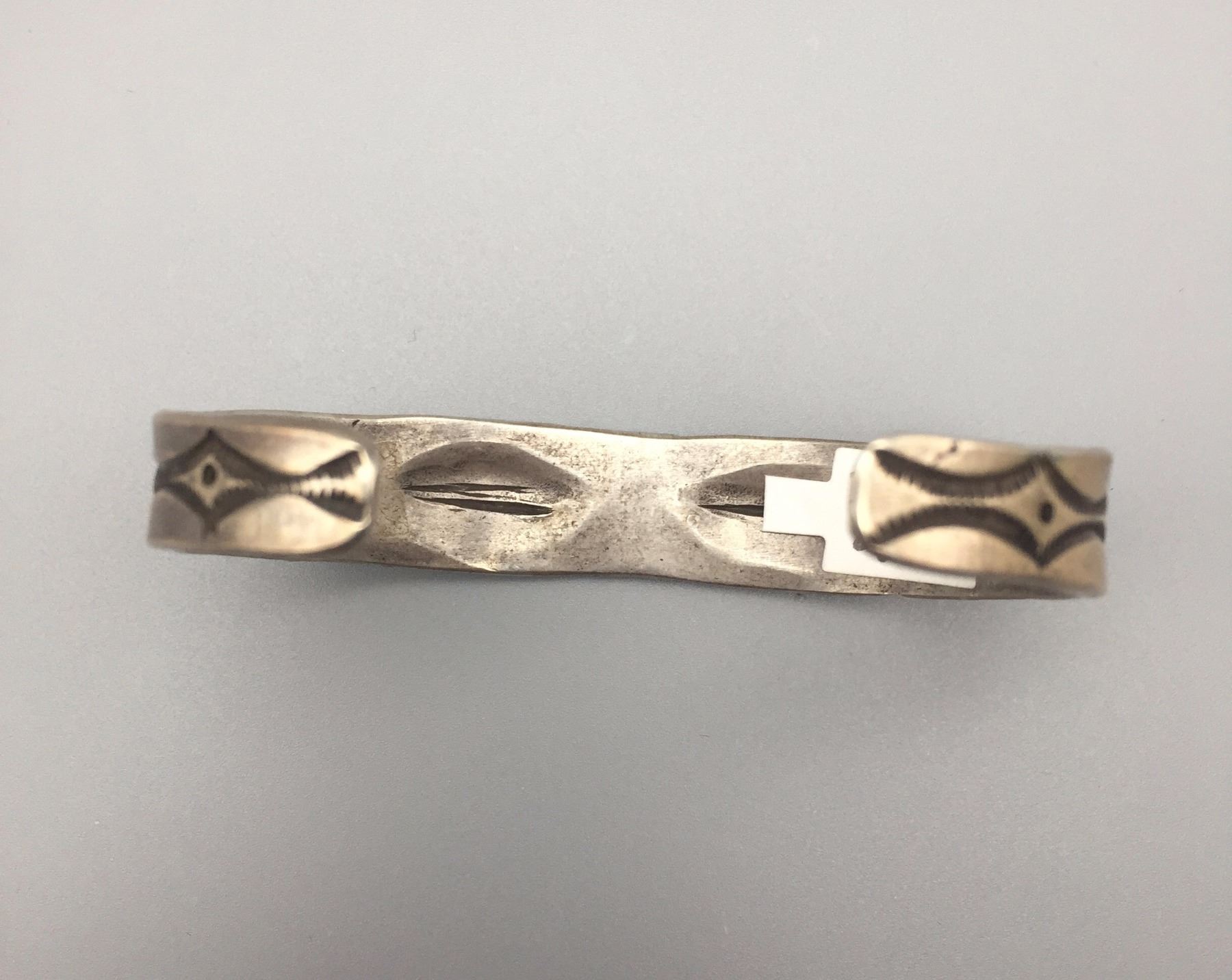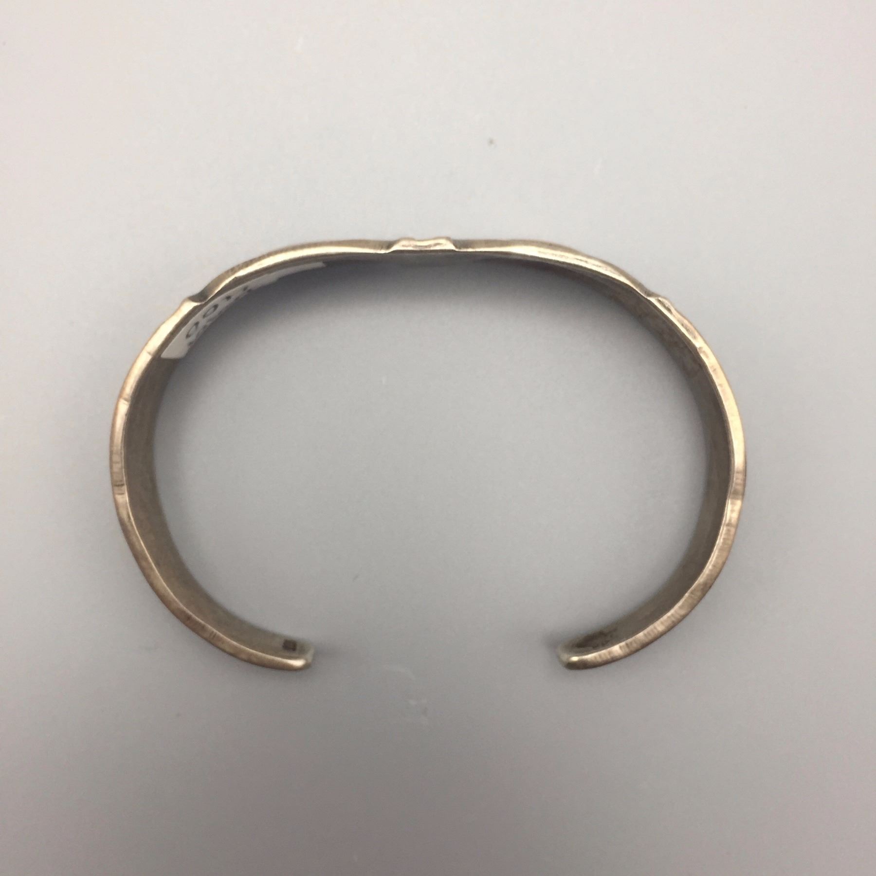 Maker: Unknown, no hallmarks evident. Approx. Age: Fairly modern, but retro style. Size: Inside circumference measures 5 5/8” with an additional 1” opening (making it fit an approx. 6 5/8” wrist), 1/2” w and weighs 27.9 g. Additional Info: Handmade hammered coin silver ingot bracelet. Condition: Good, normal wear expected. Please look closely at the pictures - they are an important part of our description. Shipping: There will be a $5 handling / packaging fee for shipping this lot. The actual cost of postage will be added on top of that.