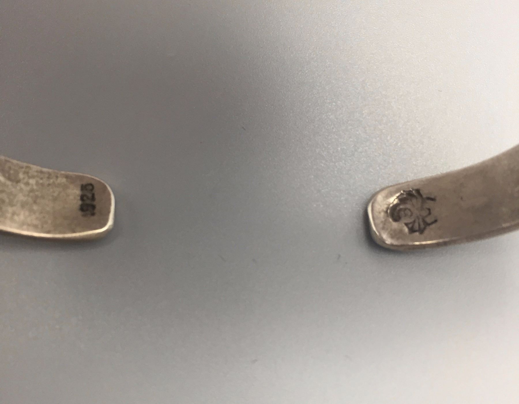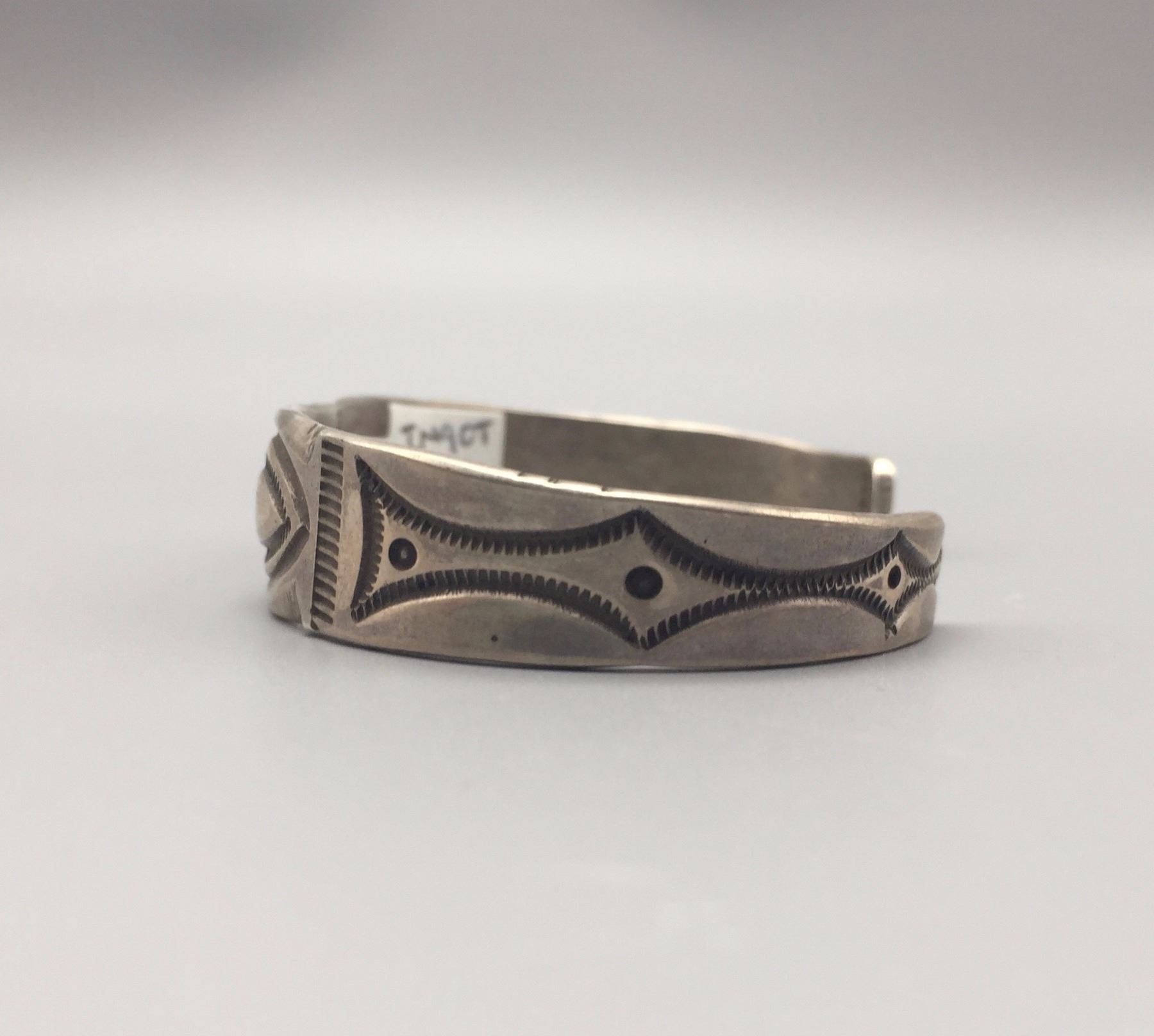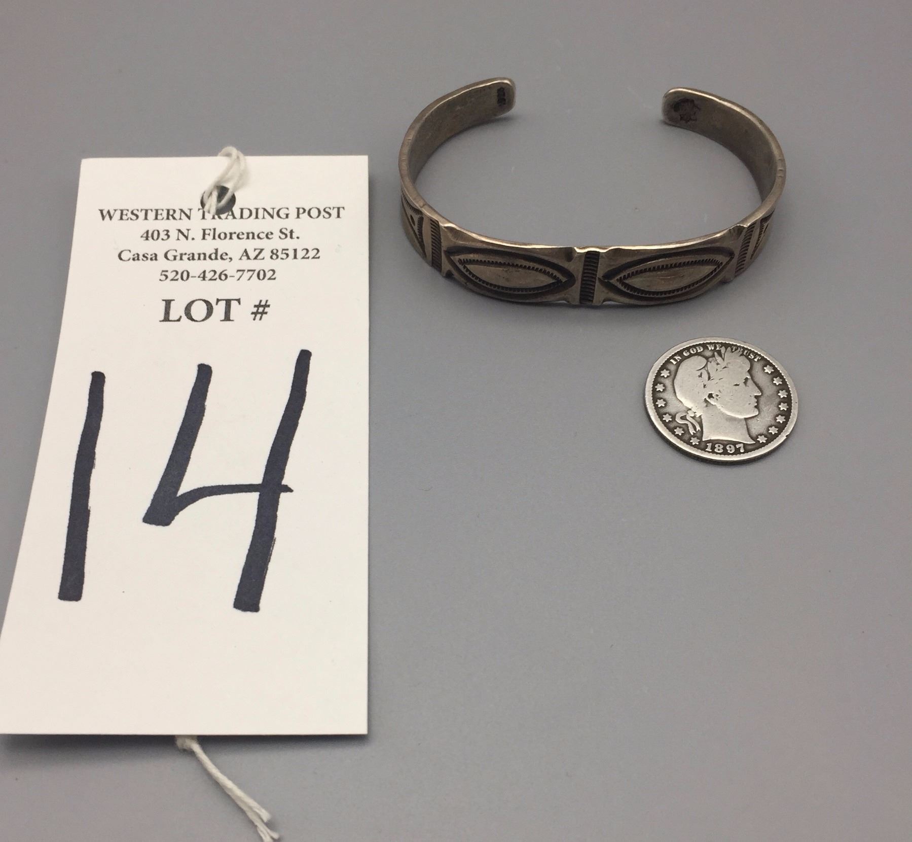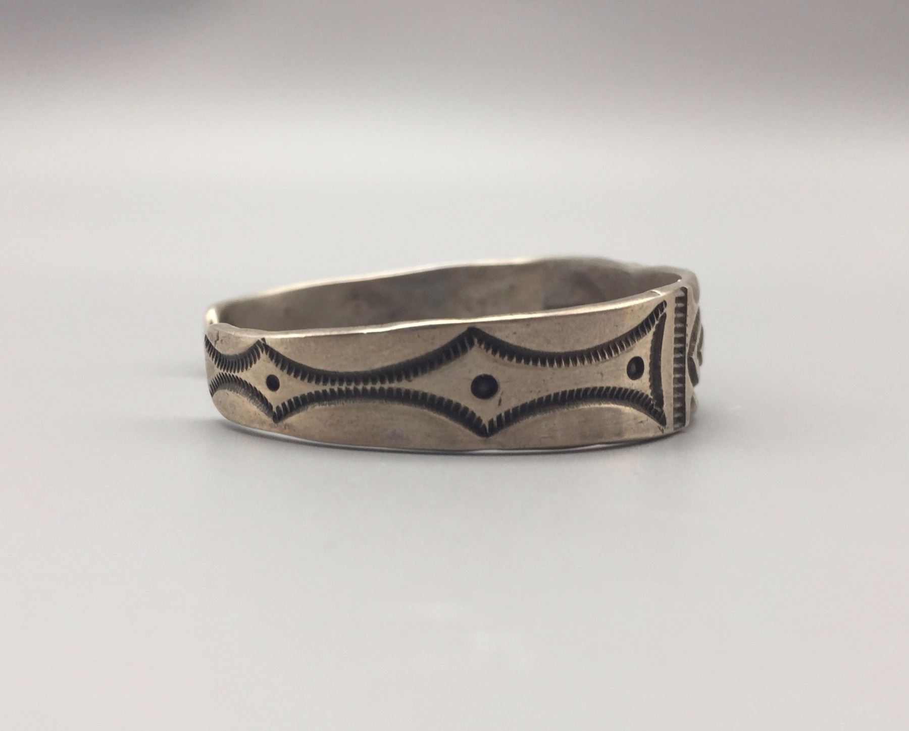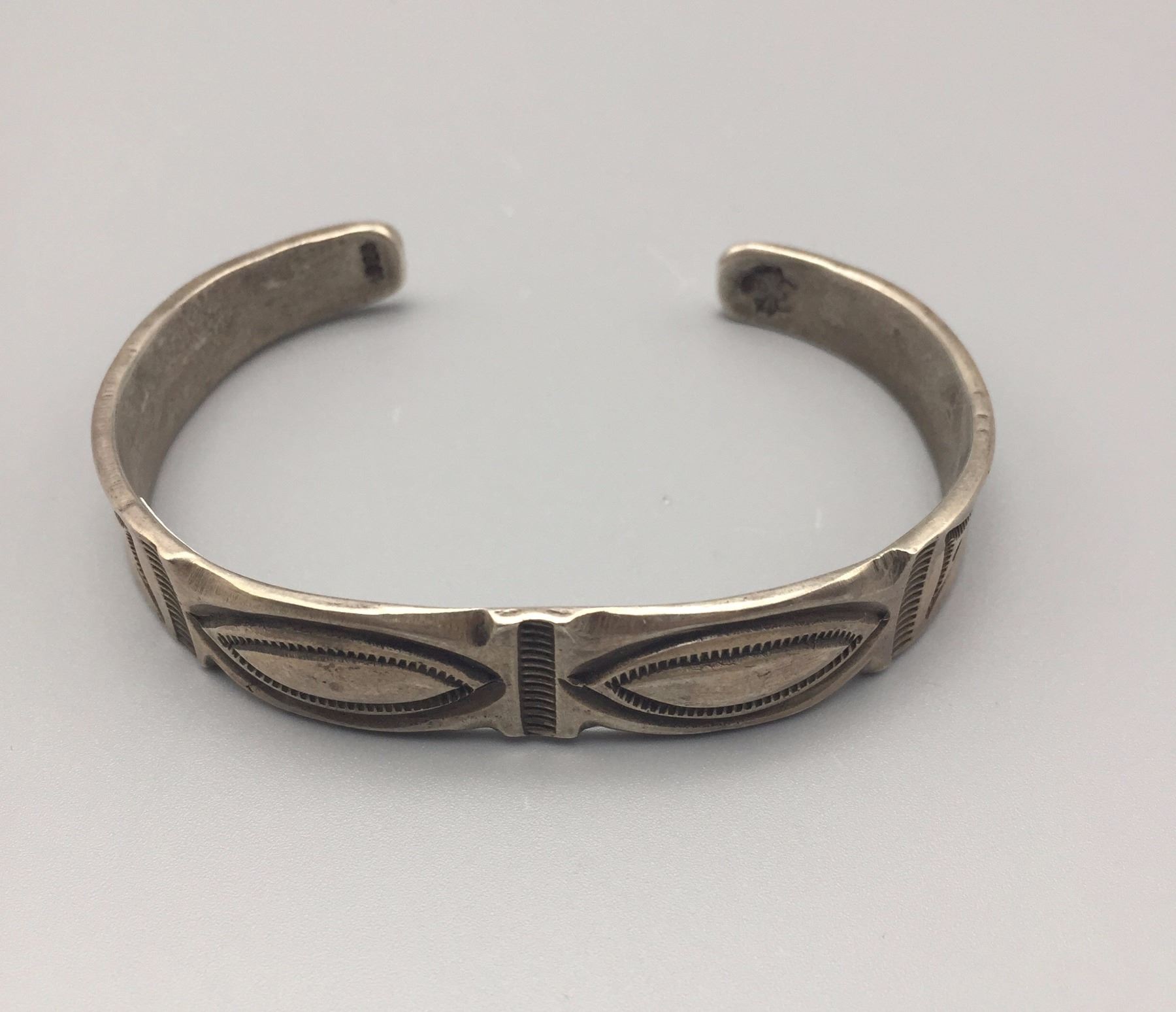 Maker: Unknown, no hallmarks evident. Approx. Age: Fairly modern, but retro style. Size: Inside circumference measures 5 5/8” with an additional 1” opening (making it fit an approx. 6 5/8” wrist), 1/2” w and weighs 27.9 g. Additional Info: Handmade hammered coin silver ingot bracelet. Condition: Good, normal wear expected. Please look closely at the pictures - they are an important part of our description. Shipping: There will be a $5 handling / packaging fee for shipping this lot. The actual cost of postage will be added on top of that.