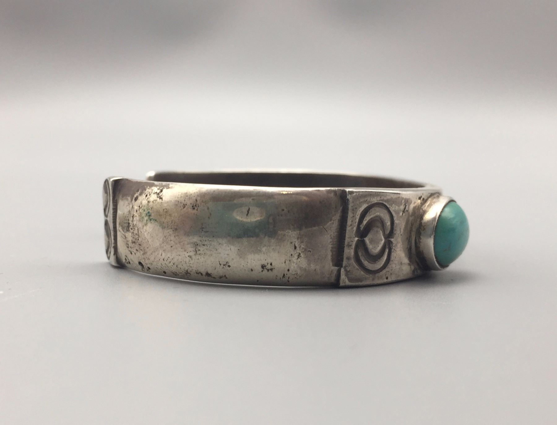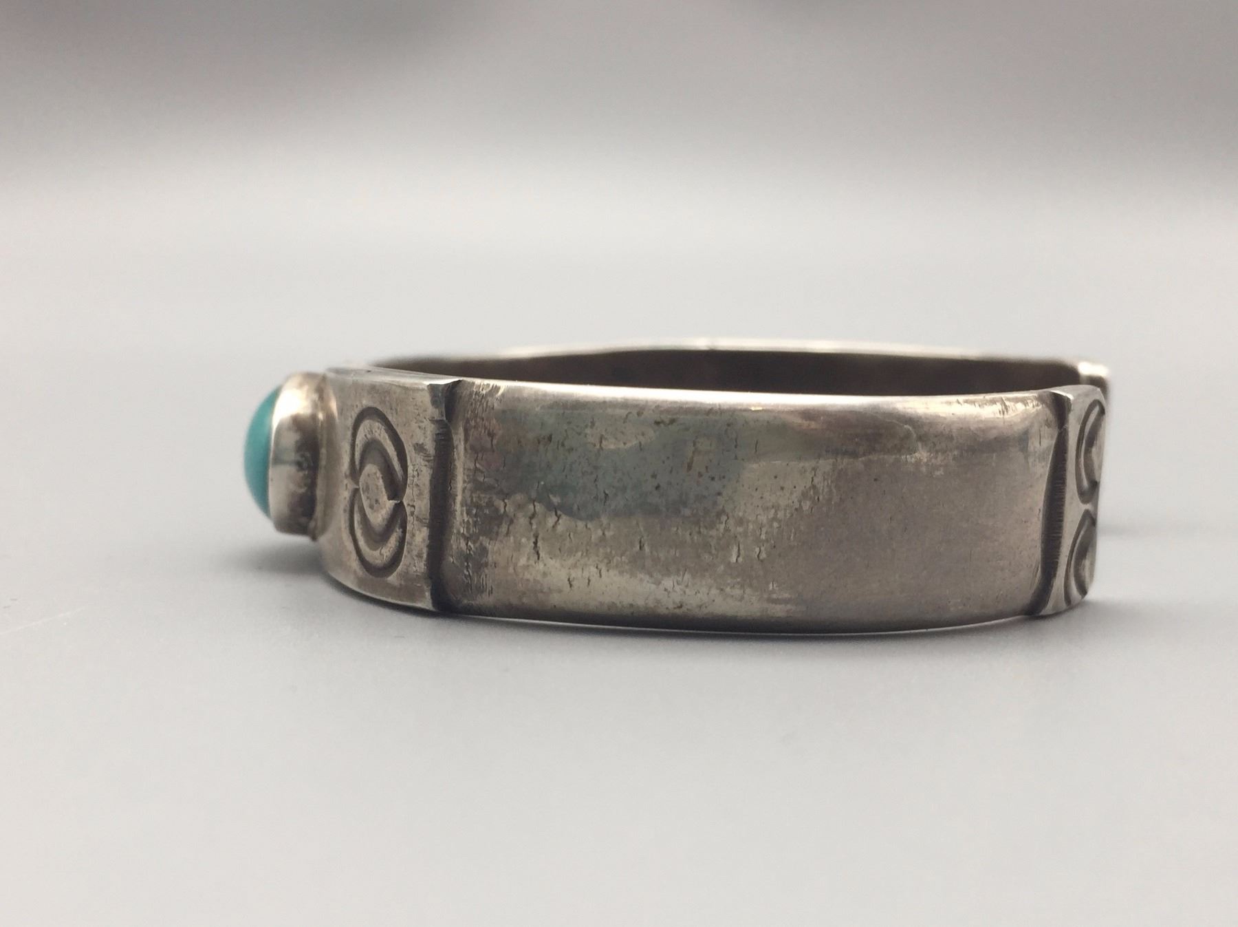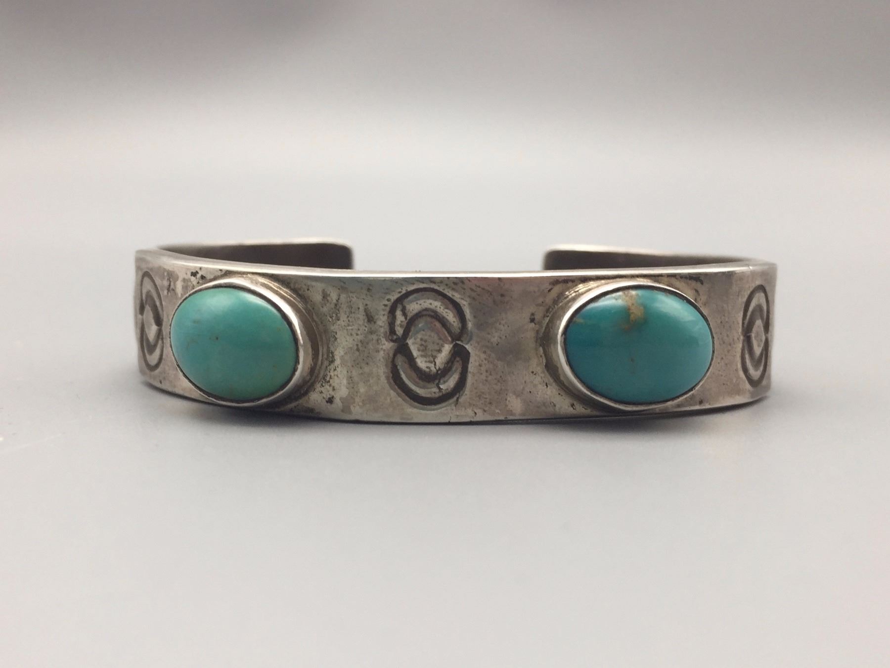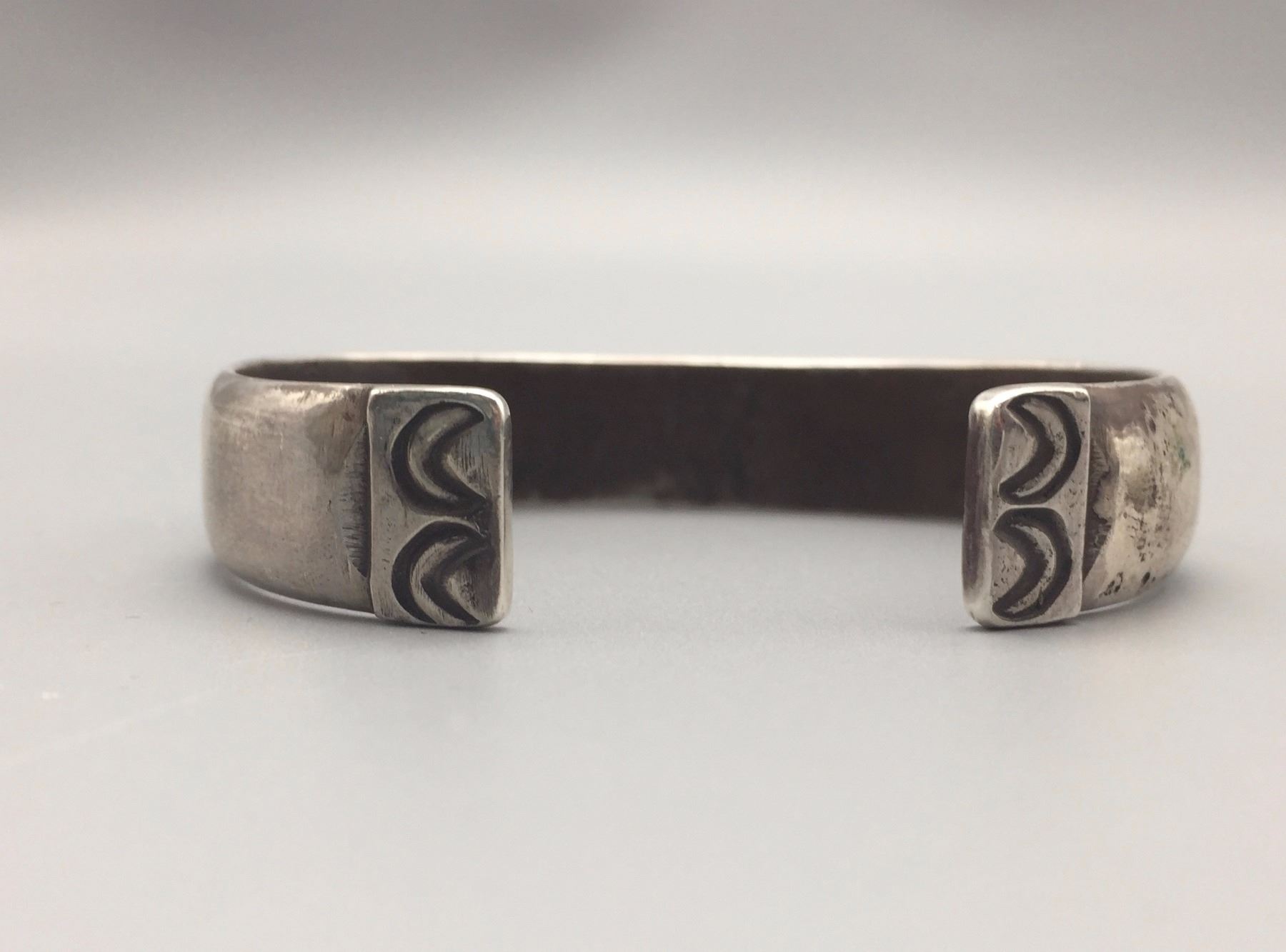 Maker: Unknown, no hallmarks evident. Approx. Age: Fairly modern, but retro style. Size: Inside circumference measures 5 7/8” with an additional 1” opening (making it fit an approx. 6 5/8” wrist), 1/2” w and weighs 54.2 g. Additional Info: Handmade hammered coin silver ingot bracelet. Condition: Good, normal wear expected. Please look closely at the pictures - they are an important part of our description. Shipping: There will be a $5 handling / packaging fee for shipping this lot. The actual cost of postage will be added on top of that.