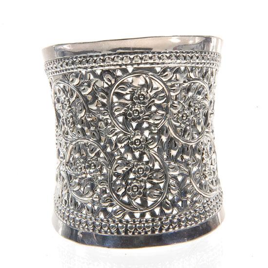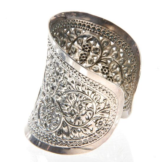 Beautiful handmade Nomadic Hilltribe expandable cuff bracelet; sterling silver; 71 grams 3"; floral vine design