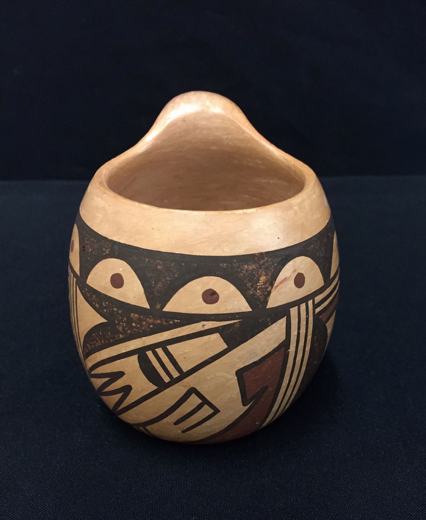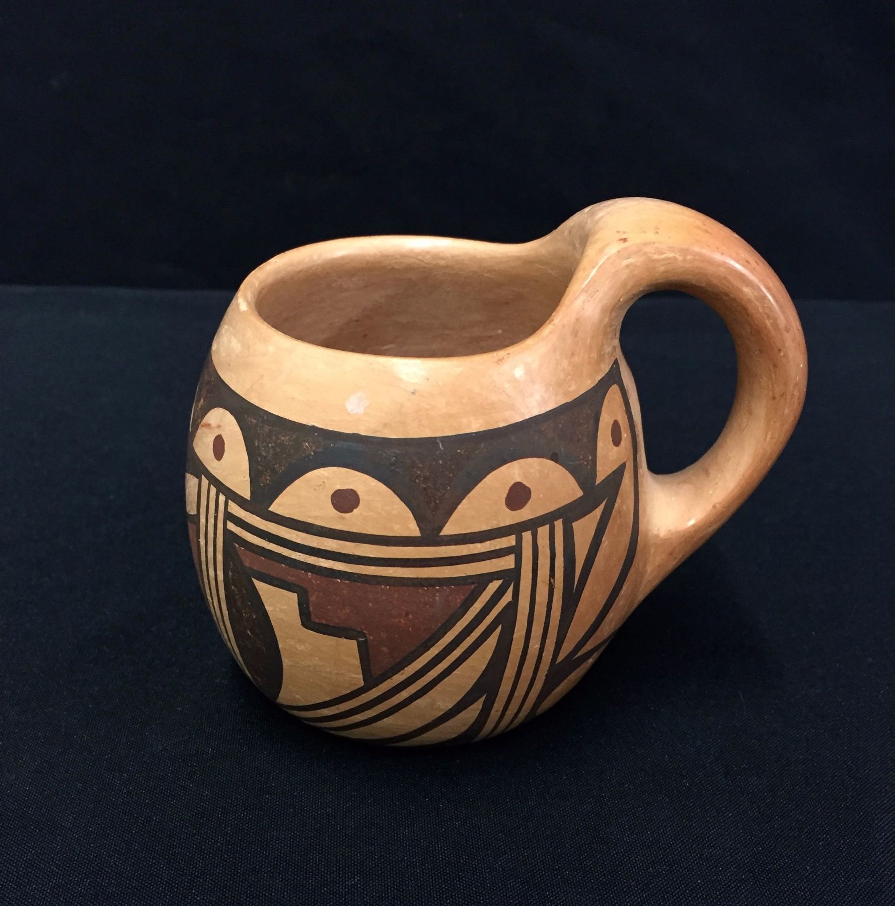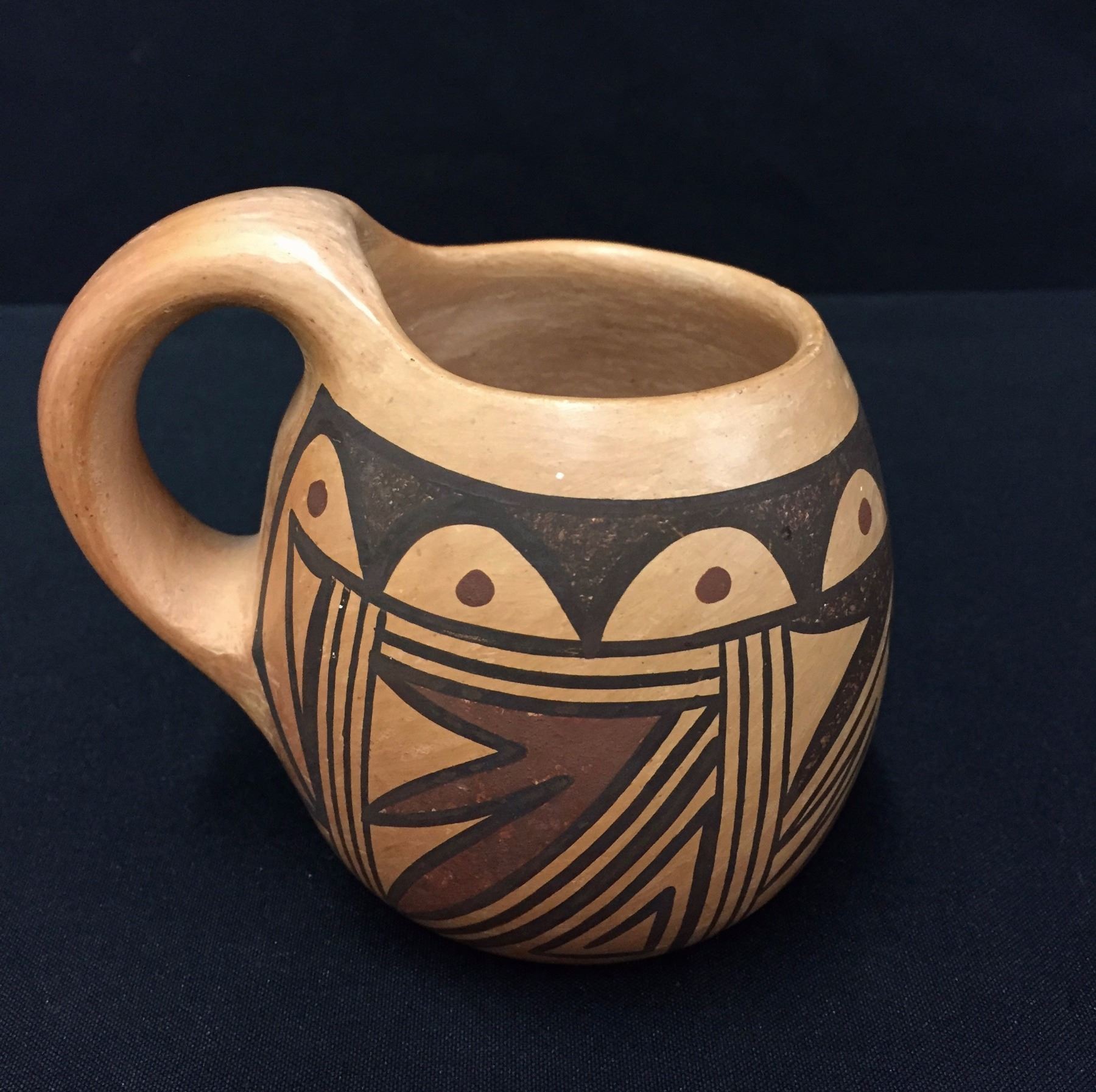 Maker: Karen Namoki, Hopi. Approx. Age: Vintage. Size: Approx. 4 1/2” at it’s widest point and 4” tall. Condition: Good. Additional Info: Handmade Hand-painted Hopi Pottery Cup. Please look closely at the pictures - they are an important part of our description. Shipping: There will be a $7 handling / packaging fee for shipping this lot. The actual cost of postage will be added on top of that.