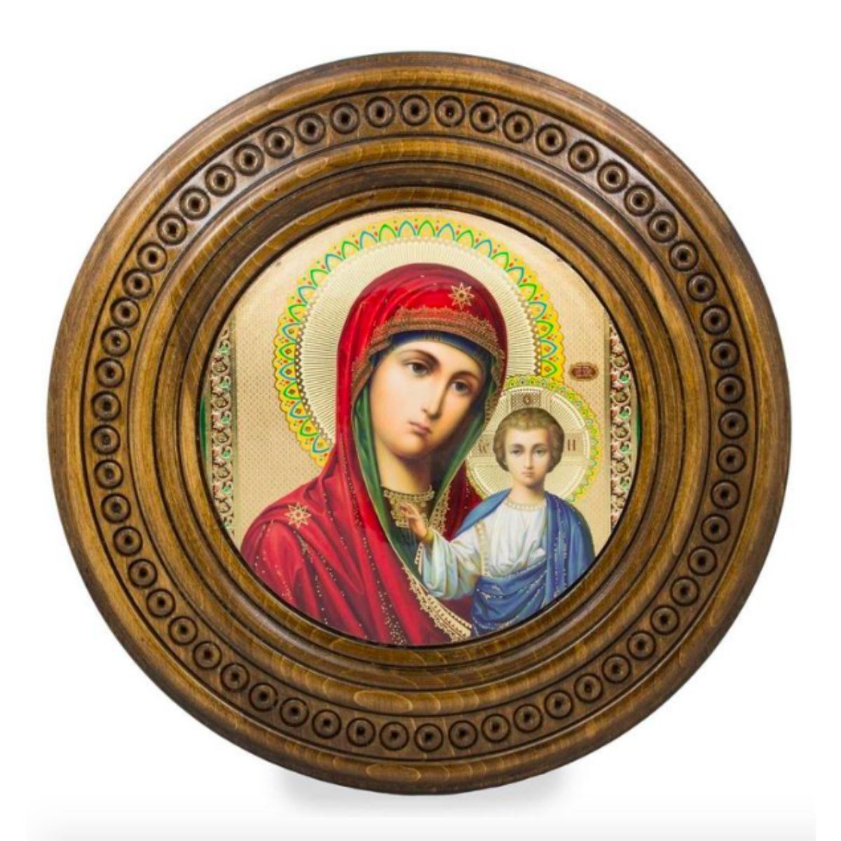Hand-carved Ukrainian icon, round wooden wall plaque, depicting the Virgin Mary with a young Jesus. Decoupage print with gold accents applied to hand-carved in Ukraine from Linden tree wood frame. 10" D.