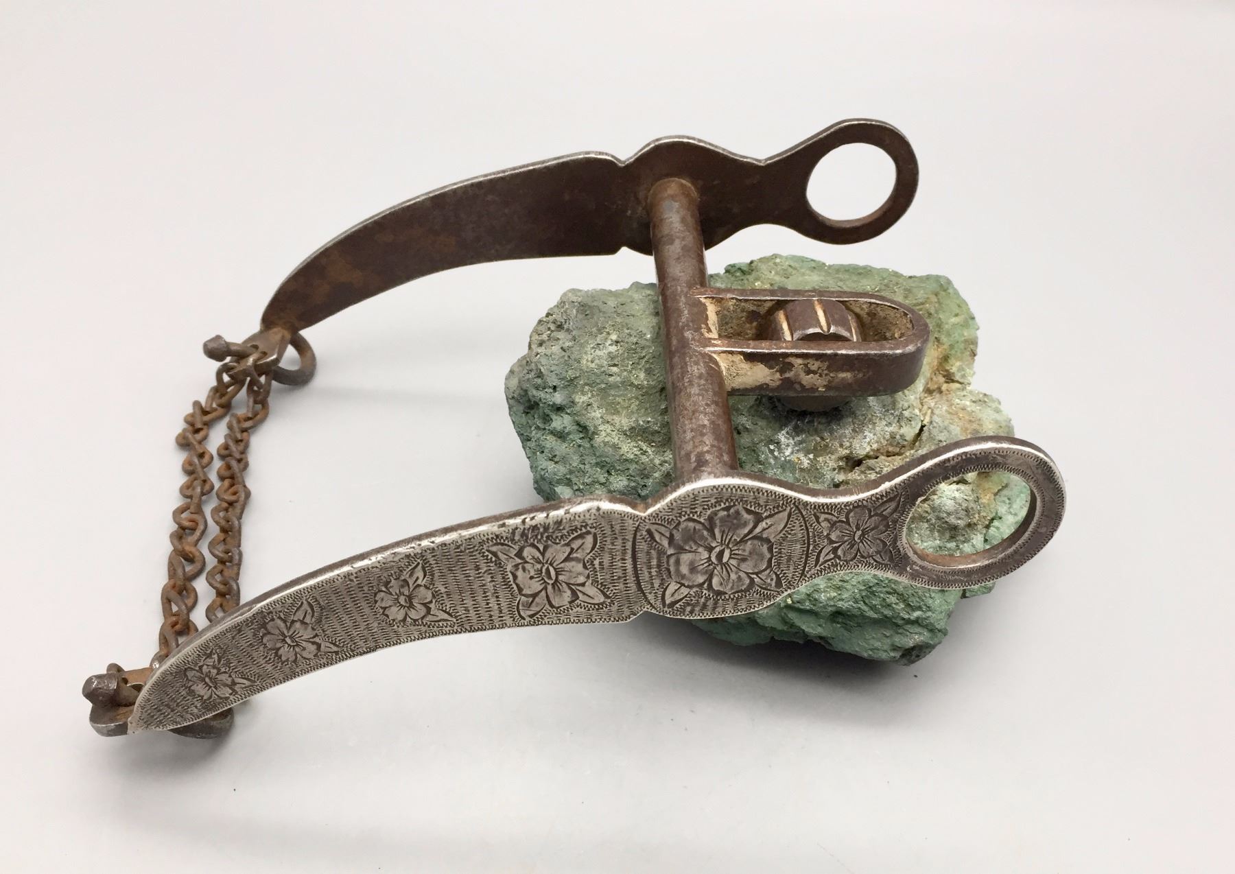 Description: Handmade prison bit with overlay and hand-stamped details. Maker: Unknown prisoner. Approx. Age: Vintage. Size: It has a 4 7/8” mouthpiece and is 7 5/8” long overall. Condition: Good for its age, some wear expected. Please look closely at the pictures - they are an important part of our description. Shipping: There will be a $5 handling / packaging fee for shipping this lot. The actual cost of postage will be added on top of that.
