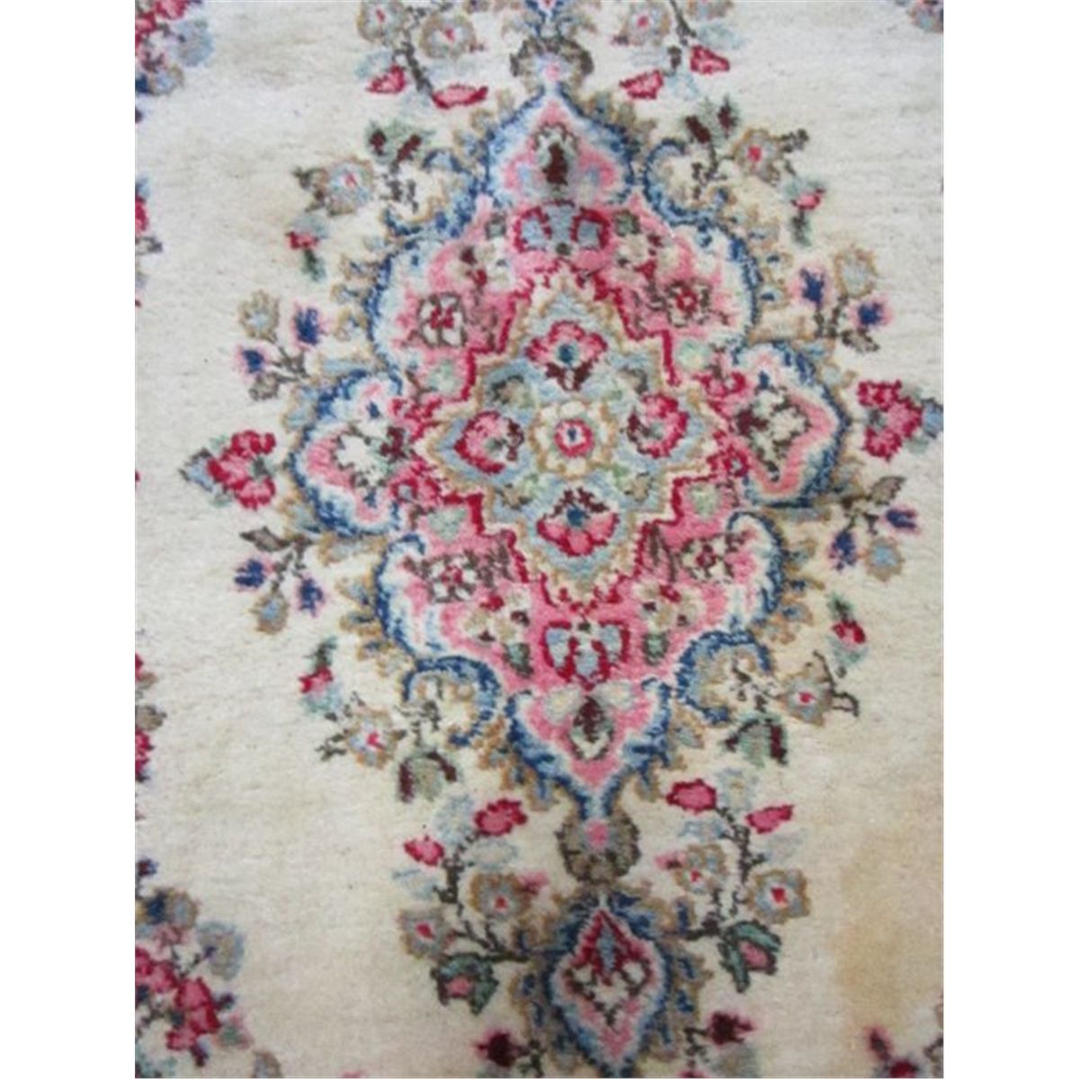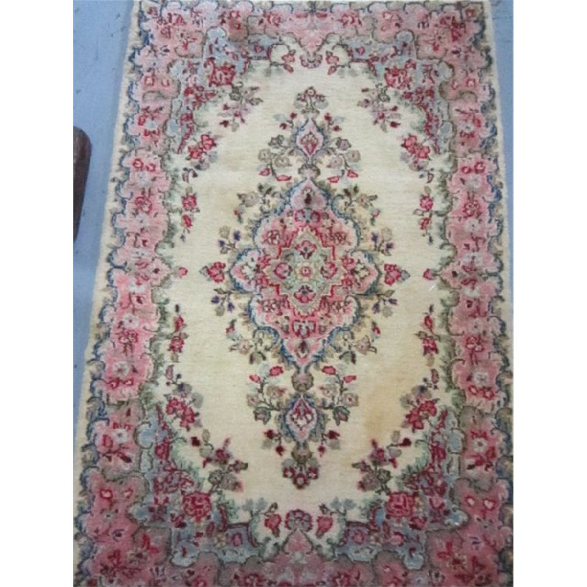 With pink, red & blue design on ivory background. Has stain. Approx. 3' x 4'. Please read our terms of sale.