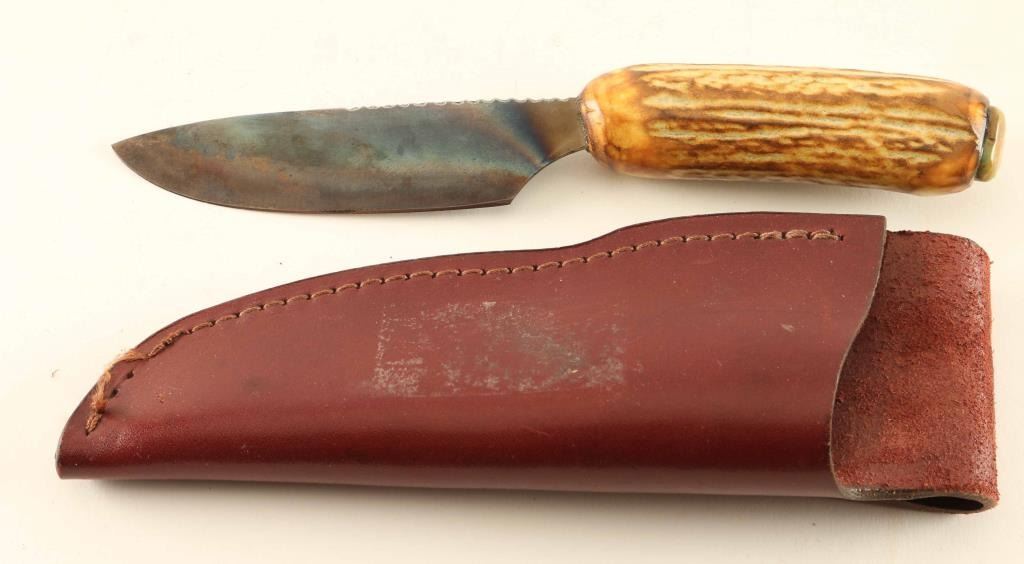 Made in Idaho, marked 'G' on 4" steel blade with serrated edge. Antler handle with green stone on the end. Measures 8 1/4" overall and comes in a leather sheath that shows use.