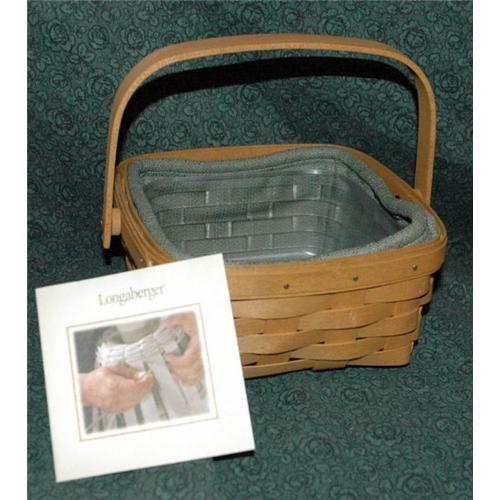 Handmade signed & dated Longaberger Basket with liners. It has a hard clear plastic liner and a nice fitted fabric liner. Both liners are original. It also has the Longaberer informational leaflet that came with it. <p> It measures 7.5" squared and is 3.5" deep. The handle makes it 7.5" high. <p> The bottom is signed with what looks like SAK 2001. Then it has a Longaberger stamp. <P> This basket is in excellent condition and does not looks as if has ever been used. <p> The heirloom Longaberer basket are highly collectible and skillfully hand made to last forever it taken care of properly.